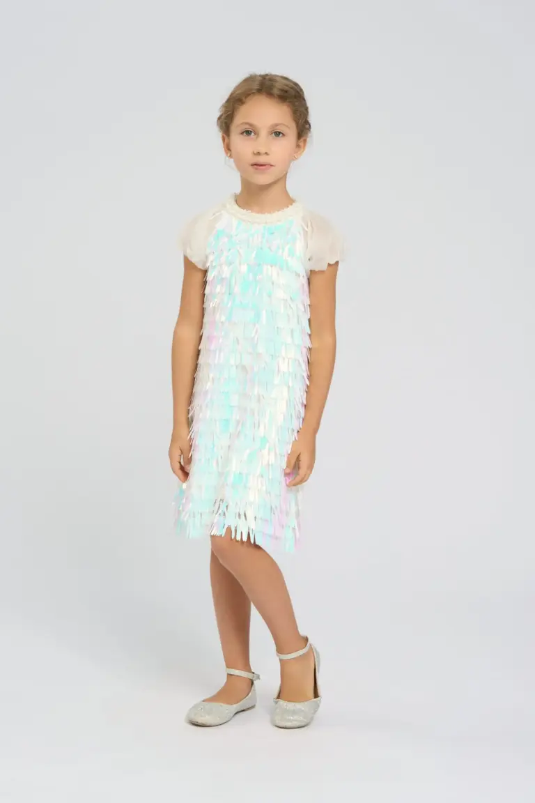 Модная и невероятно эффектная модель нарядного платья для девочки - лучшее решение для утренника или торжества! Платье с круглым вырезом горловины выглядит стильно и оригинально. Основная ... часть модели выполнена из легкой ткани, которая приятно струится при движении. Многоярусный декор из крупных пайеток с жемчужным отливом придает наряду эффектность, создает объем и динамичность. Короткие рукава подчеркивают нежность детского образа. Застежка сзади на пуговицы обеспечивает легкость в надевании платья. Особое внимание в дизайне модели уделено богатой отделке горловины. Платье идеально подходит для праздников, дней рождения или других торжественных мероприятий.