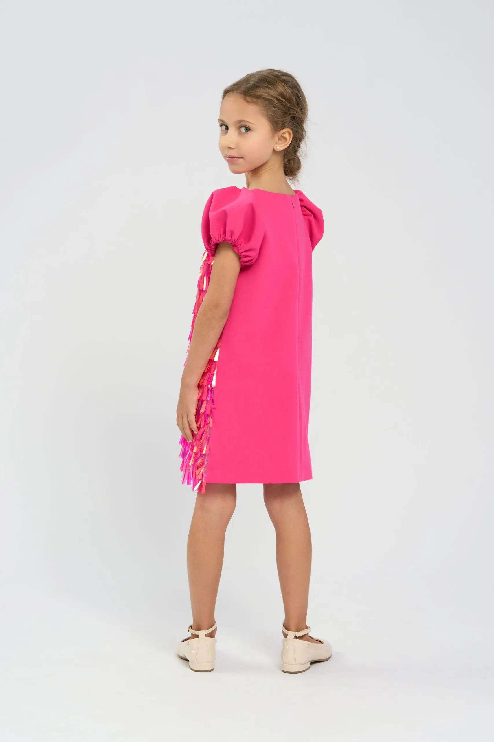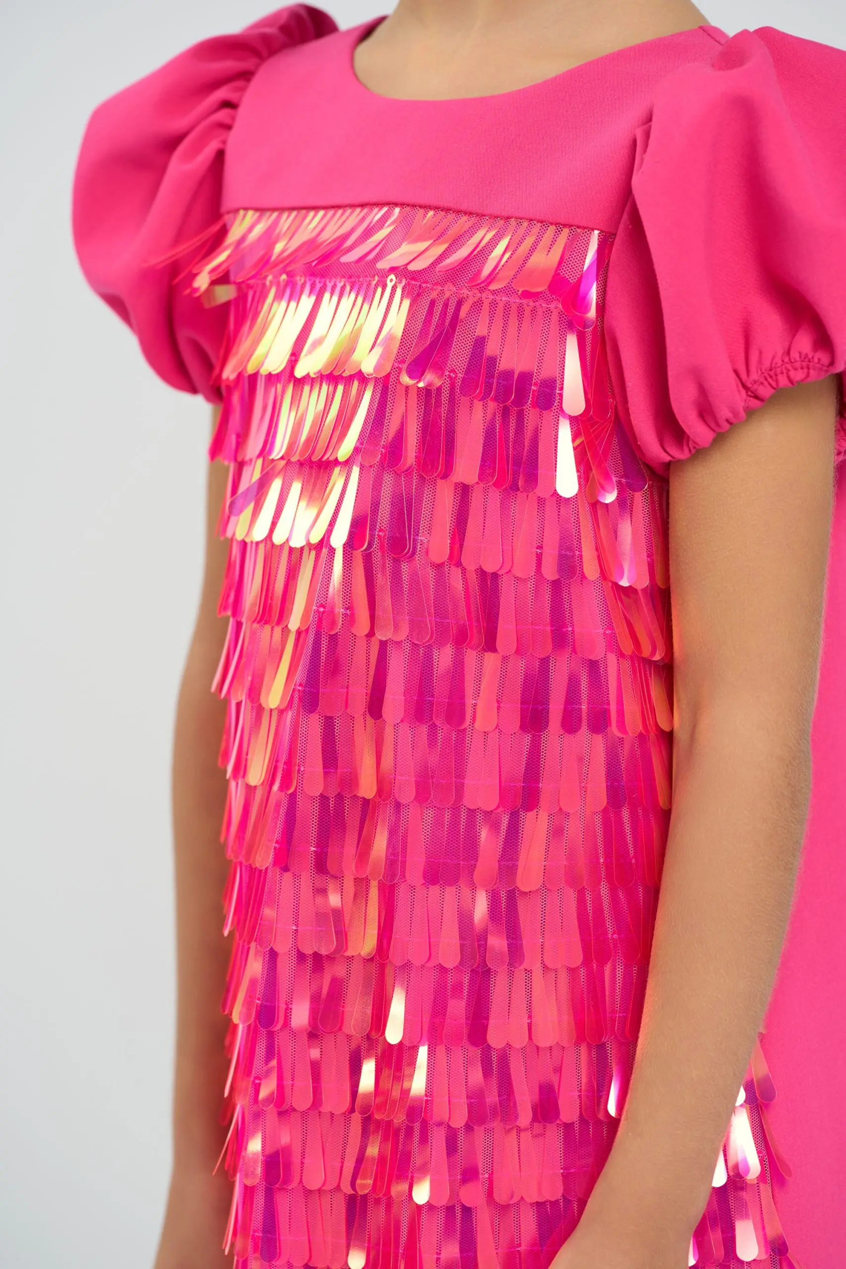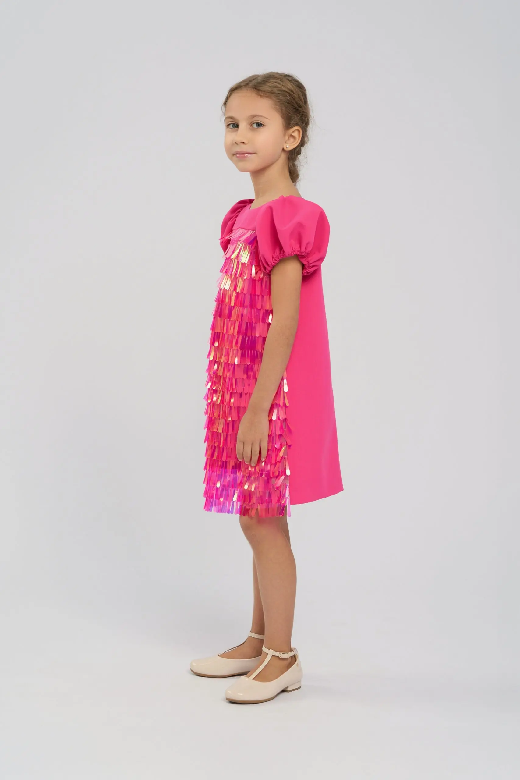 Платье с крупными длинными пайетками для девочки выполнено в модном ярком розовом цвете, который привлекает внимание и создаёт праздничное настроение. Пайетки крупного размера равномерно распределены по ... платью, создавая эффектный гламурный блеск и игру света, что делает модель особенно нарядной. Короткие рукава-фонарики добавляют платью романтичный вид. Застегивается платье на молнию на спинке. Подкладка из натурального хлопка обеспечивает ребенку комфорт.