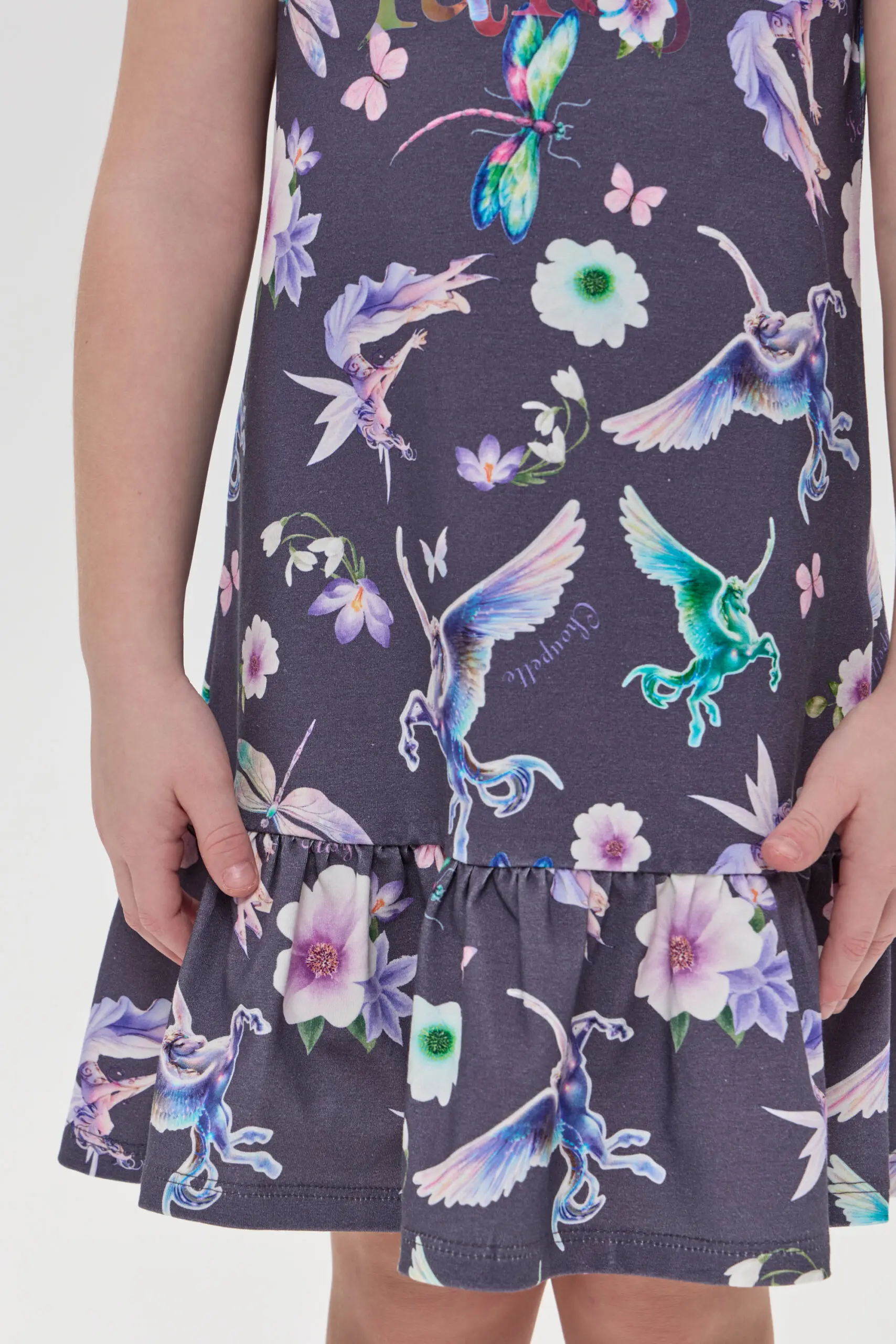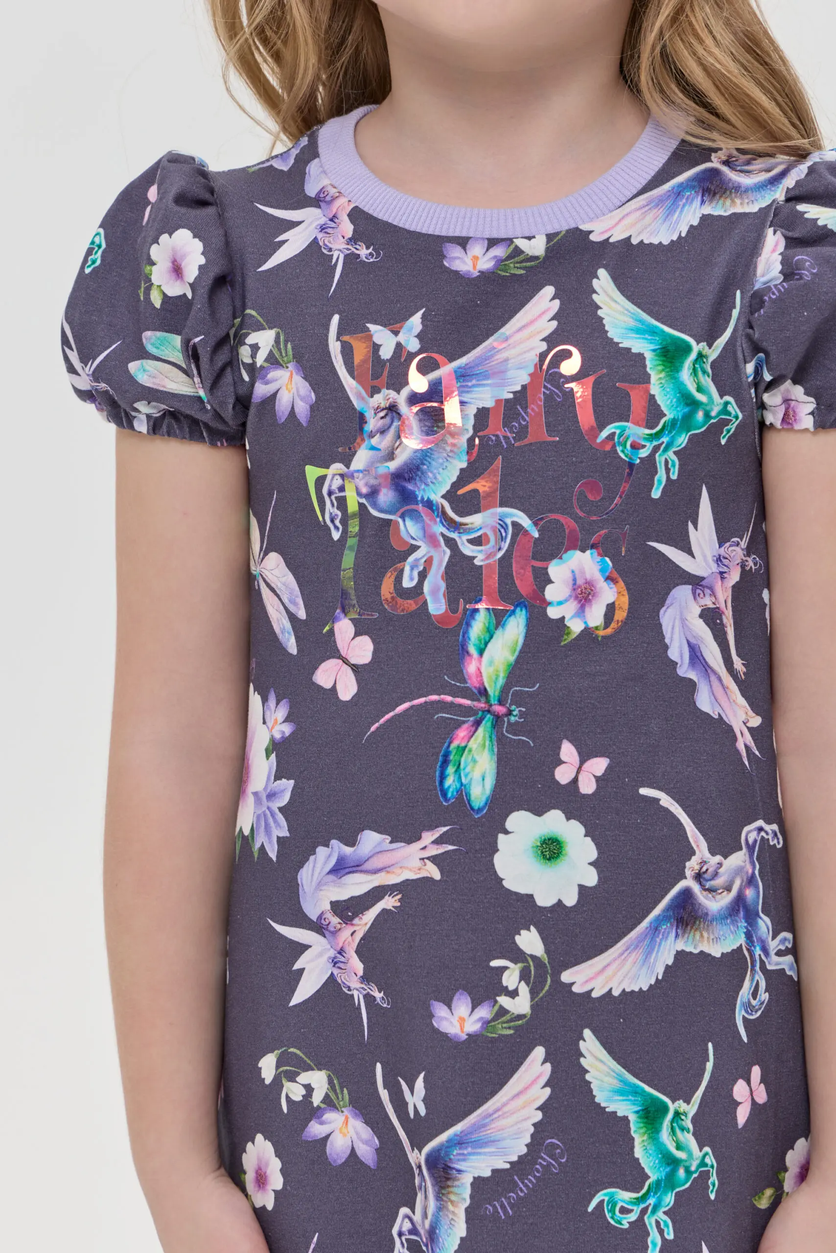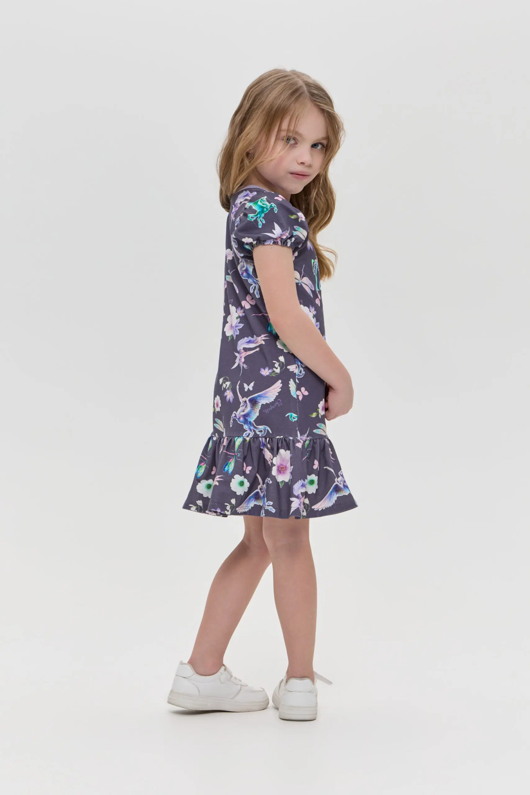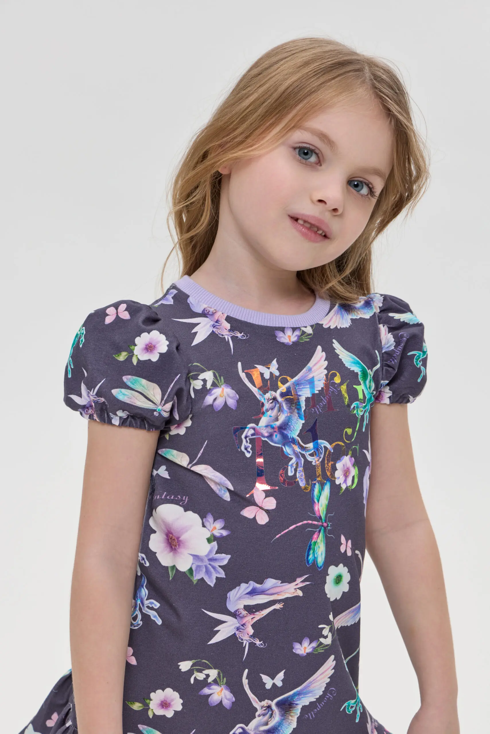 Платье с фирменным принтом — отличный выбор для стильной девочки. Оригинальная модель платья имеет свободный крой и рукава в виде фонариков, что придает ему особое очарование. ... Горловина обработана контрастной эластичной окантовкой. Дизайнерский принт привлекает внимание и создает модный образ. Платье, украшенное воланами выглядит стильно и современно. Модель легко комбинировать с различными аксессуарами, что дает возможность создавать разнообразные образы для различных мероприятий