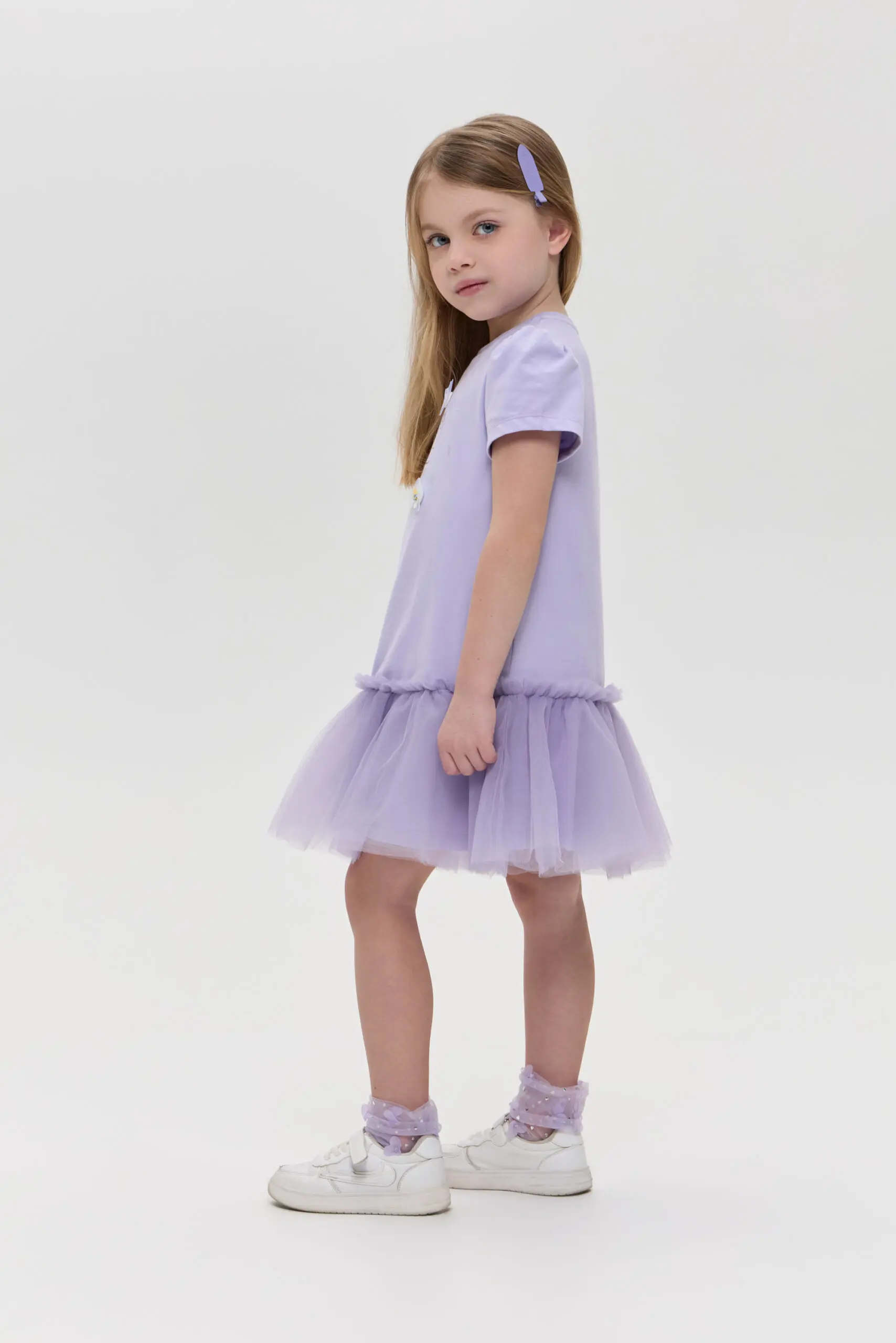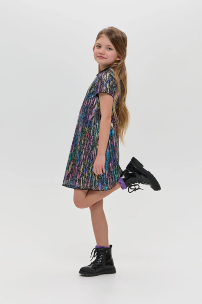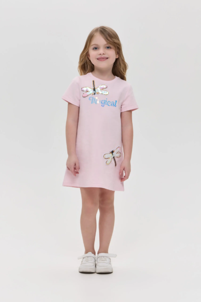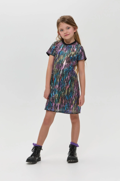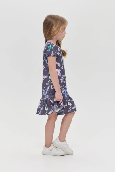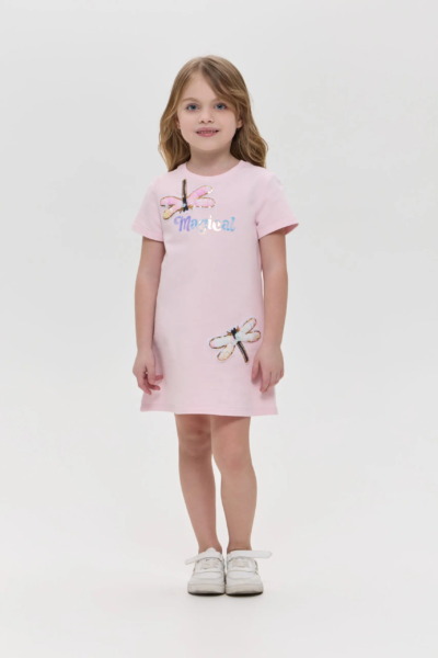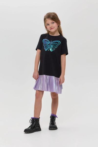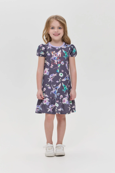 Трикотажное платье для девочки создает воздушный и нежный образ. Платье выполнено из мягкого и эластичного материала. Практичная модель очень удобная: свободный крой, короткий рукав и пышная ... юбка. Стильный буквенный принт украшен объемными цветами. В этом наряде вашей дочке будет удобно бегать, играть и веселиться, оставаясь самой очаровательной.