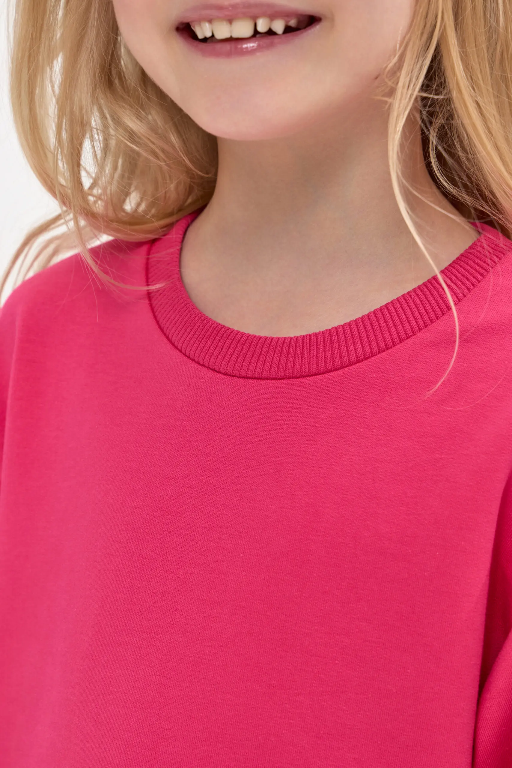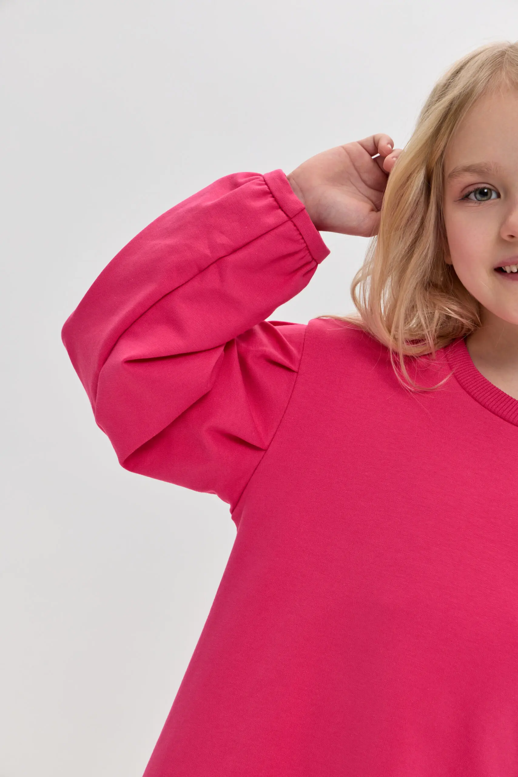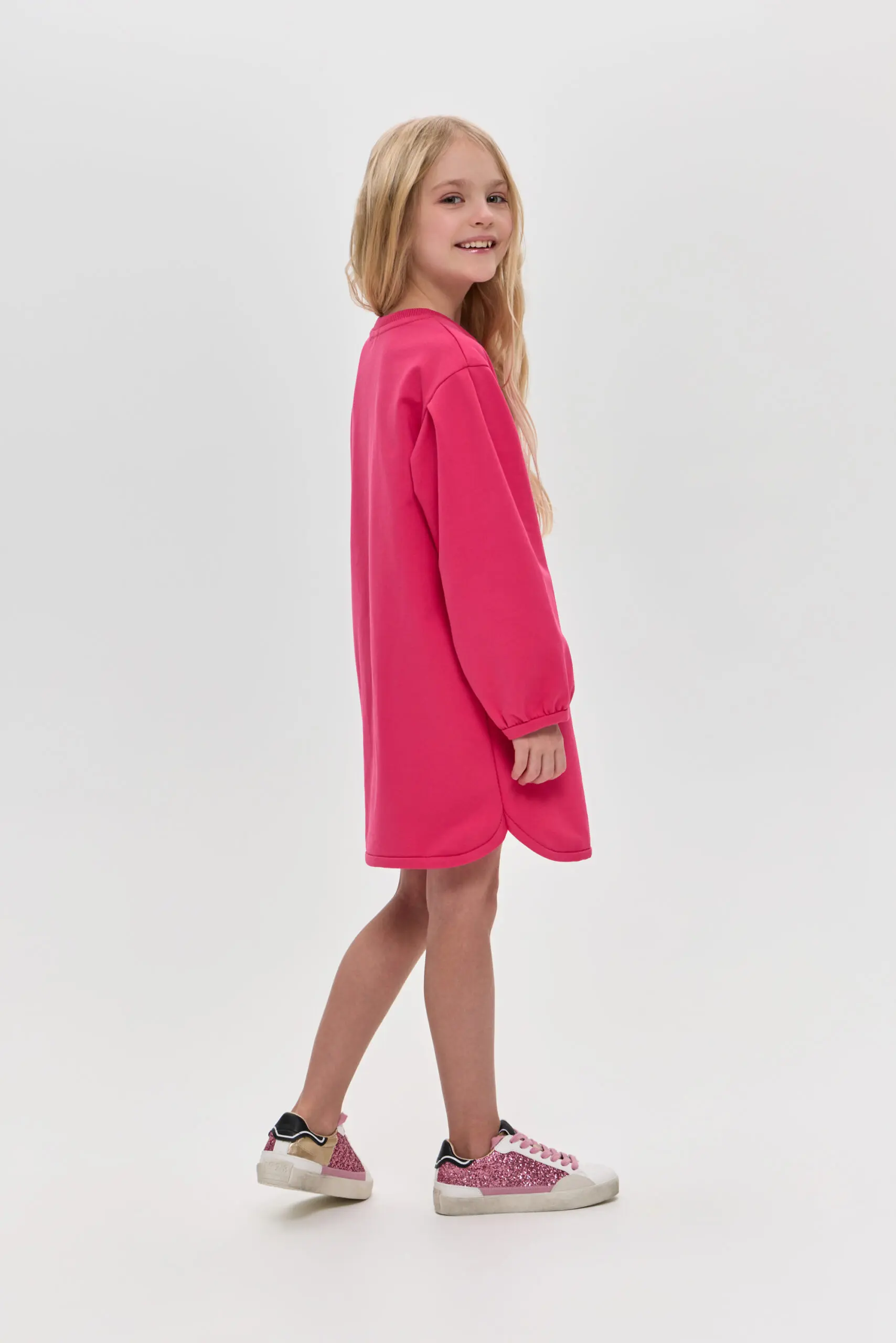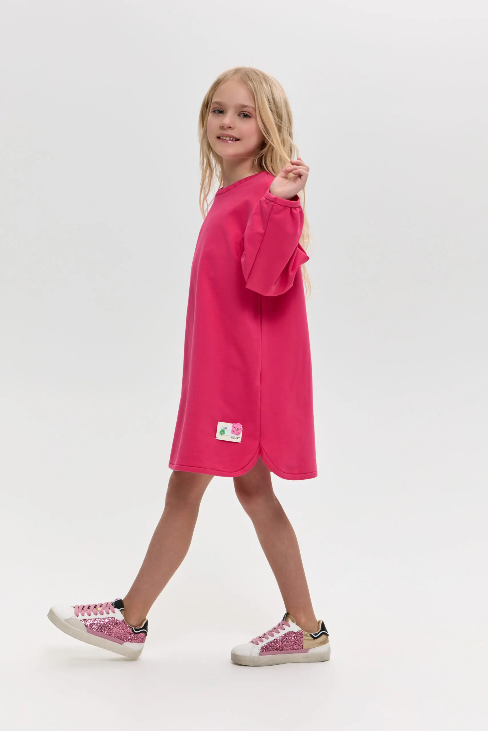Платье из футера для девочки выполнено в трендовом оттенке фуксии. Модель свободного силуэта, с круглым вырезом горловины и длинными рукавами. Платье выполнено из мягкой смесовой ткани, ... она легкого восстанавливает форму, не растягивается и сохраняет насыщенность цвета. Модное платье идеально подходит для различных случаев — от прогулок до праздников.