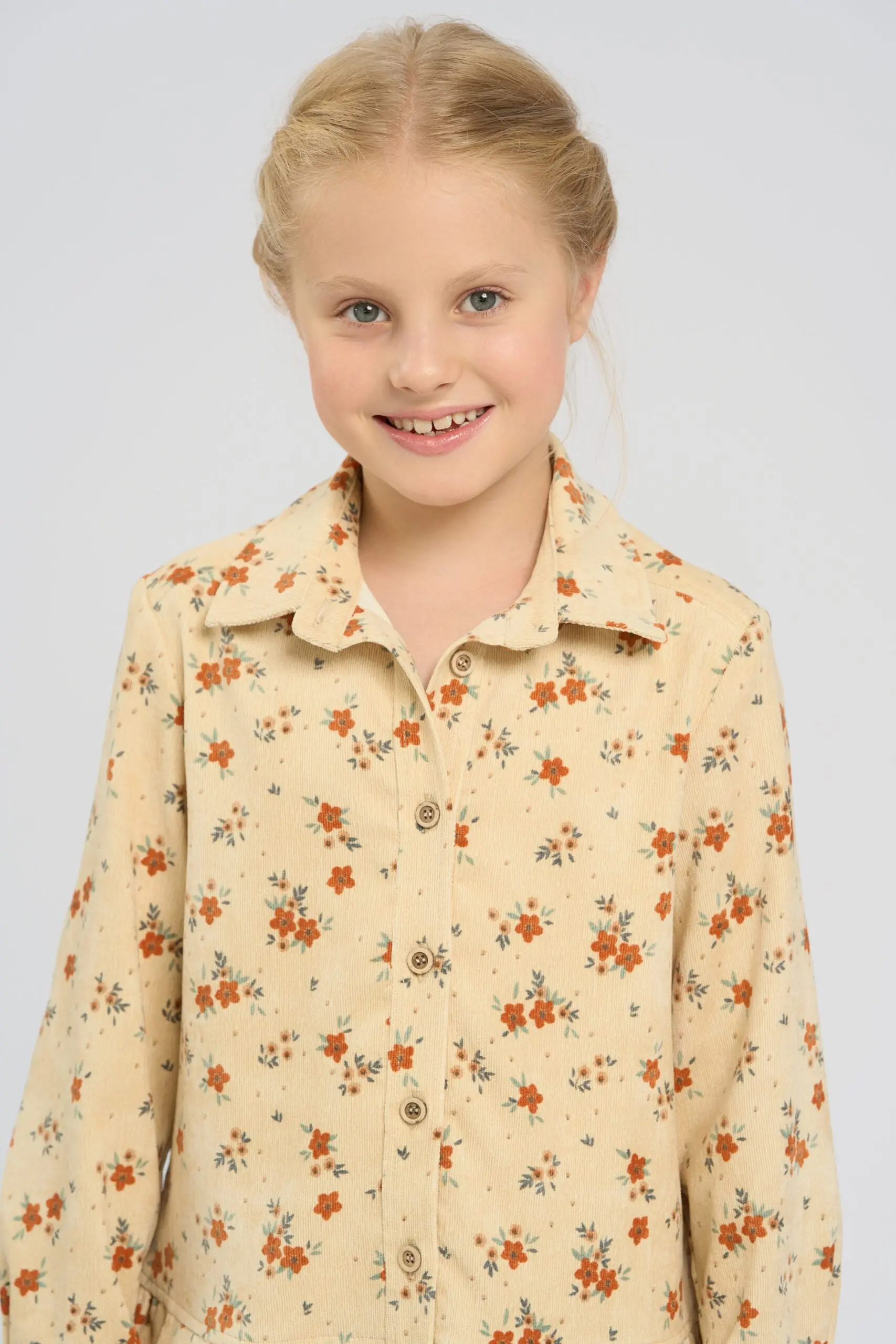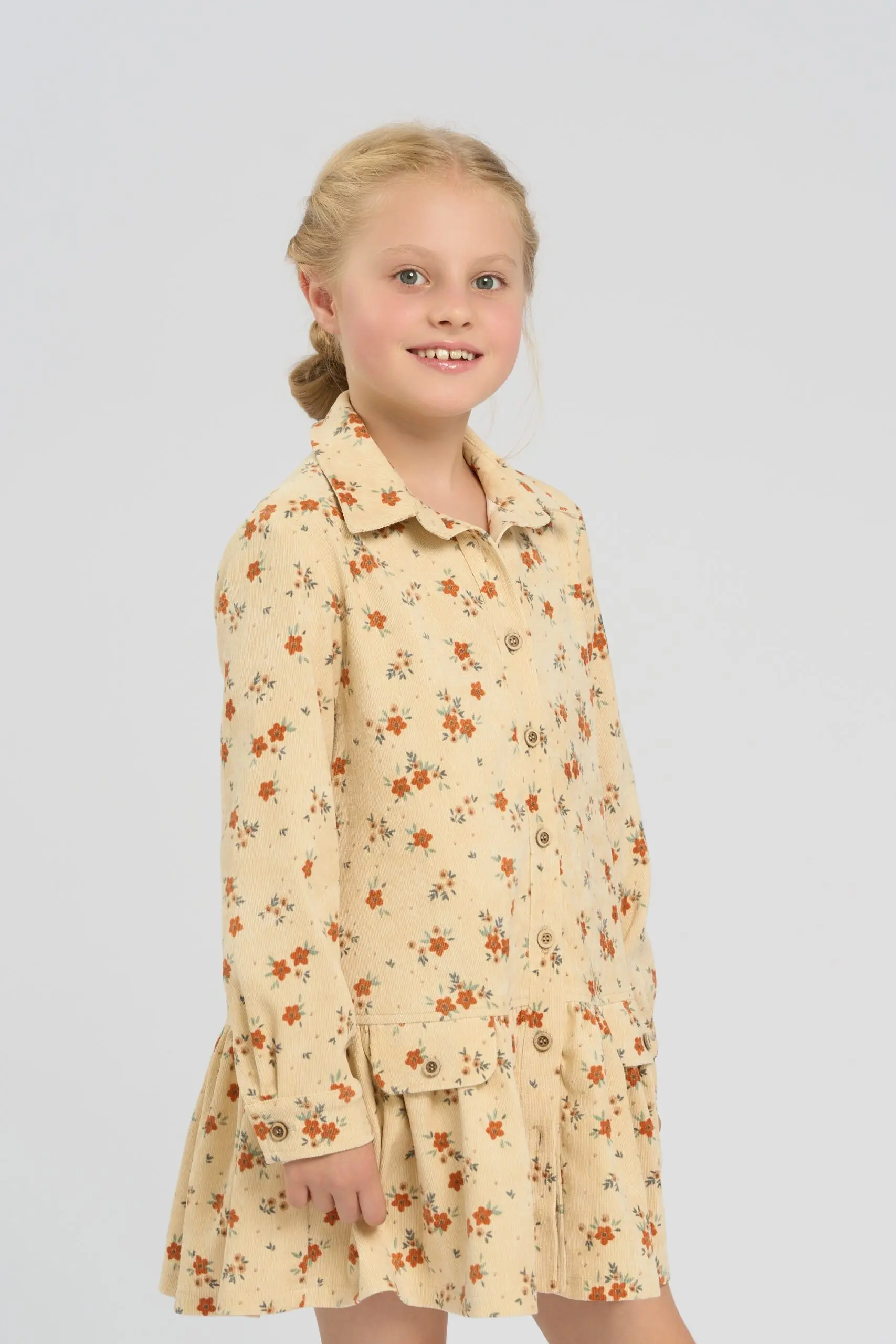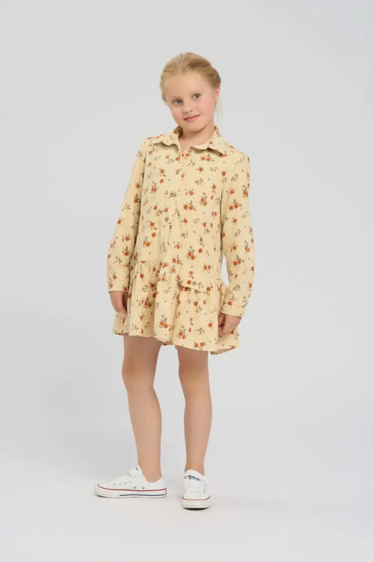 Платье из микровельвета выполнено в бежевом оттенке и украшено цветочным принтом. Модель выполнена в актуальном рубашечном крое, застегивается на пуговицы. Нижний край оформлен широким воланом, который ... создает воздушный силуэт. Подкладка из натурального хлопка приятна телу, дарит ребенку комфорт даже при активной повседневной носке. Ткань из микровельвета обладает красивой фактурой, что дополнительно украшает дизайн.
