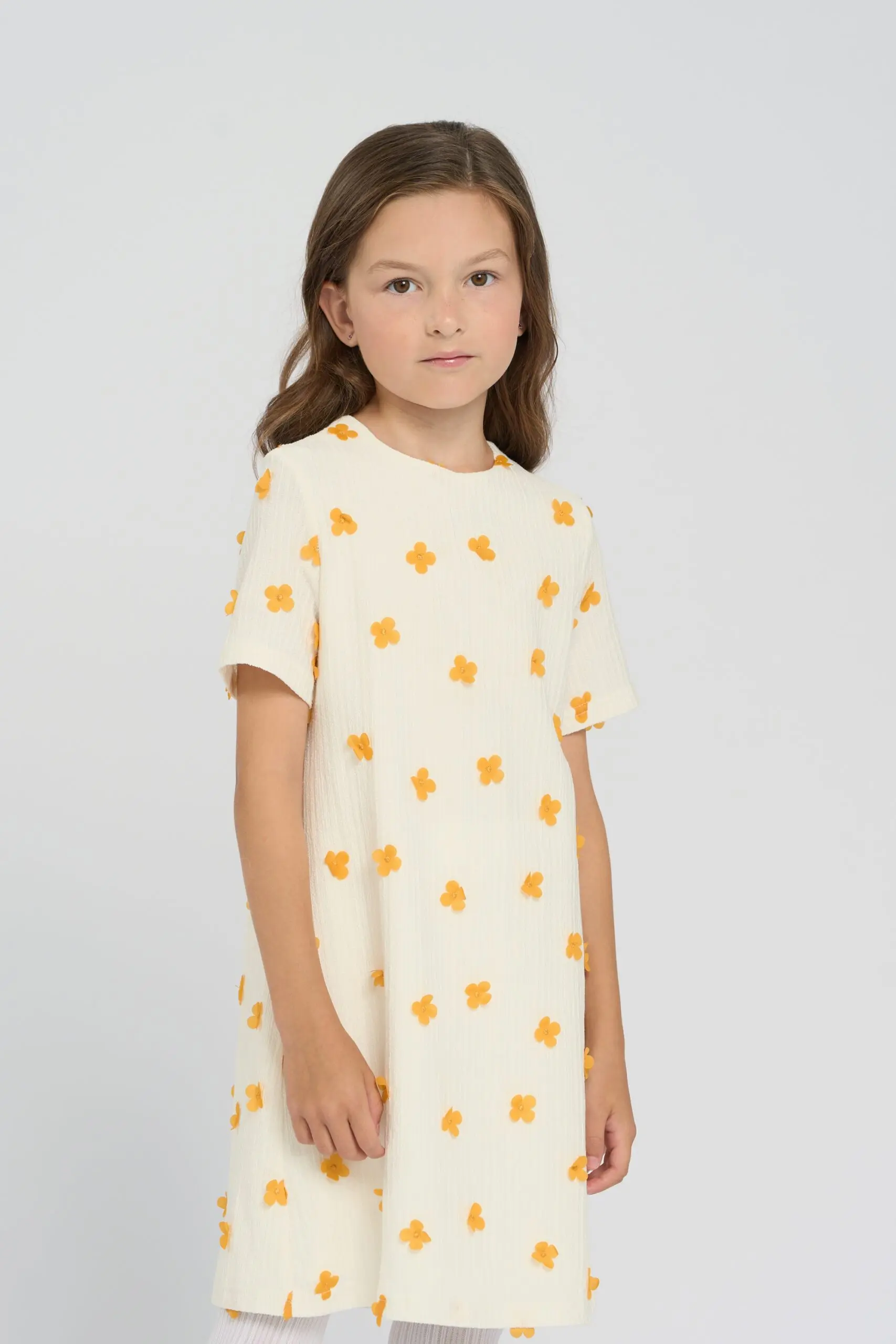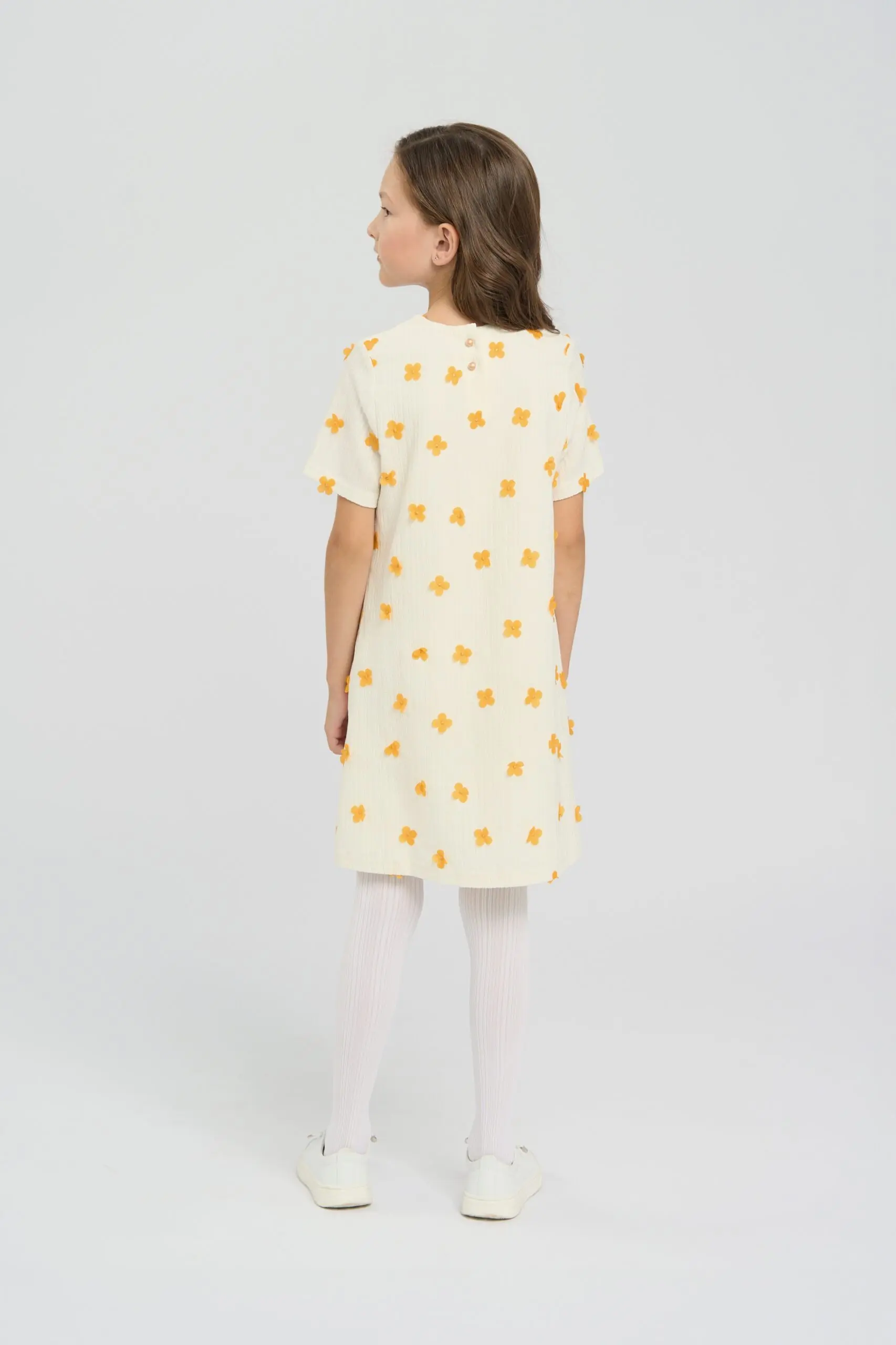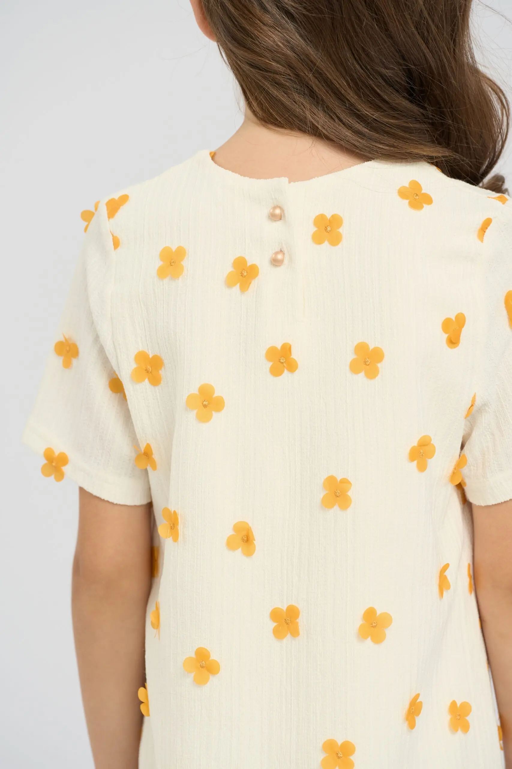 Очаровательное платье из органзы изысканного цвета экрю декорировано объемными желтыми цветами, что сразу привлекает внимание к детскому наряду. Платье комфортного силуэта не сковывает движения. Модель с ... круглым вырезом горловины и короткими рукавами. Подкладка из вискозы гарантирует ребенку комфорт. Платье застегивается на спинке на две аккуратные пуговицы.