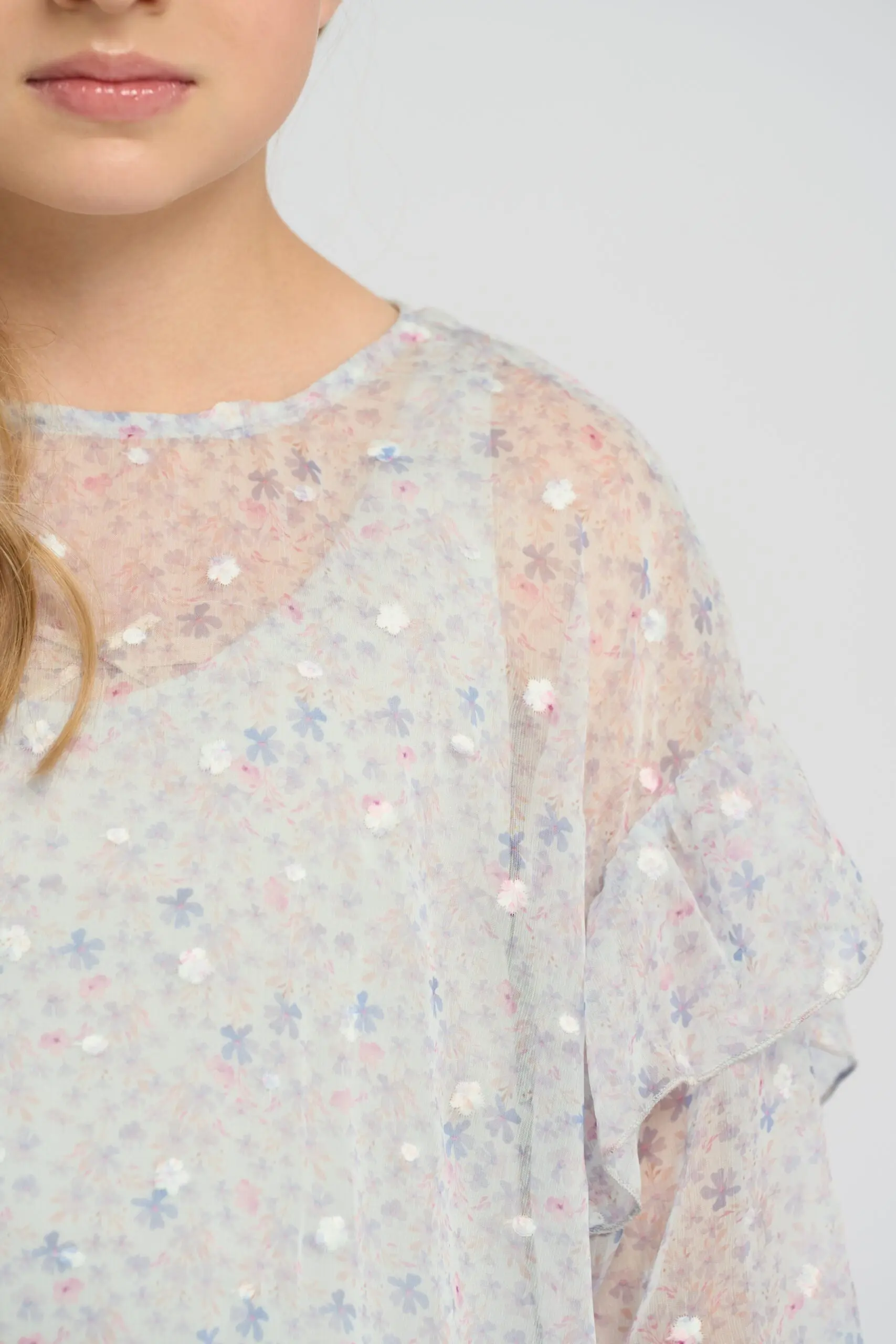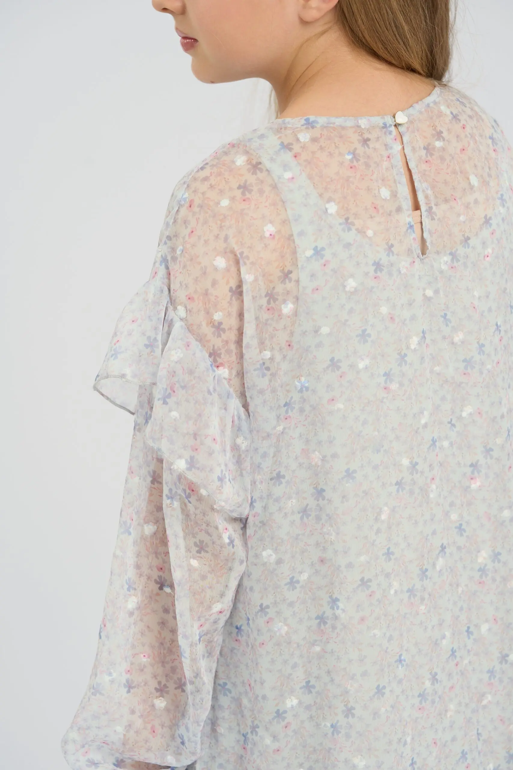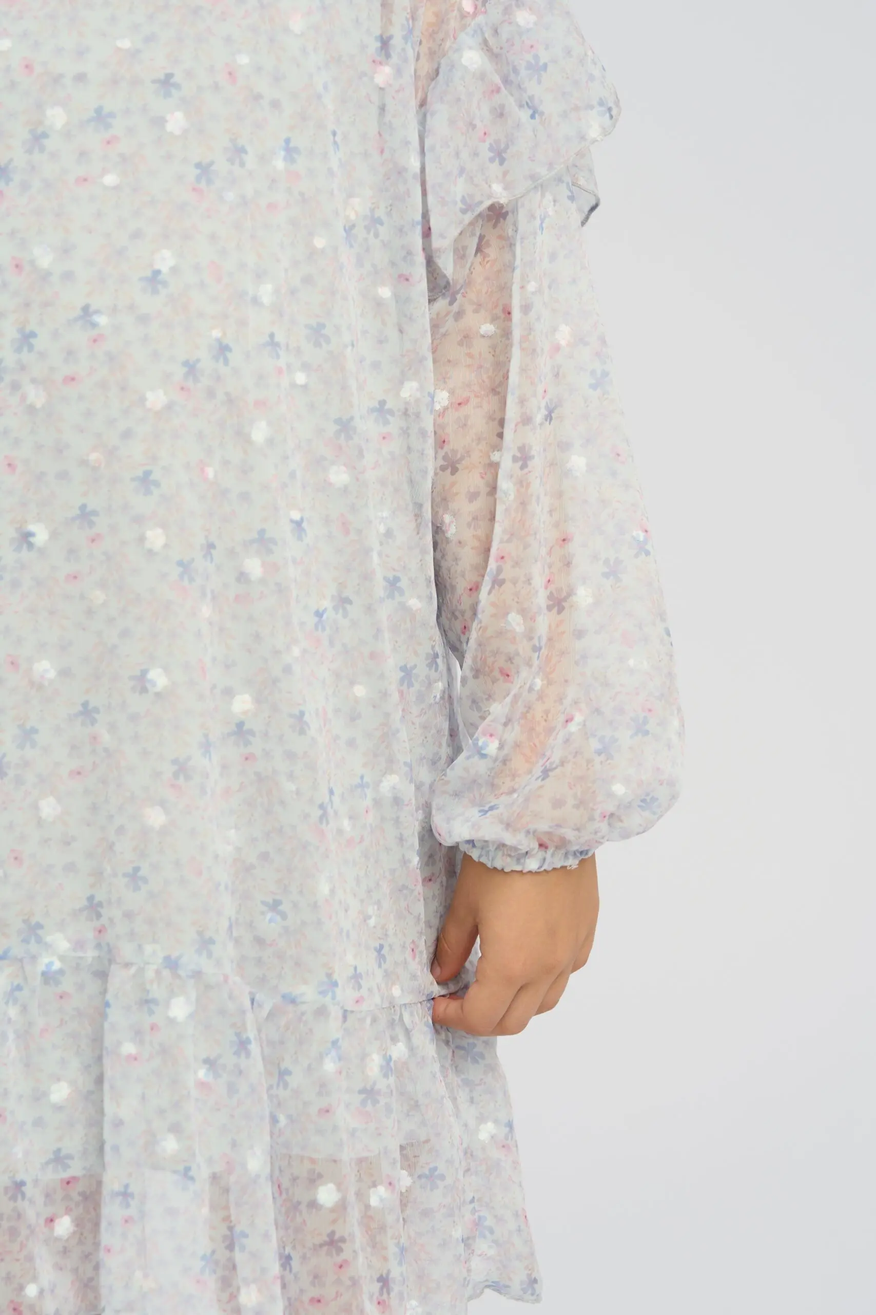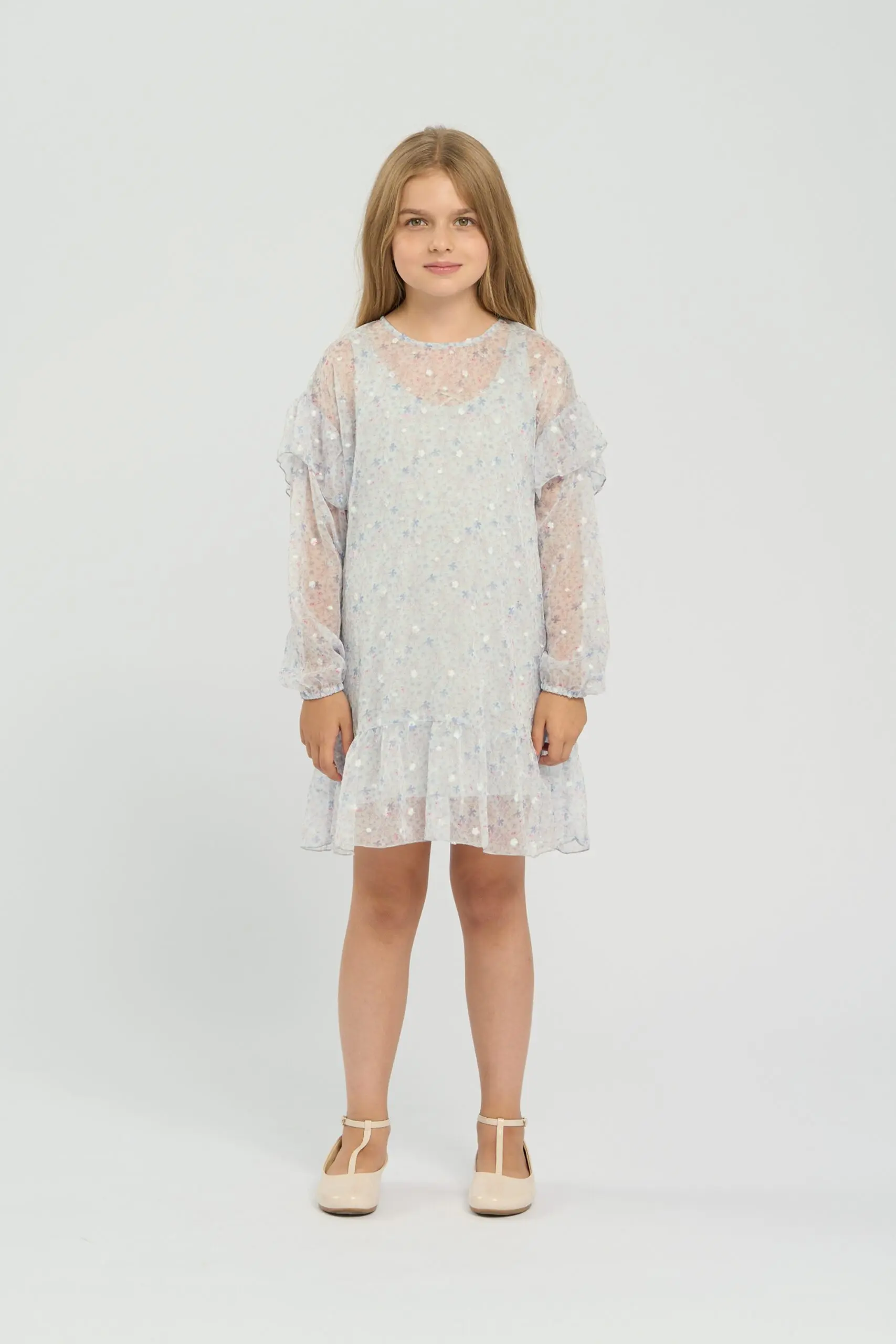 Очаровательное платье из светло-голубого шифона украшено нежным цветочным принтом и мелкой фактурной вышивкой. Платье оформлено широкими рюшами на рукавах и по краю подола, которые подчеркивают воздушность ... дизайна. Изделие имеет подкладку из вискозы. Застегивается платье сзади на пуговицу.