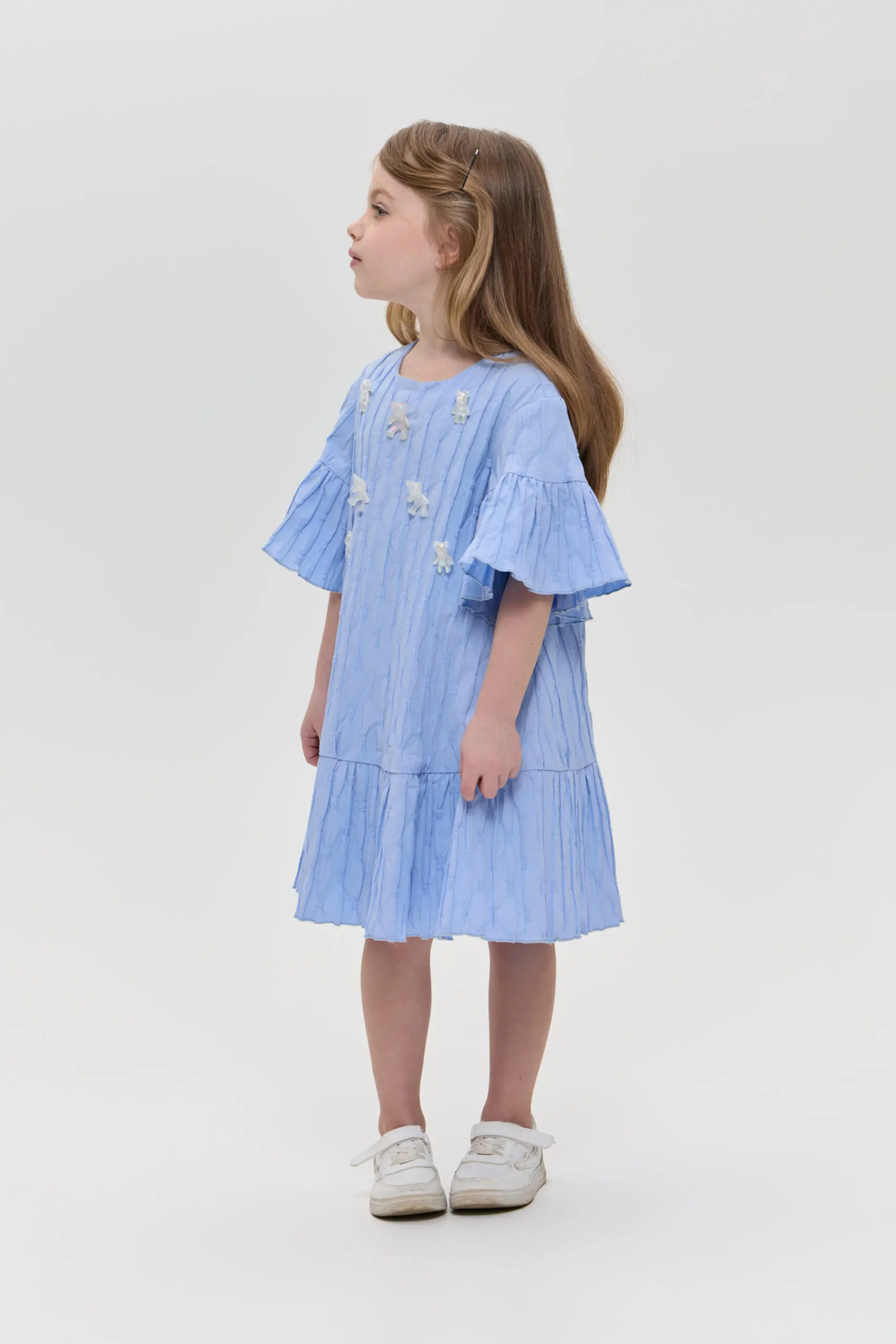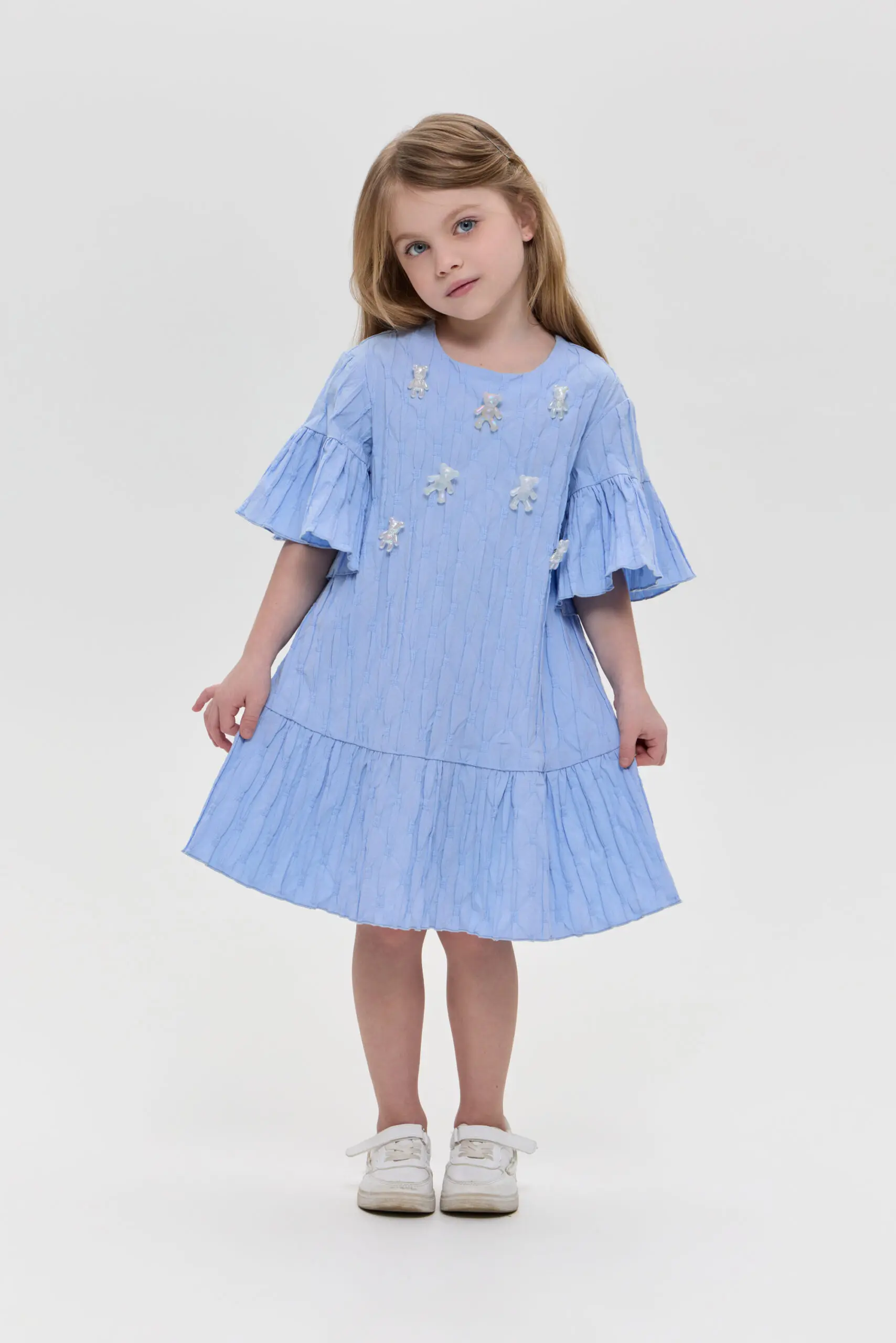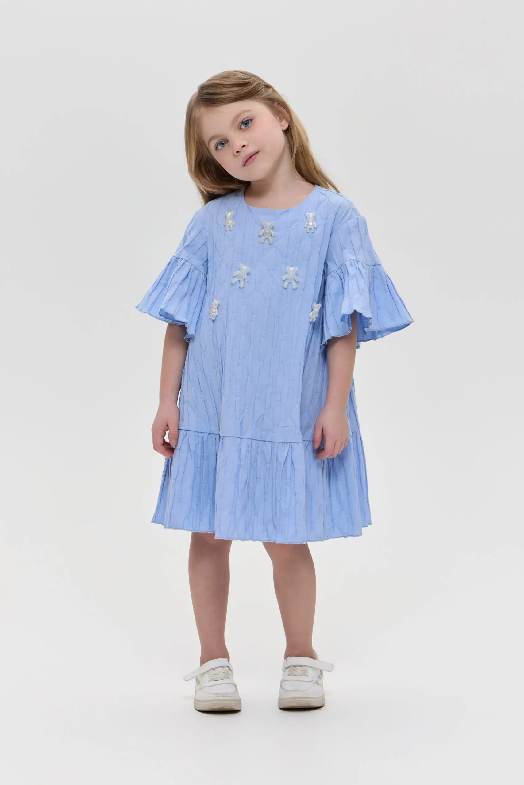 Прелестное платье для девочки, сшитое из текстурированного хлопка, прекрасный вариант для жаркого лета. Свободный крой позволяет ребенку чувствовать себя комфортно и непринужденно. Жатая фактура ткани создает ... оригинальный визуальный акцент. Воланы на рукавах и по низу платья привносят в облик нотки романтики. Объемные украшения в виде симпатичных медвежат завершают милый образ.