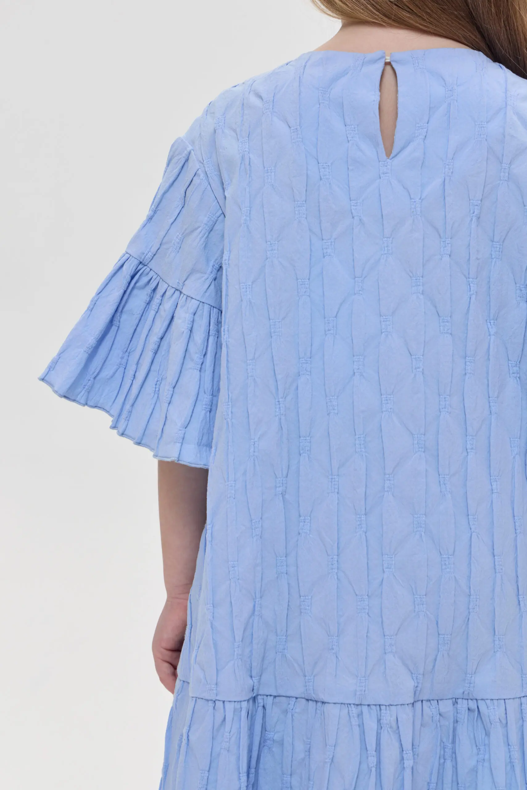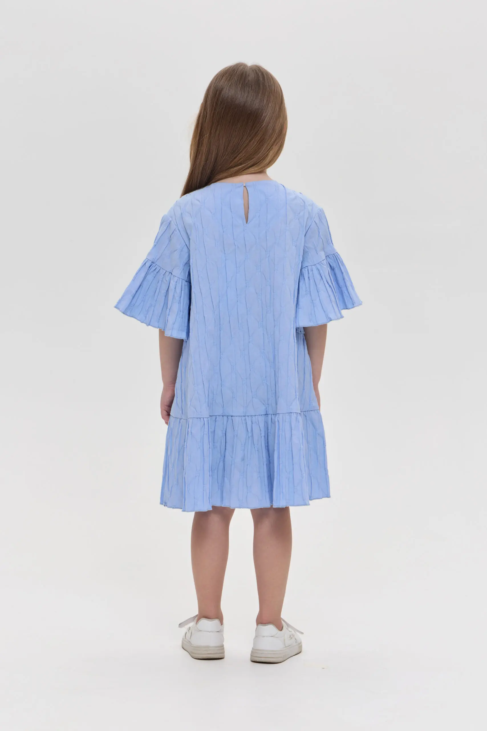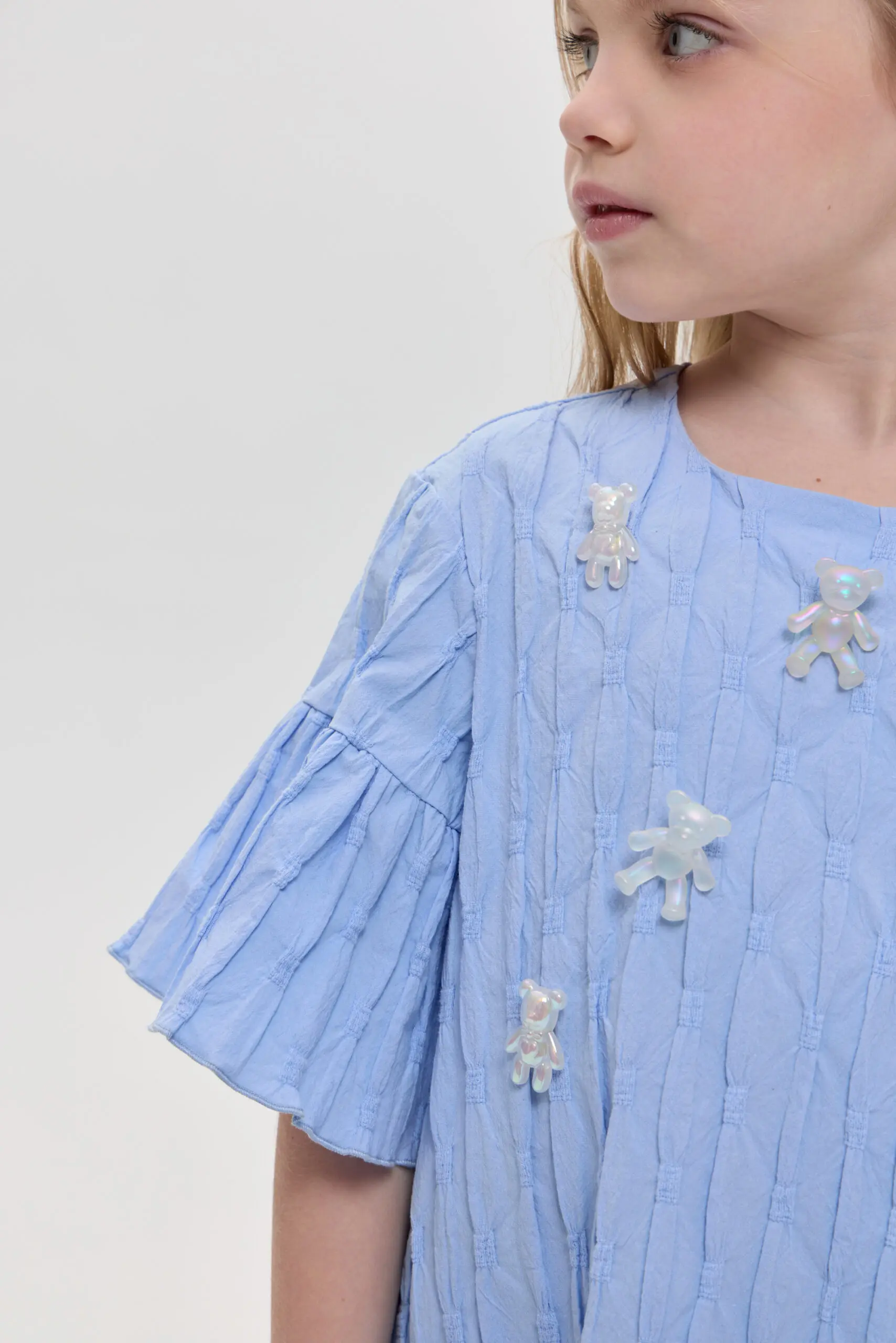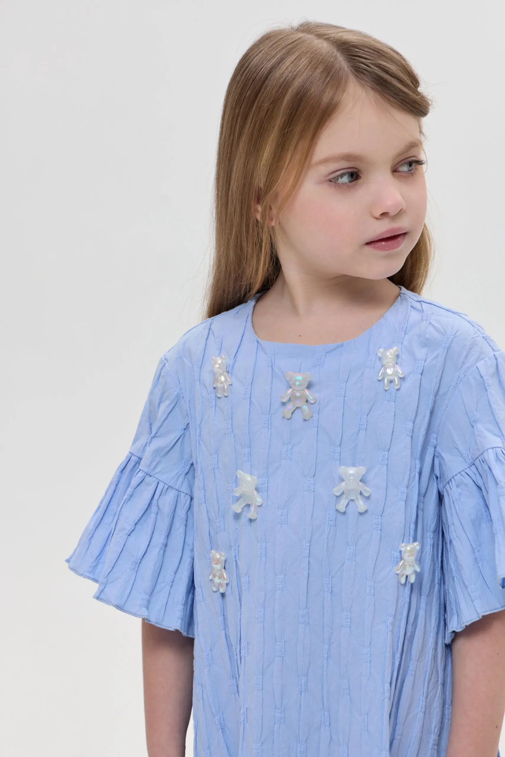 Прелестное платье для девочки, сшитое из текстурированного хлопка, прекрасный вариант для жаркого лета. Свободный крой позволяет ребенку чувствовать себя комфортно и непринужденно. Жатая фактура ткани создает ... оригинальный визуальный акцент. Воланы на рукавах и по низу платья привносят в облик нотки романтики. Объемные украшения в виде симпатичных медвежат завершают милый образ.