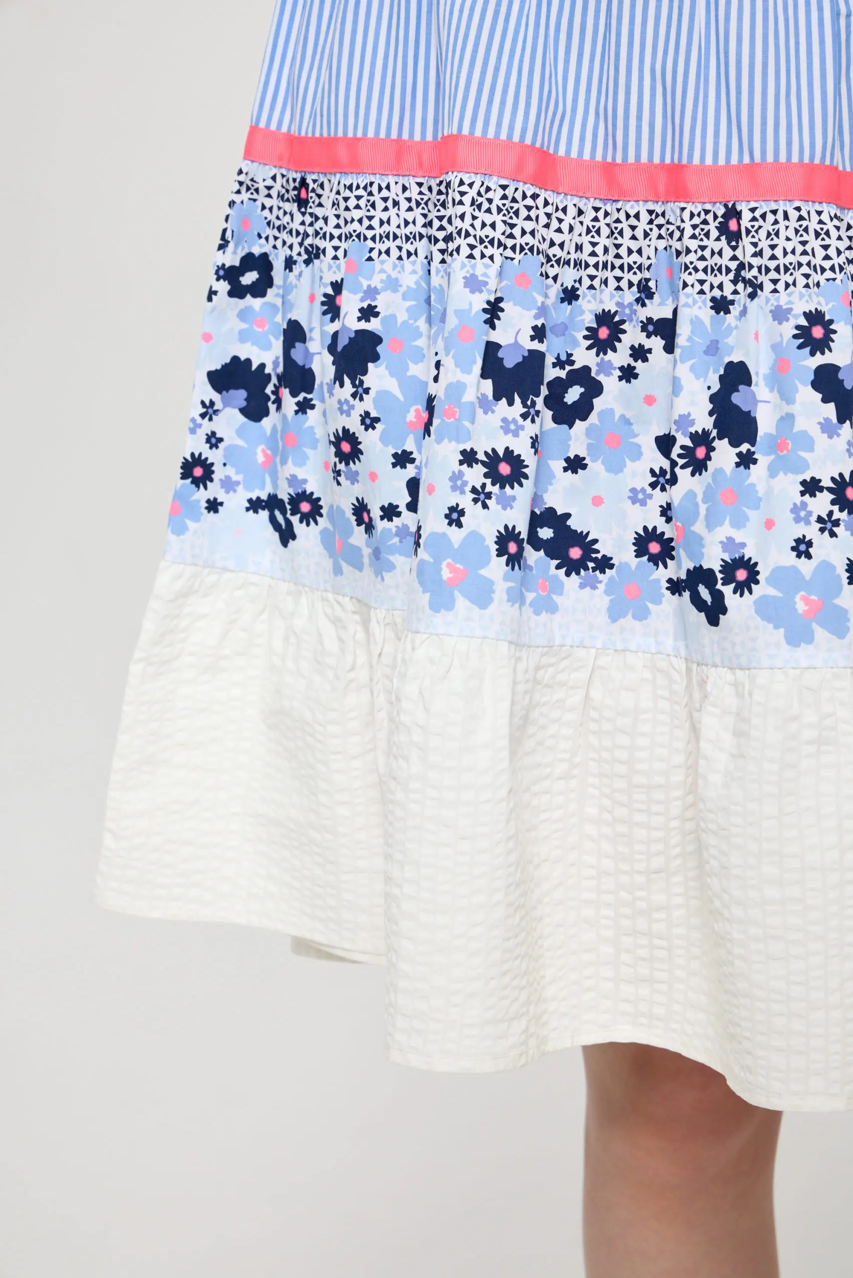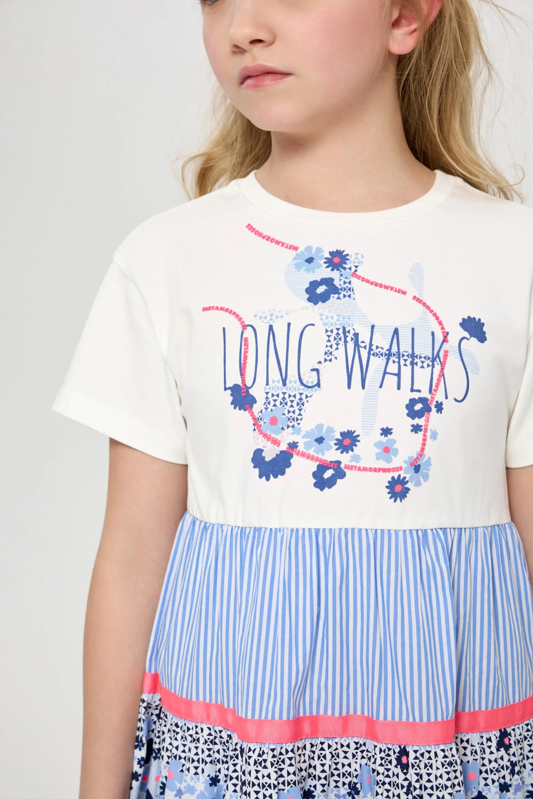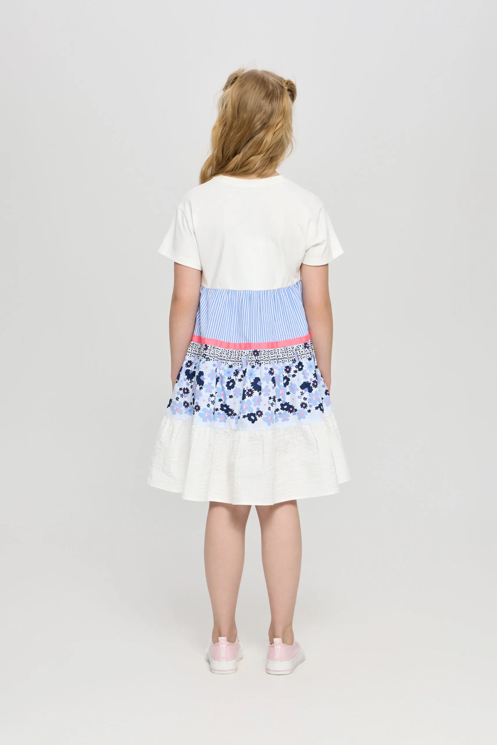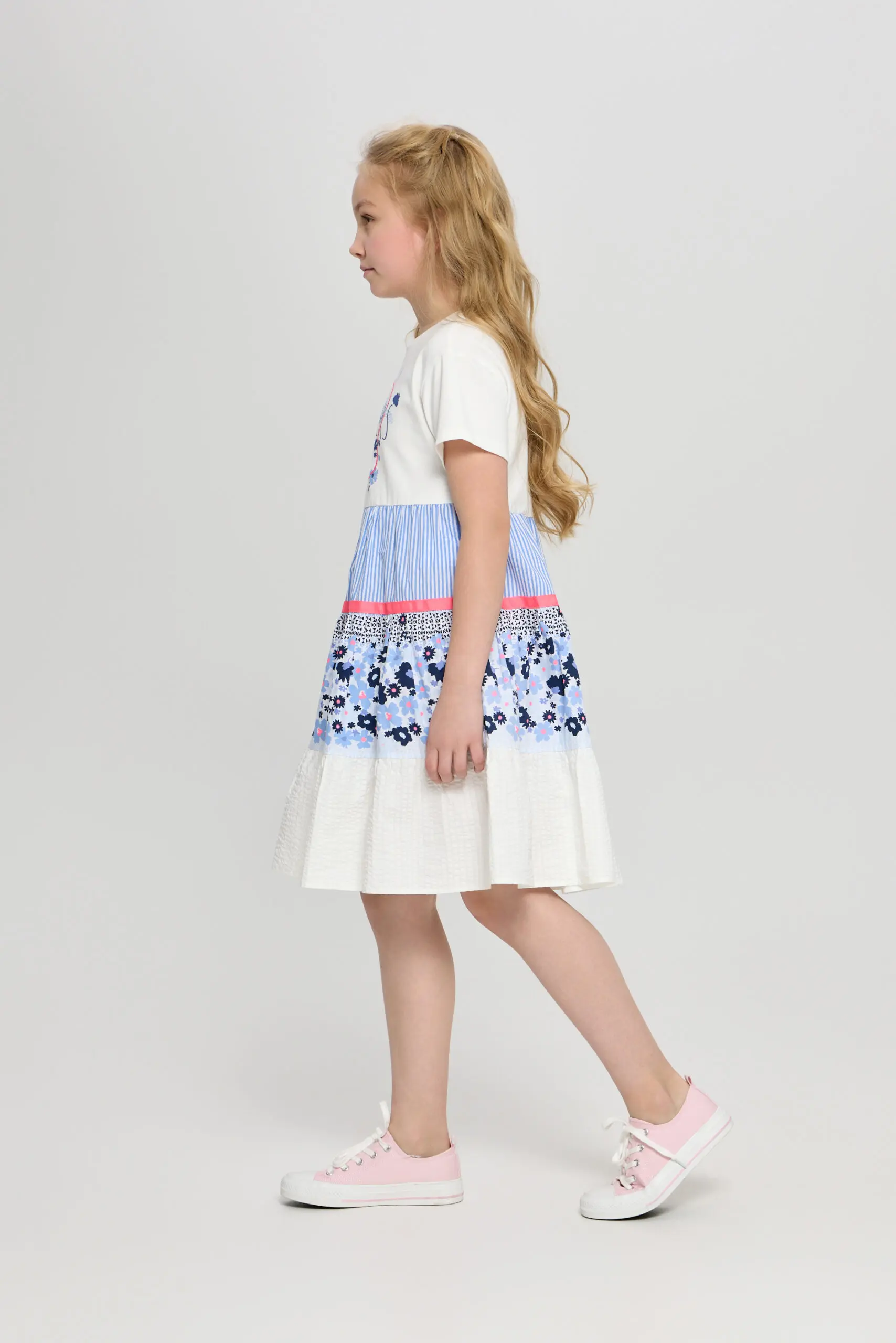 В летнем гардеробе девочки обязательно найдется место для очаровательного легкого платья. Комбинированная модель имеет форму трапеции со слегка завышенной линией талии и короткими рукавами. Низ платья ... обрамляет широкий волан, добавляющий игривые нотки. Яркий принт, украшающий платье, делает образ запоминающимся и неповторимым.