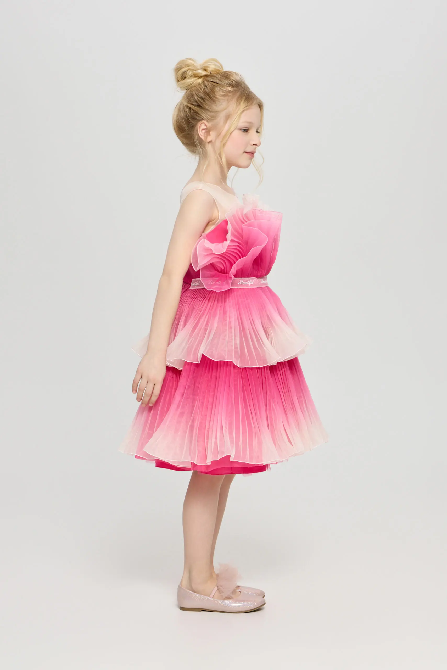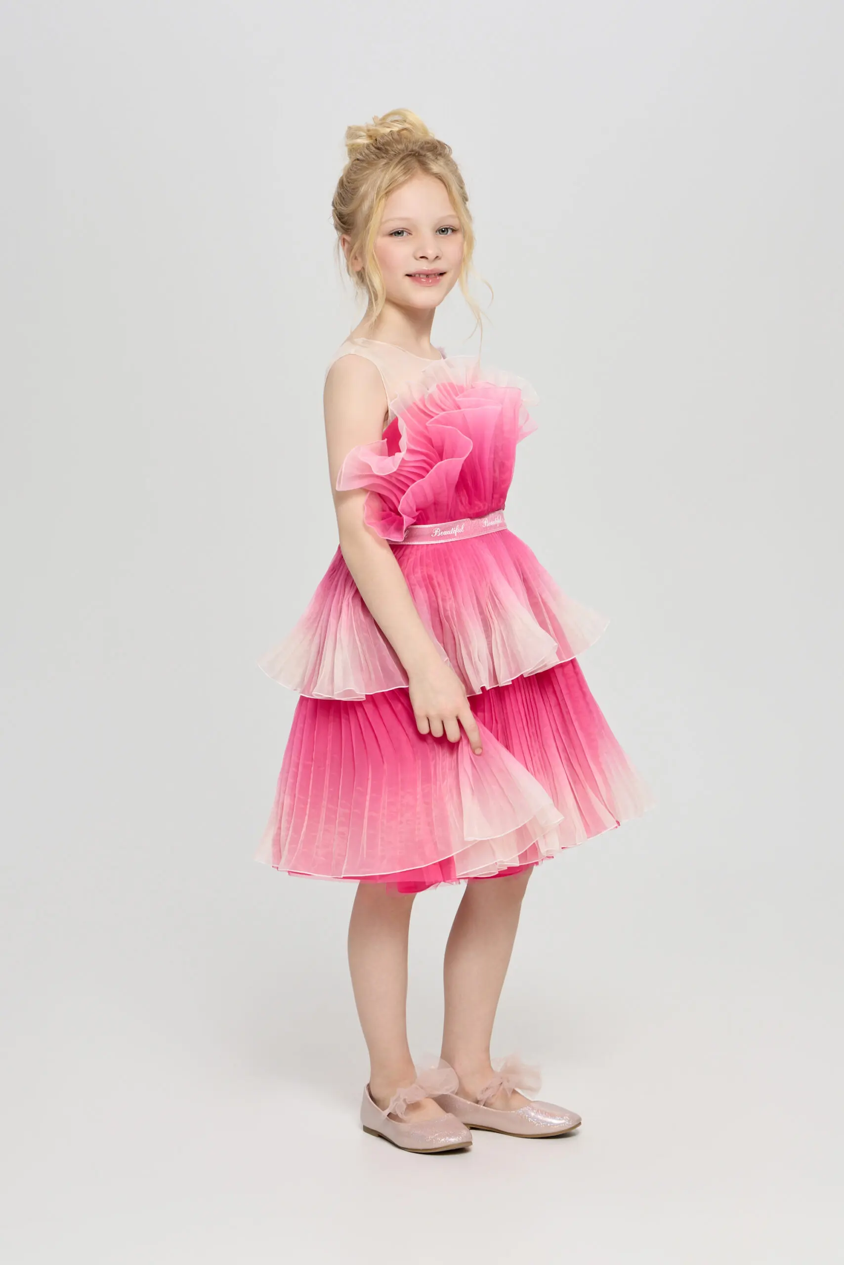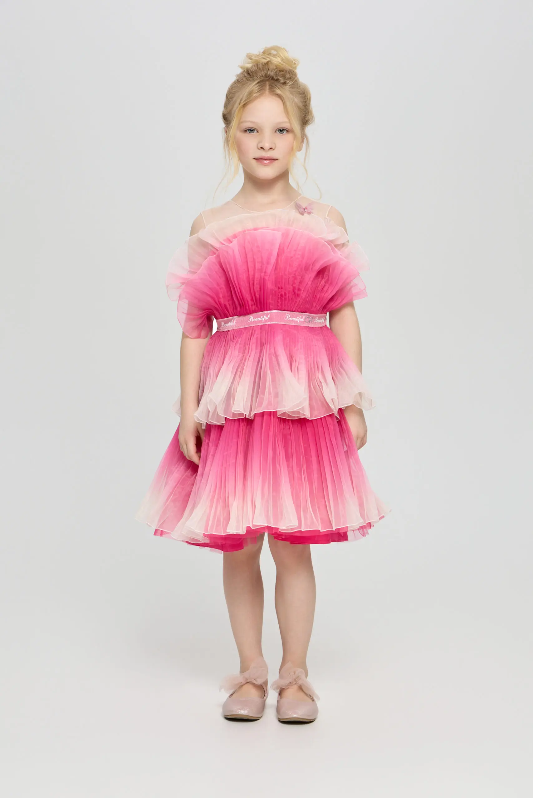 Ультромодное платье с градиентным принтом для девочки – это не просто одежда, а настоящее произведение искусства, призванное подчеркнуть индивидуальность и очарование юной модницы. Детали, притягивающие взгляд, ... делают его особенным и неповторимым. Двухъярусная пышная юбка создает воздушный и сказочный силуэт, позволяя девочке почувствовать себя настоящей принцессой. Оригинальный крой лифа гармонично сочетается с пышной юбкой, создавая сбалансированный и стильный образ. Изящный декор в виде бабочки акцентирует внимание. Это платье идеально подходит для особых случаев, праздников и фотосессий.