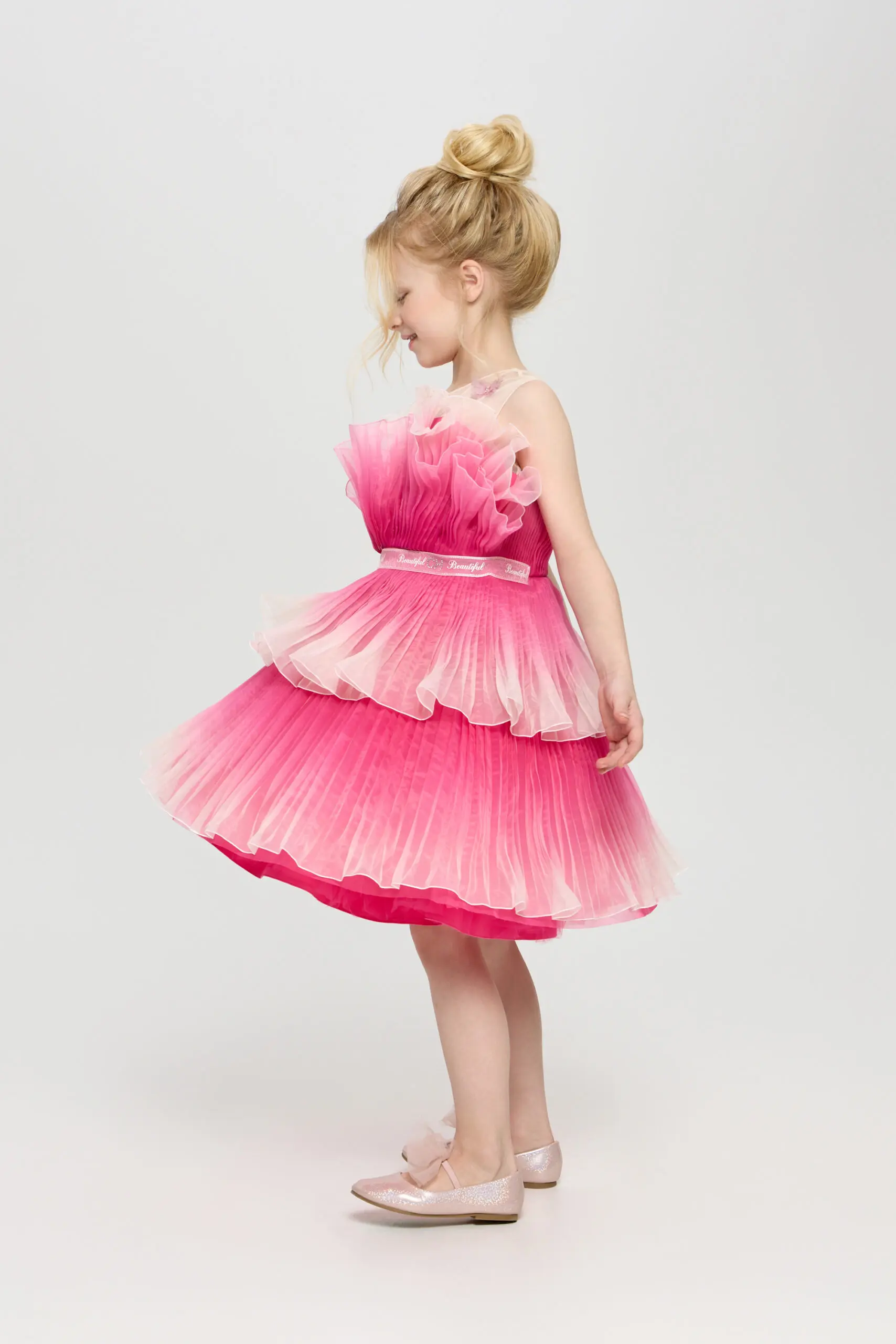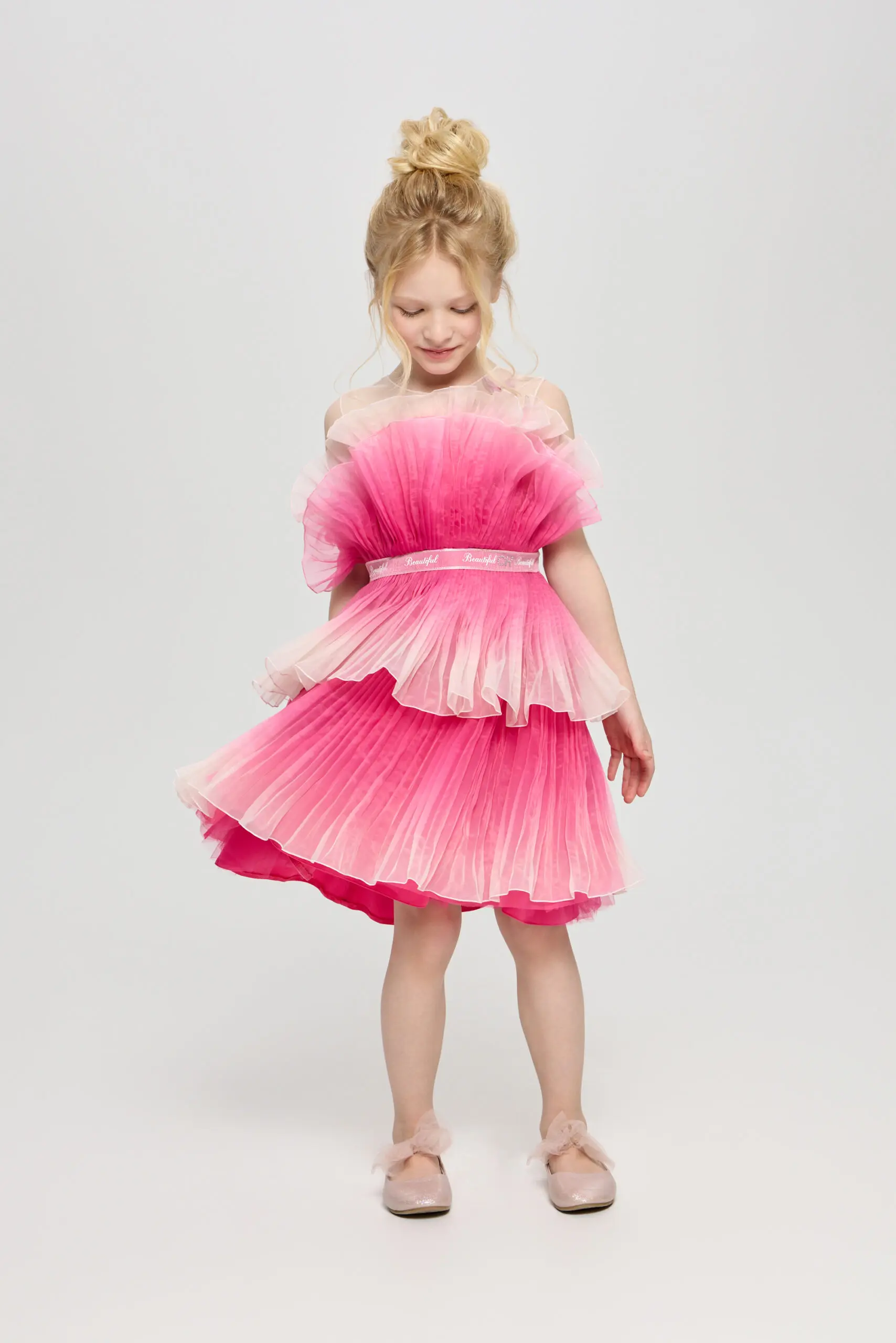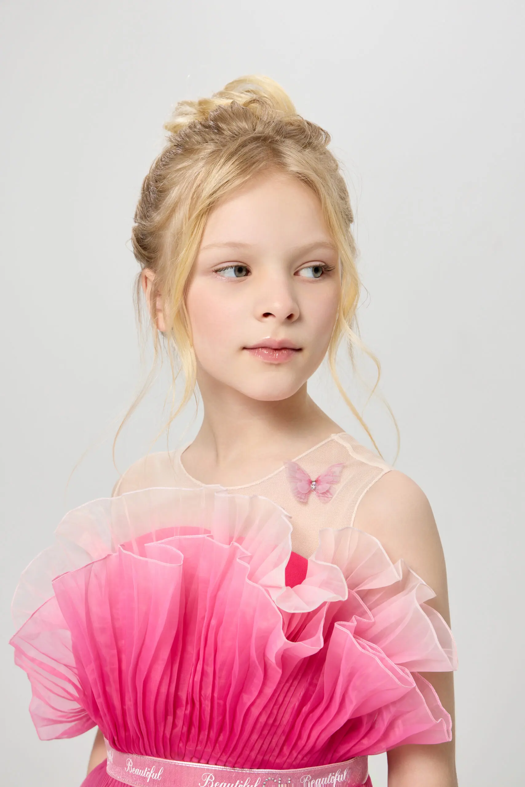 Ультромодное платье с градиентным принтом для девочки – это не просто одежда, а настоящее произведение искусства, призванное подчеркнуть индивидуальность и очарование юной модницы. Детали, притягивающие взгляд, ... делают его особенным и неповторимым. Двухъярусная пышная юбка создает воздушный и сказочный силуэт, позволяя девочке почувствовать себя настоящей принцессой. Оригинальный крой лифа гармонично сочетается с пышной юбкой, создавая сбалансированный и стильный образ. Изящный декор в виде бабочки акцентирует внимание. Это платье идеально подходит для особых случаев, праздников и фотосессий.