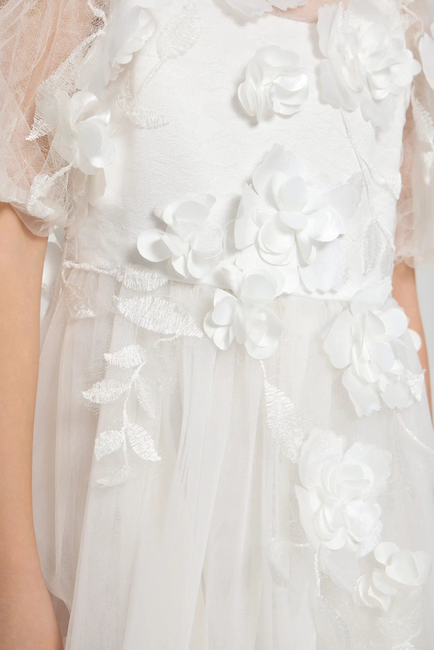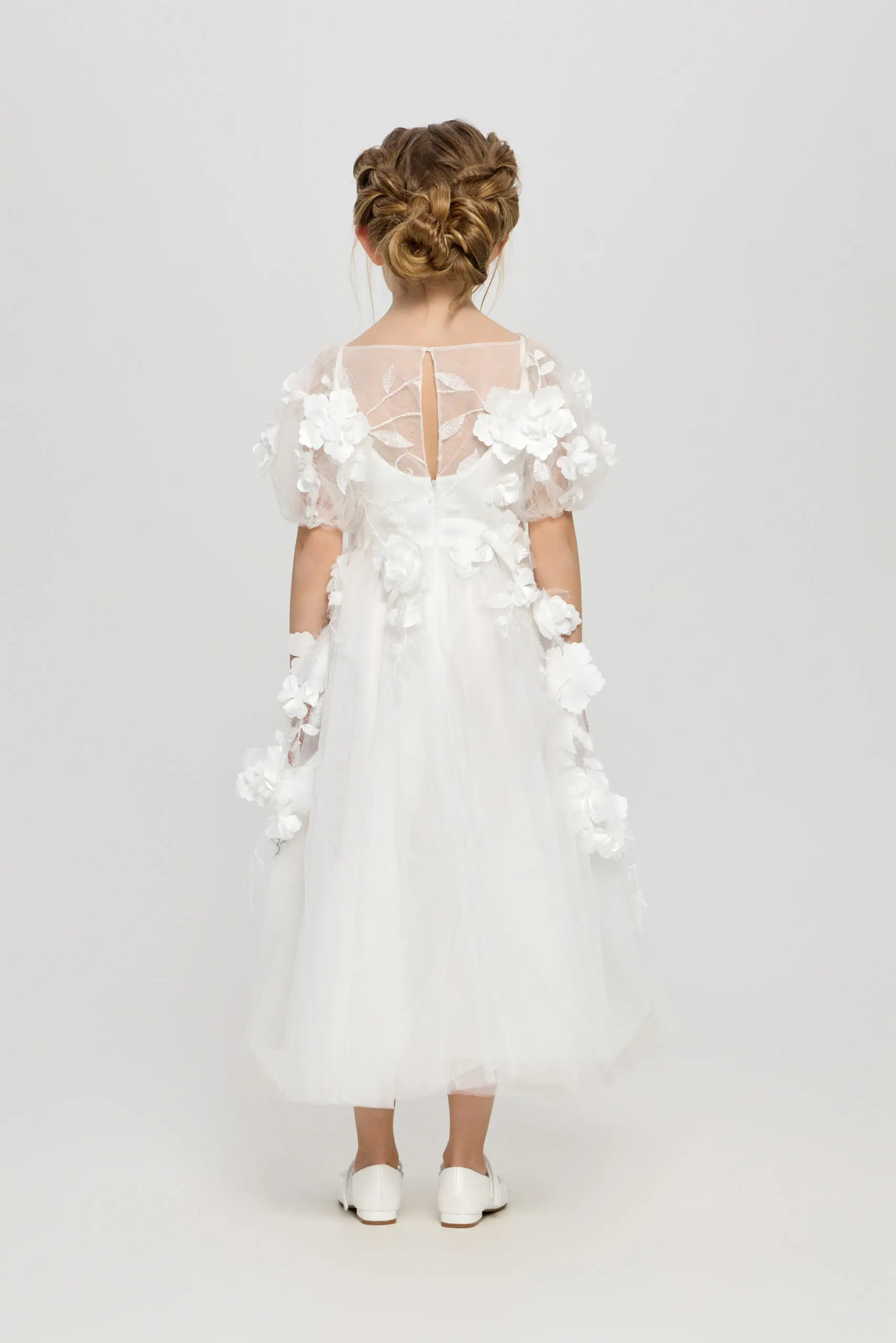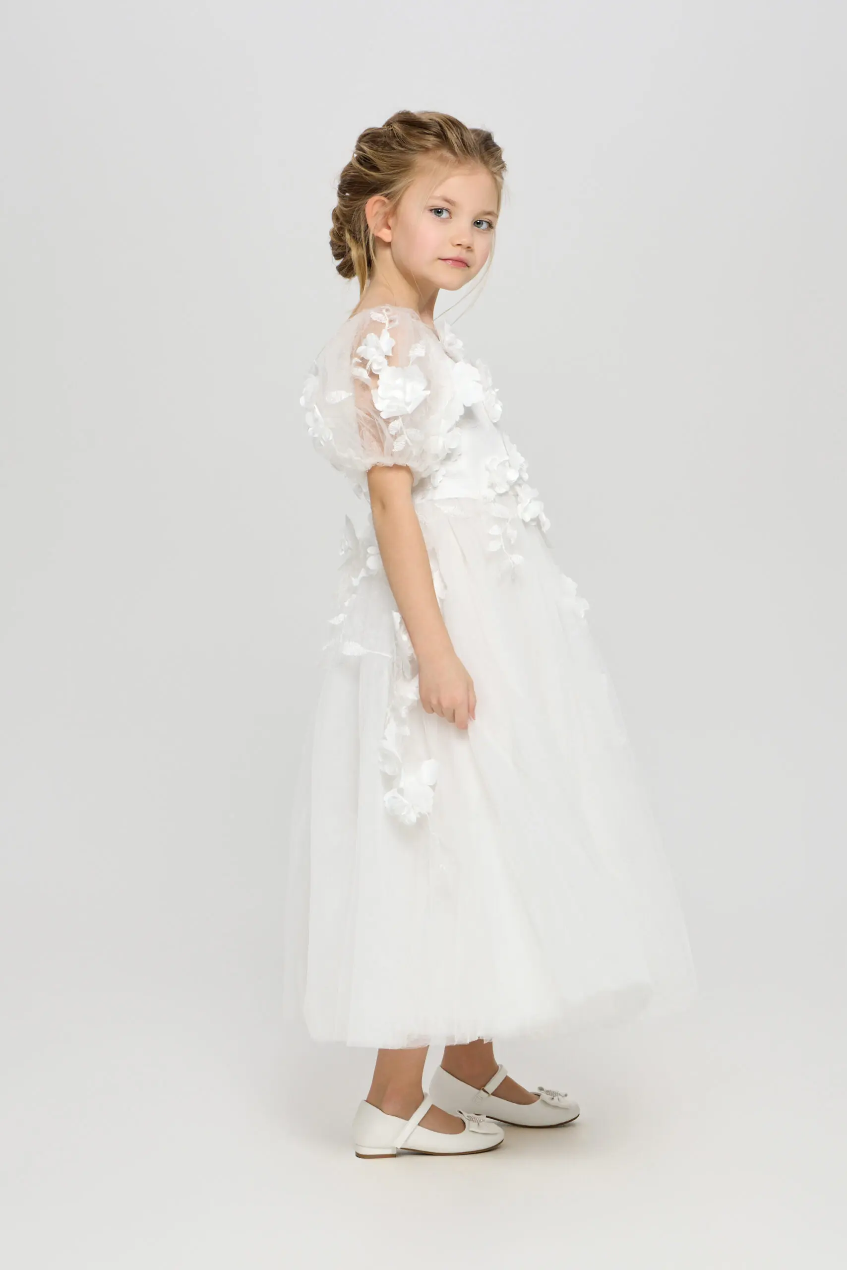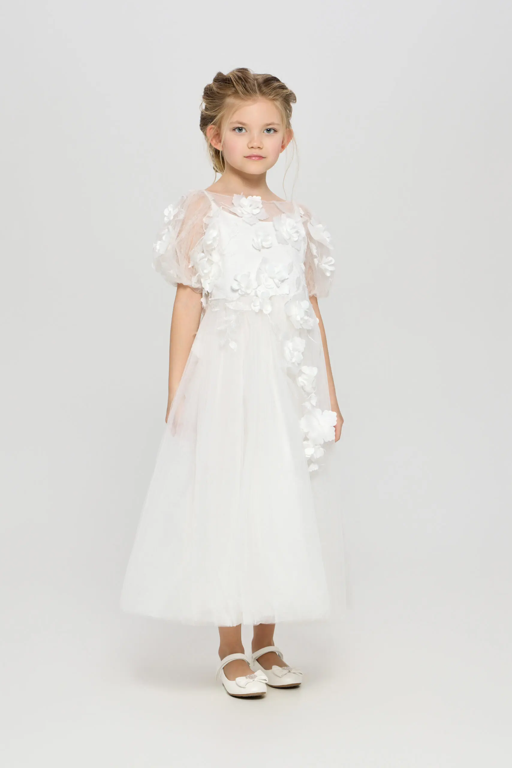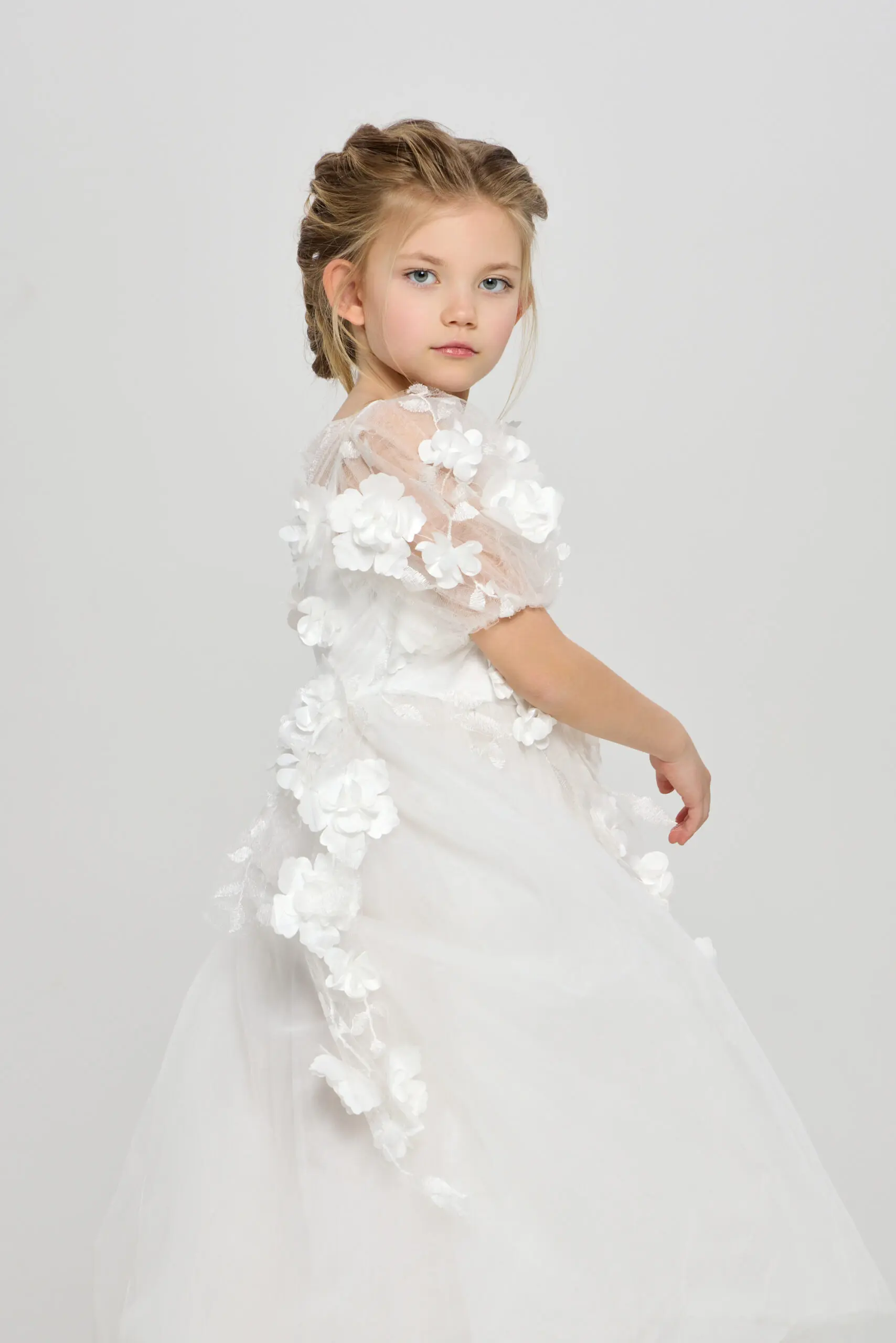 Длинное белое платье для девочки− идеальный вариант для тожественного мероприятия. Наряд с пышной юбкой и прозрачными рукавами-фонариками. Особенности модели: дизайнерский цветочный декор с 3D лепестками. Можно ... надевать это платье на любое торжество, дополнив образ симпатичным ободком и изящными туфельками. Это платье станет незабываемым атрибутом праздника, будь то выпускной в детском саду, день рождения или семейное торжество.