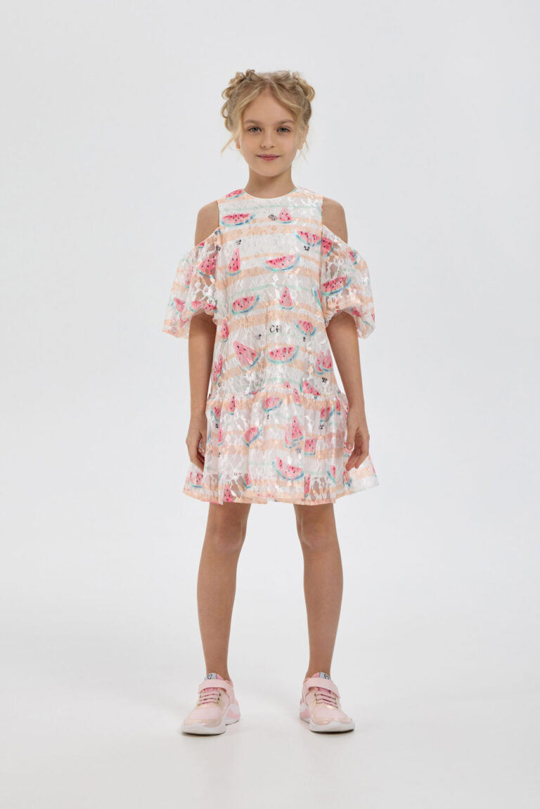 Стильное платье с актуальным рисунком для девочки станет идеальным выбором для летнего образа. Акцент на открытых плечах в его крое добавляет образу современности и утонченности. Модель ... отличается непринужденным, просторным кроем. Дизайнерский принт формирует уникальный художественный эффект, обеспечивая наряду индивидуальность. Кружевное полотно завершает создание прелестного силуэта.