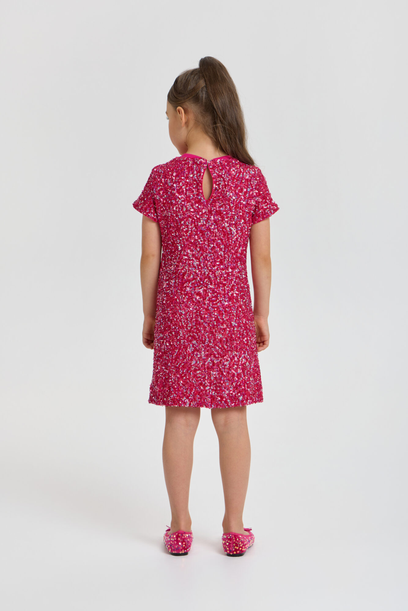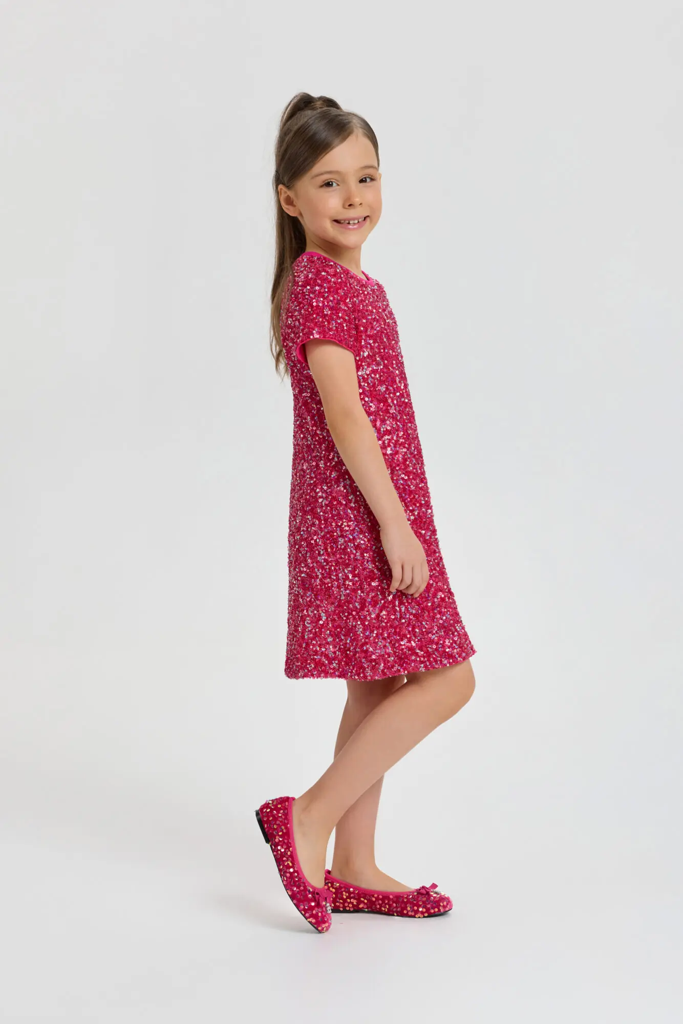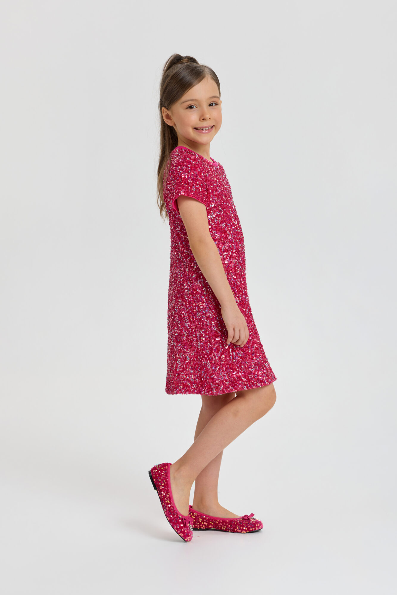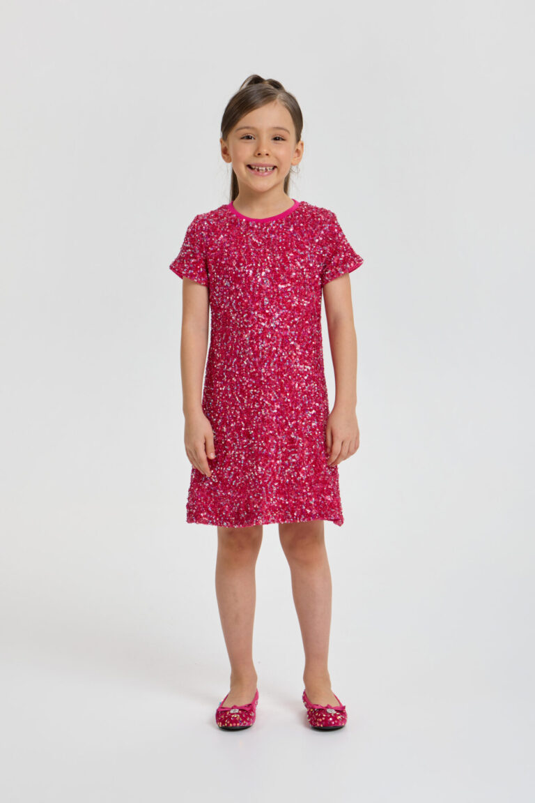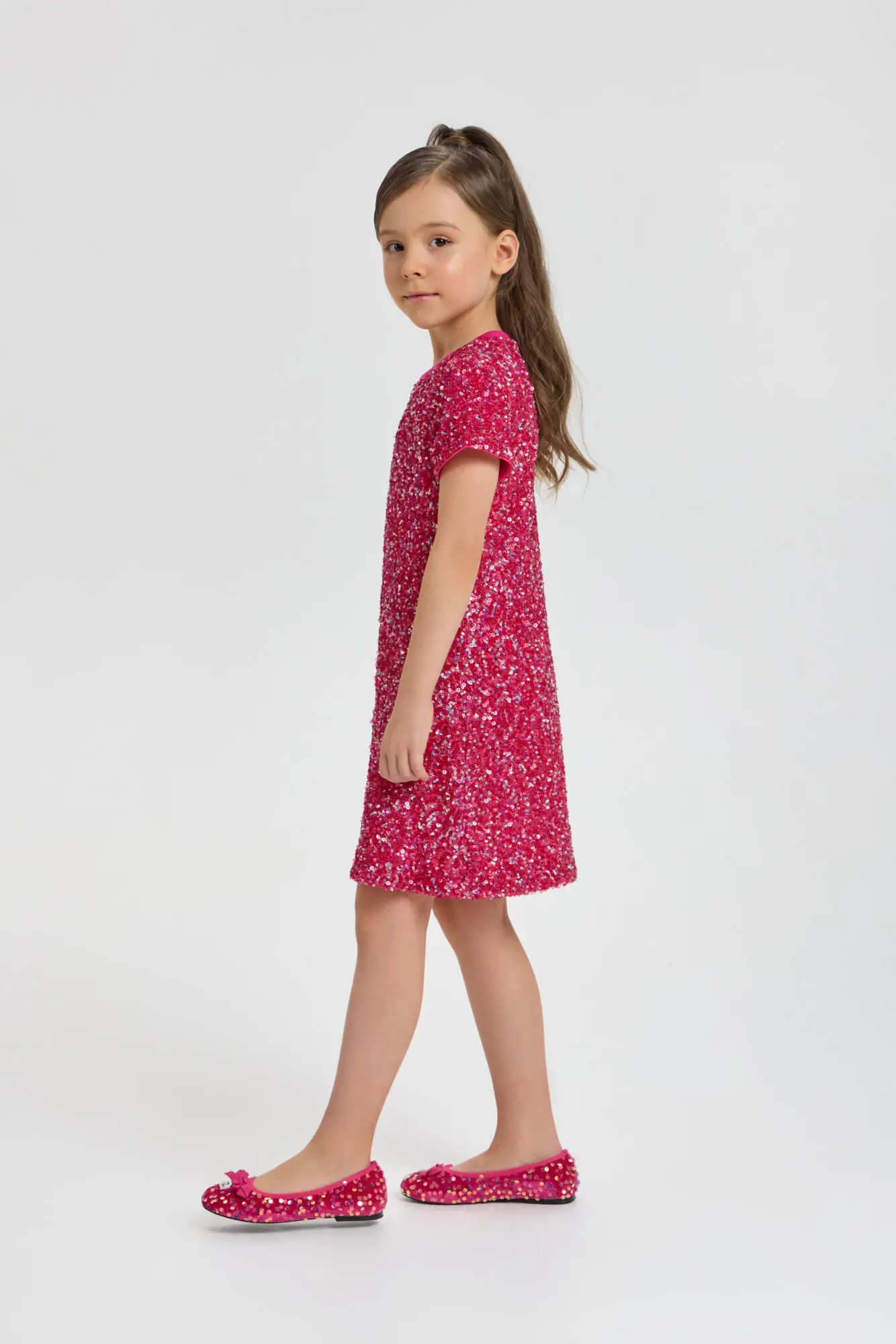 Очаровательное нарядное платье из пайеток для девочки идеально подходит для любого торжественного повода. Модель прямого кроя - трапеция. Рукава короткие. Благодаря мастерскому исполнению и безукоризненному качеству ... материалов, платье будет радовать свою обладательницу.