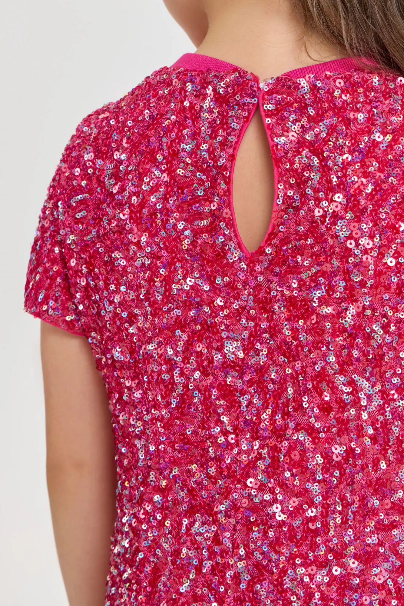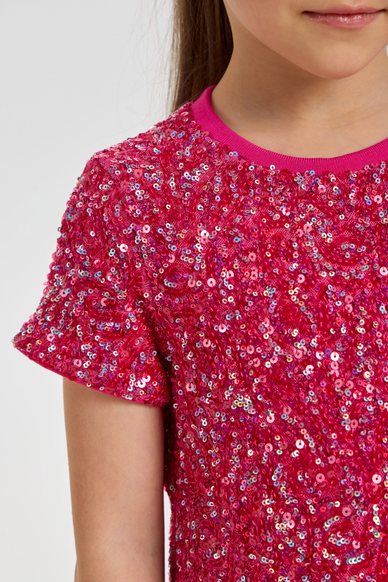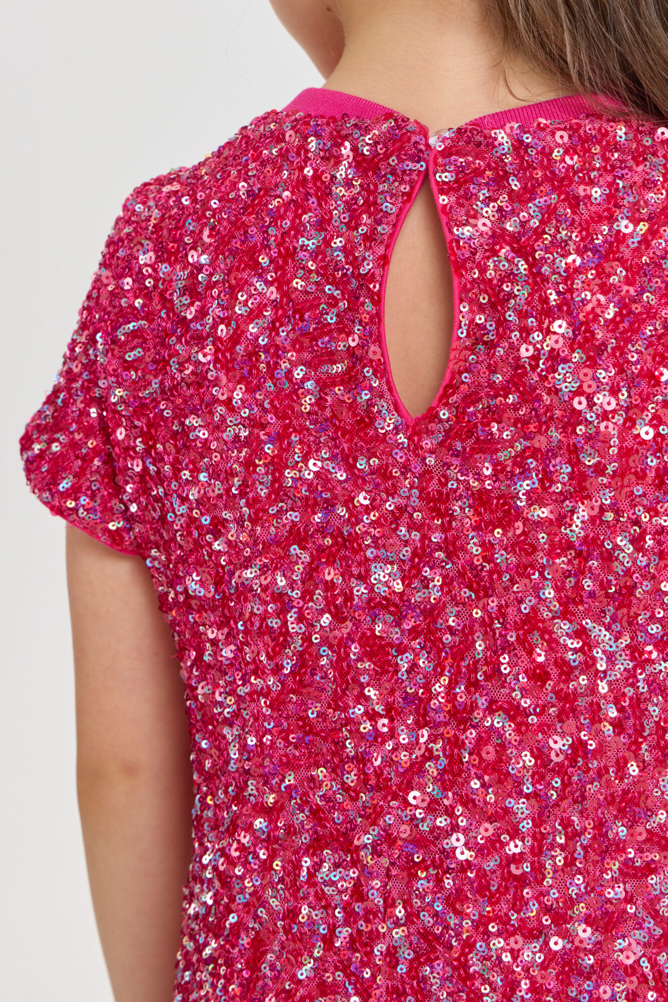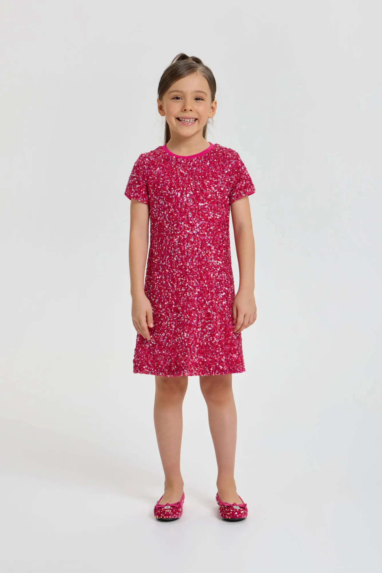 Очаровательное нарядное платье из пайеток для девочки идеально подходит для любого торжественного повода. Модель прямого кроя - трапеция. Рукава короткие. Благодаря мастерскому исполнению и безукоризненному качеству ... материалов, платье будет радовать свою обладательницу.