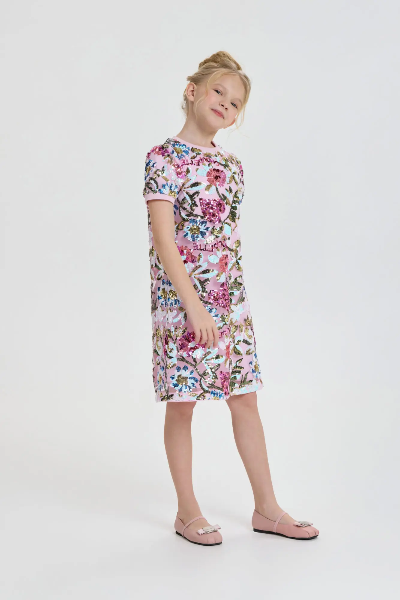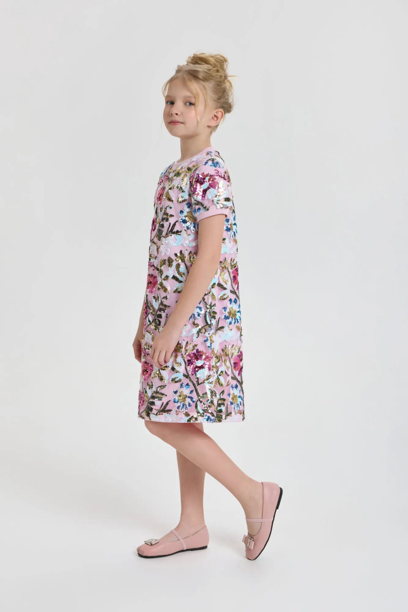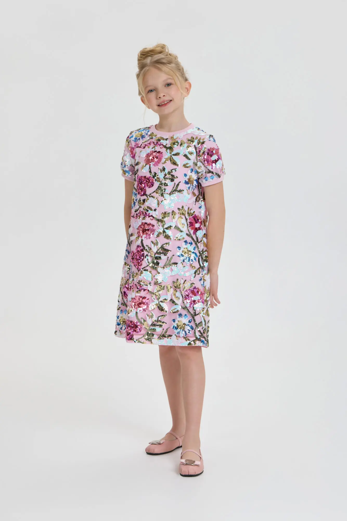Стильное платье для девочки отлично подойдет как для повседневного использования, так и для праздничного мероприятия. Силуэт платья имеет форму трапеции. Короткие рукава и округлый вырез обработаны ... эластичной тесьмой. Оригинальный рисунок и блестящие пайетки, придают платью неповторимый шарм. Благодаря современному стилю и высококачественным материалам, это платье позволит девочке создать неподражаемый образ на любом торжестве. Наряд отлично сочетается как с классической обувью, так и с современными кроссовками. Завершить образ помогут стильные украшения.