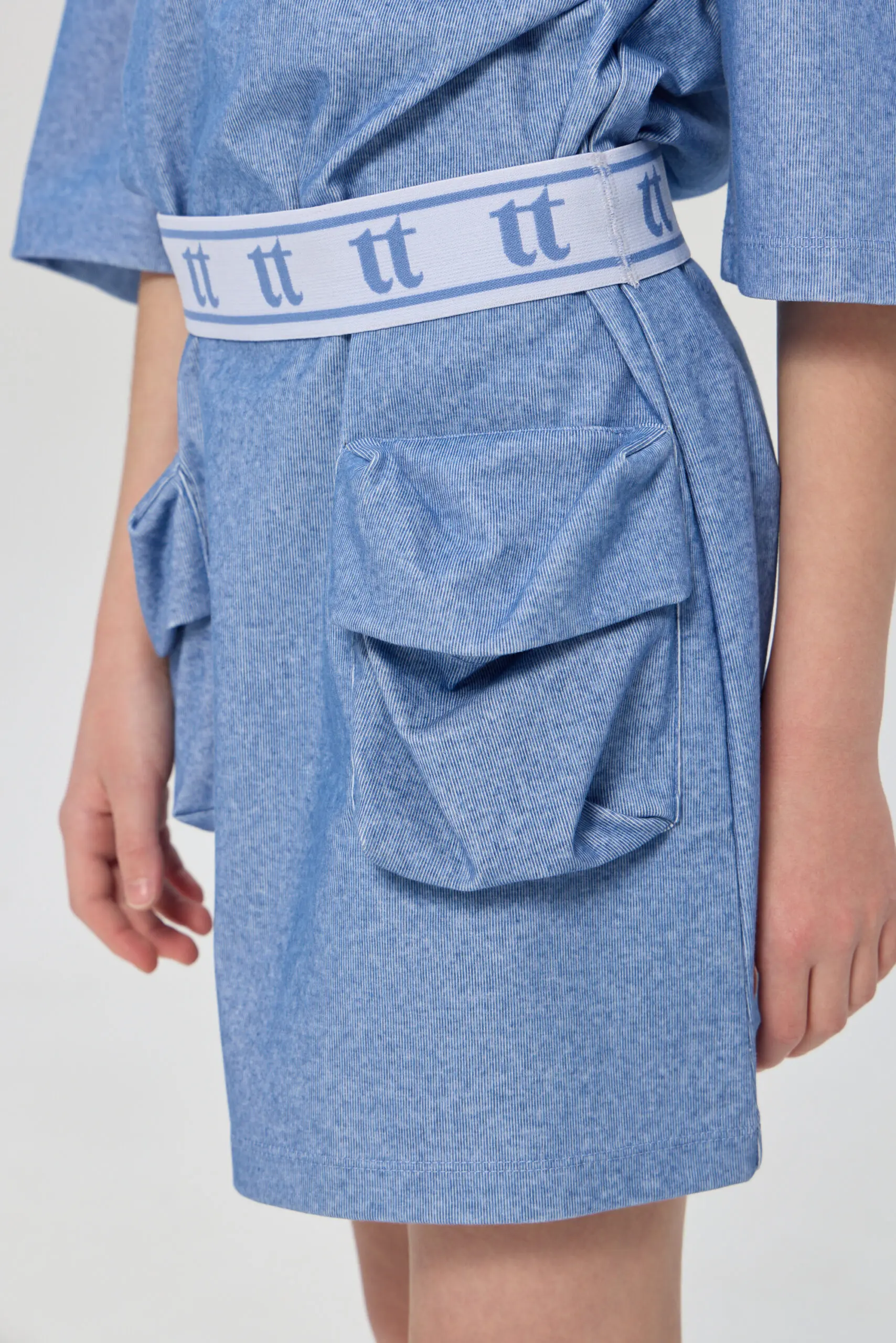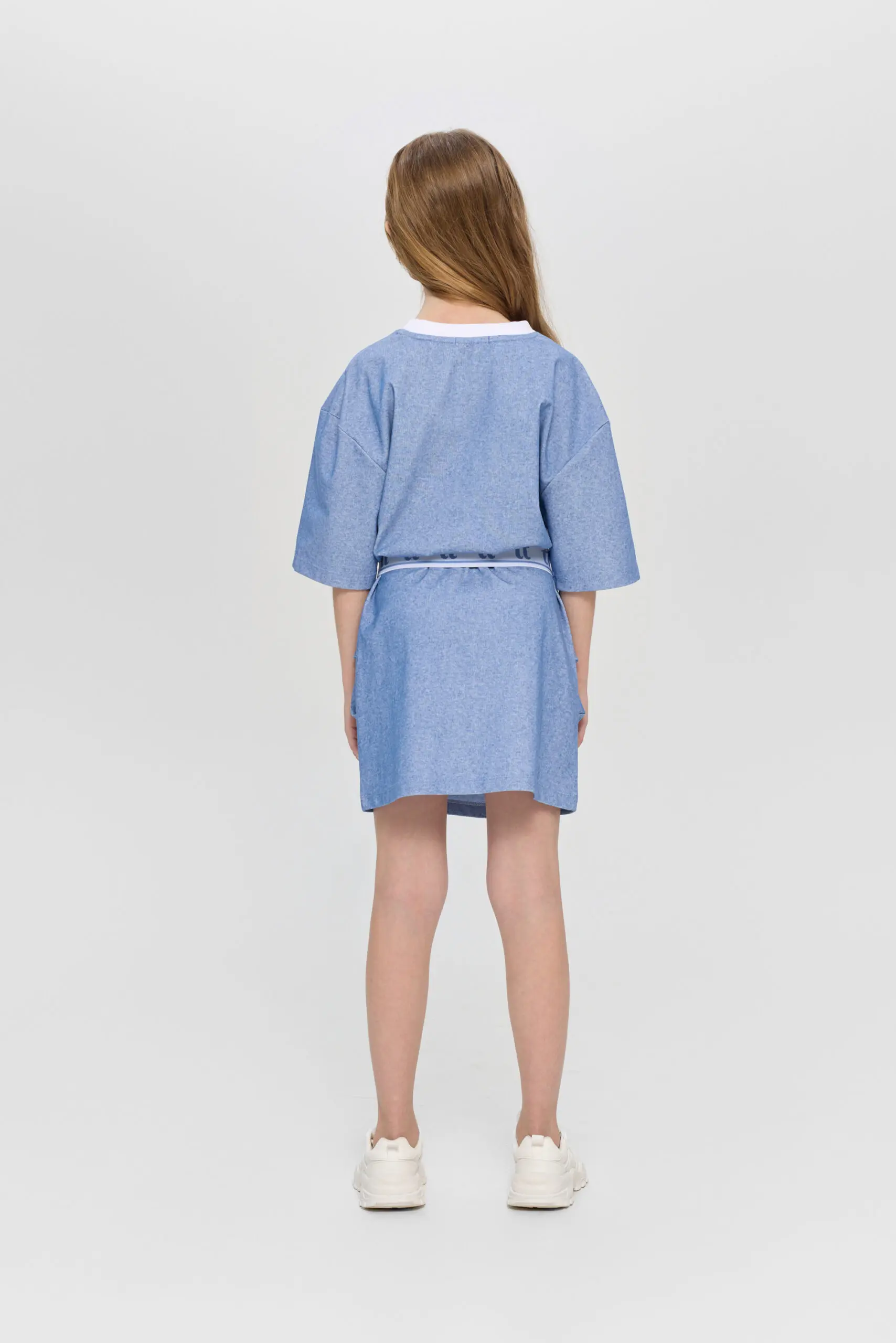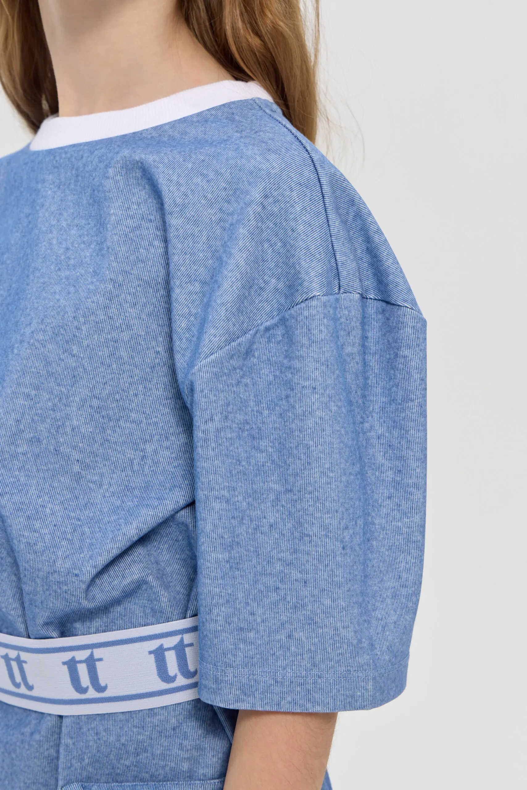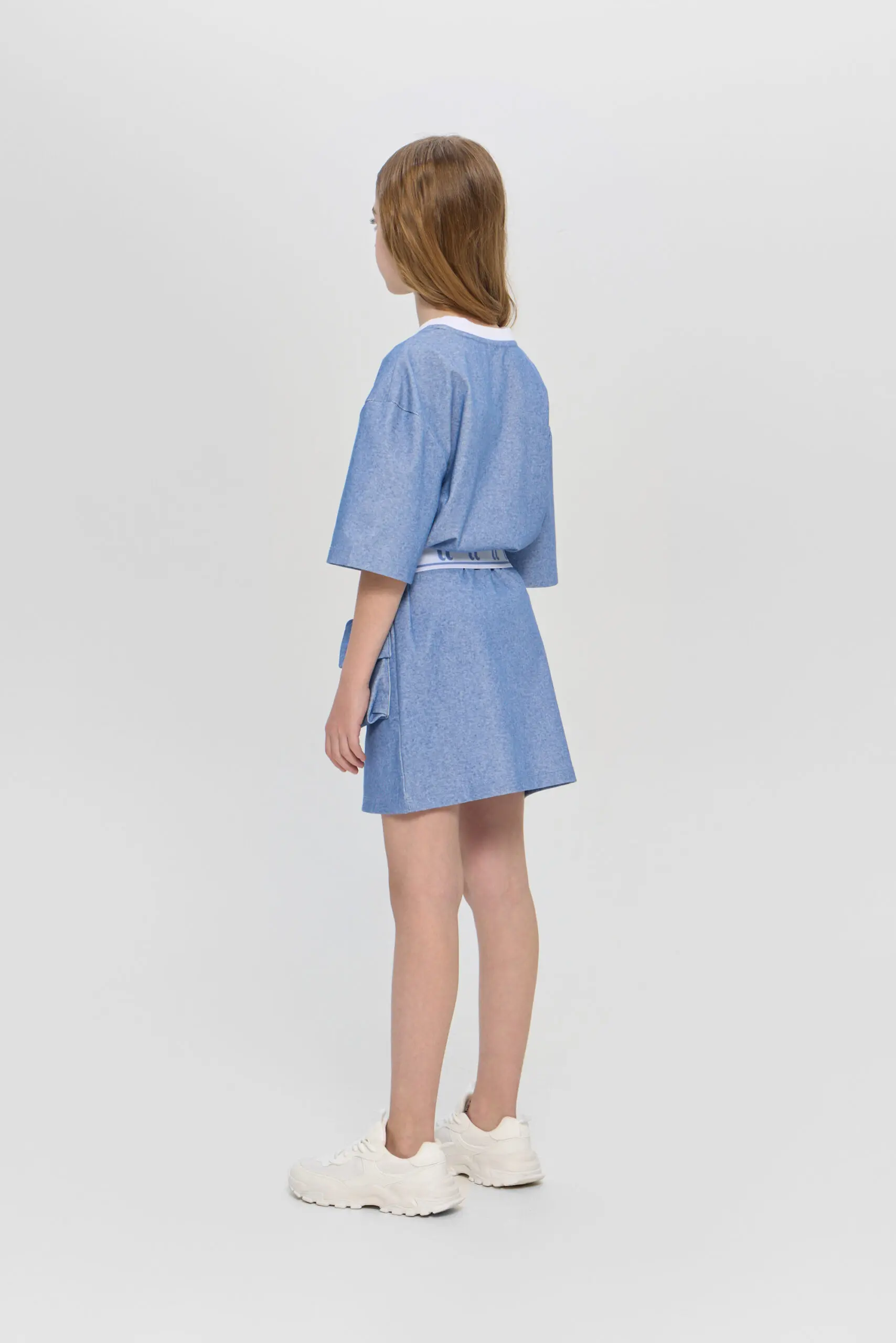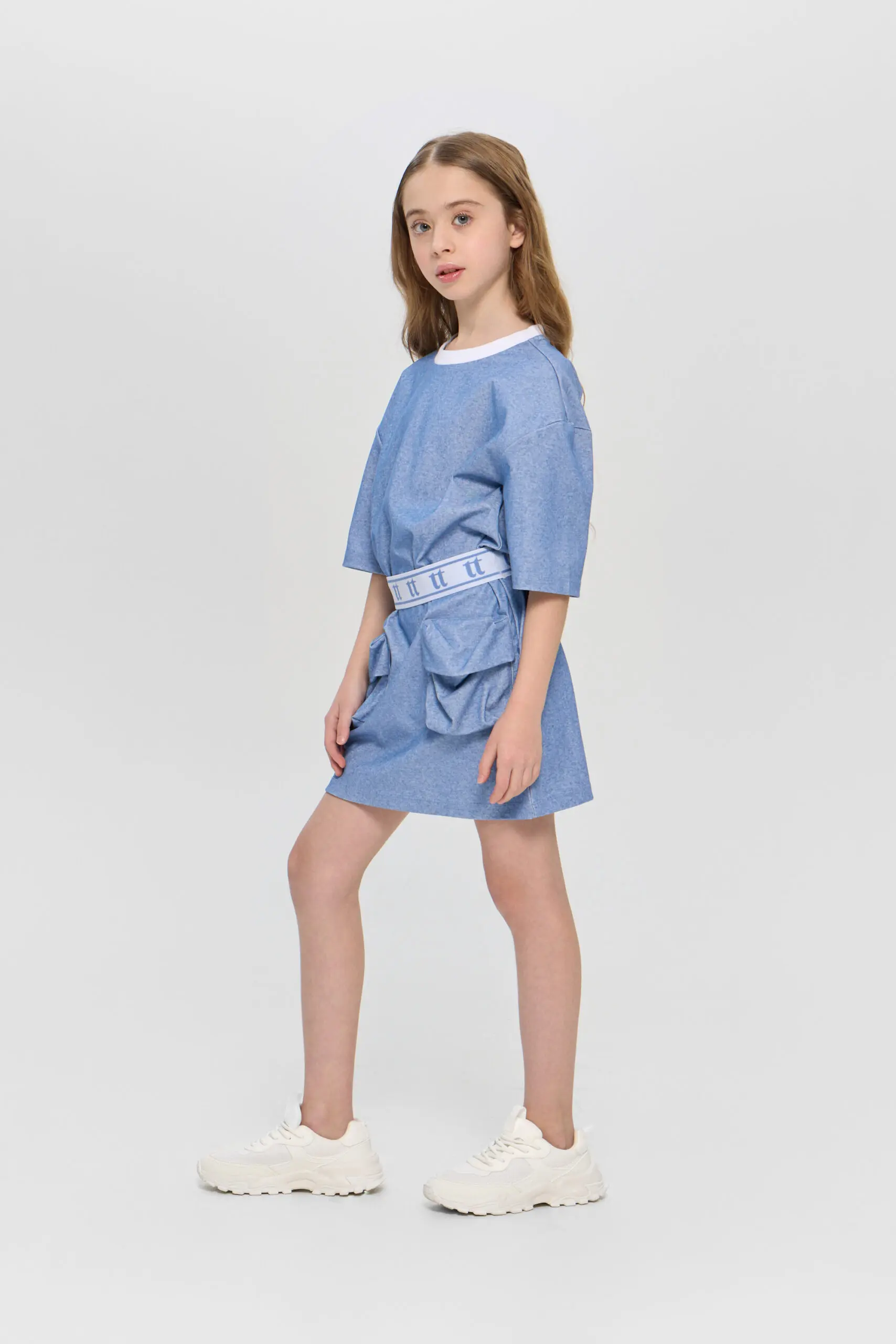 Платья в стиле спорт-шик пользуются заслуженной любовью как детей, так и их родителей. Трикотажное платье с эффектом варки без сомнения, станет любимым предметом гардероба для девочек, ... ценящих практичные и удобные вещи. Модель имеет прямой силуэт и длину мини. Рукава длиной три четверти. Круглый вырез горловины обработан контрастной окантовкой. Главным акцентом платья являются накладные объемные карманы и эластичный пояс с буквенным принтом.