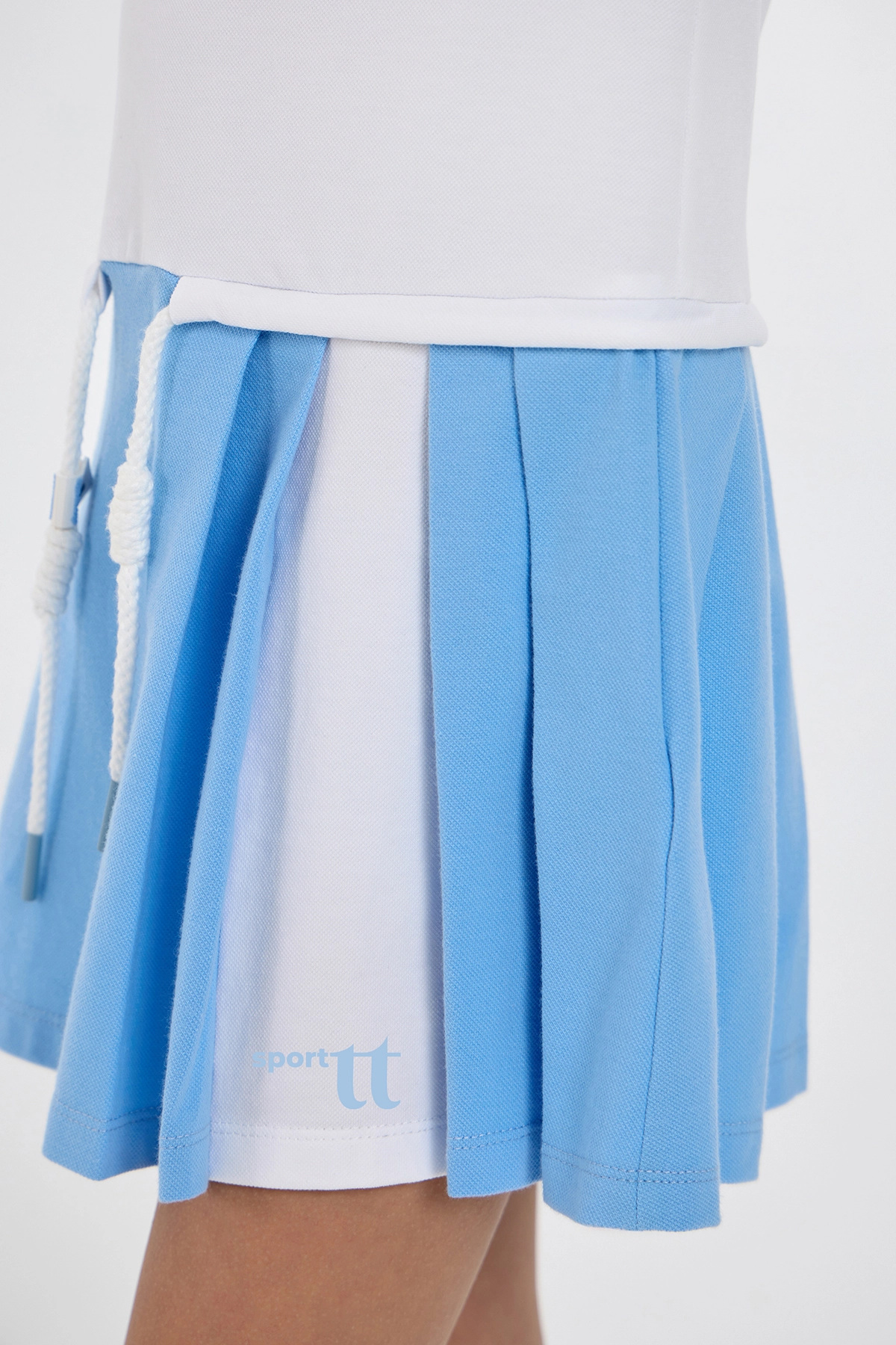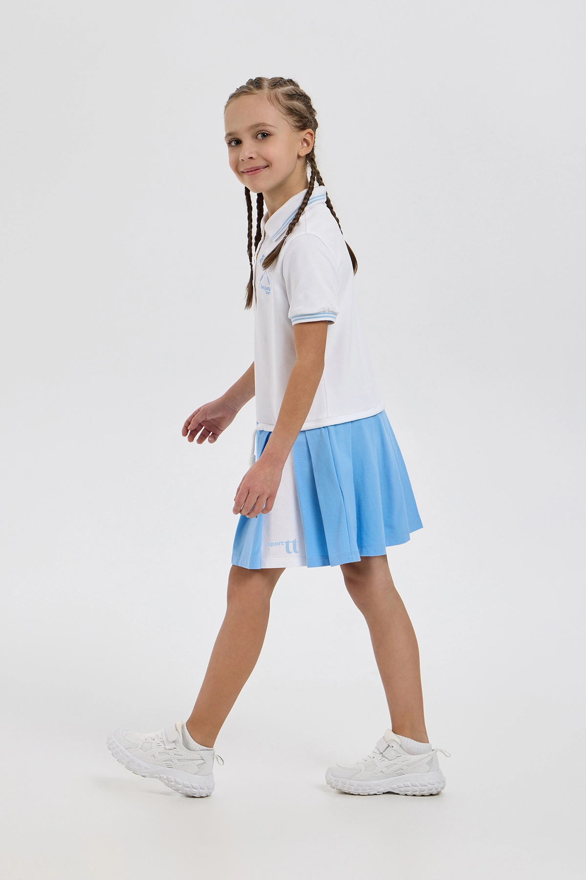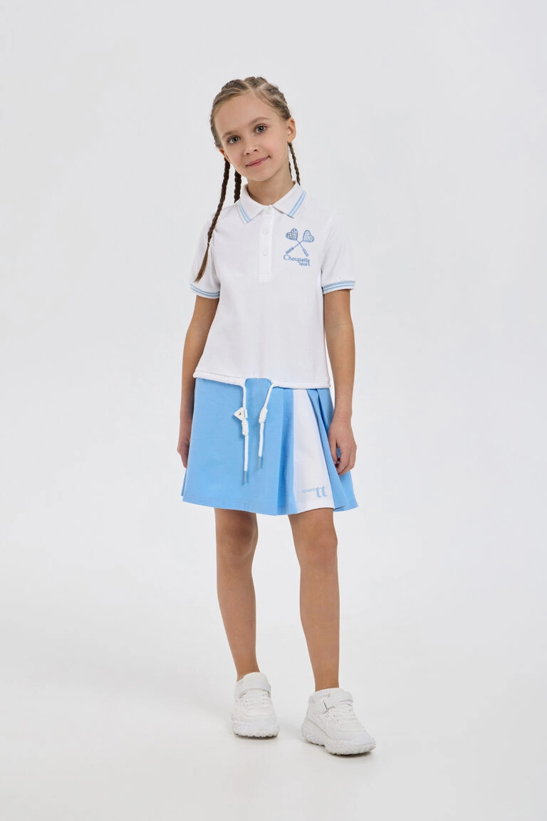 Элегантное платье-поло спортивного кроя для девочек — превосходный выбор для тенниса, танцев и повседневной носки. Изделие прямого покроя выполнено из мягкого воздухопроницаемого трикотажа, гарантирующего удобство как ... во время тренировок, так и в обычной жизни. Классический отложной воротник-поло и планка с пуговицами придают изделию аккуратный и спортивно-элегантный вид, а контрастная голубая отделка на воротнике и рукавах добавляет образу свежести. Поло дополнено аккуратной вышивкой изображающей теннисные ракетки со стразами. Наличие кулиски с регулировкой чуть ниже линии талии помогает идеально подогнать объём по фигуре. Платье отлично комбинируется с различными видами спортивной обуви и аксессуарами.