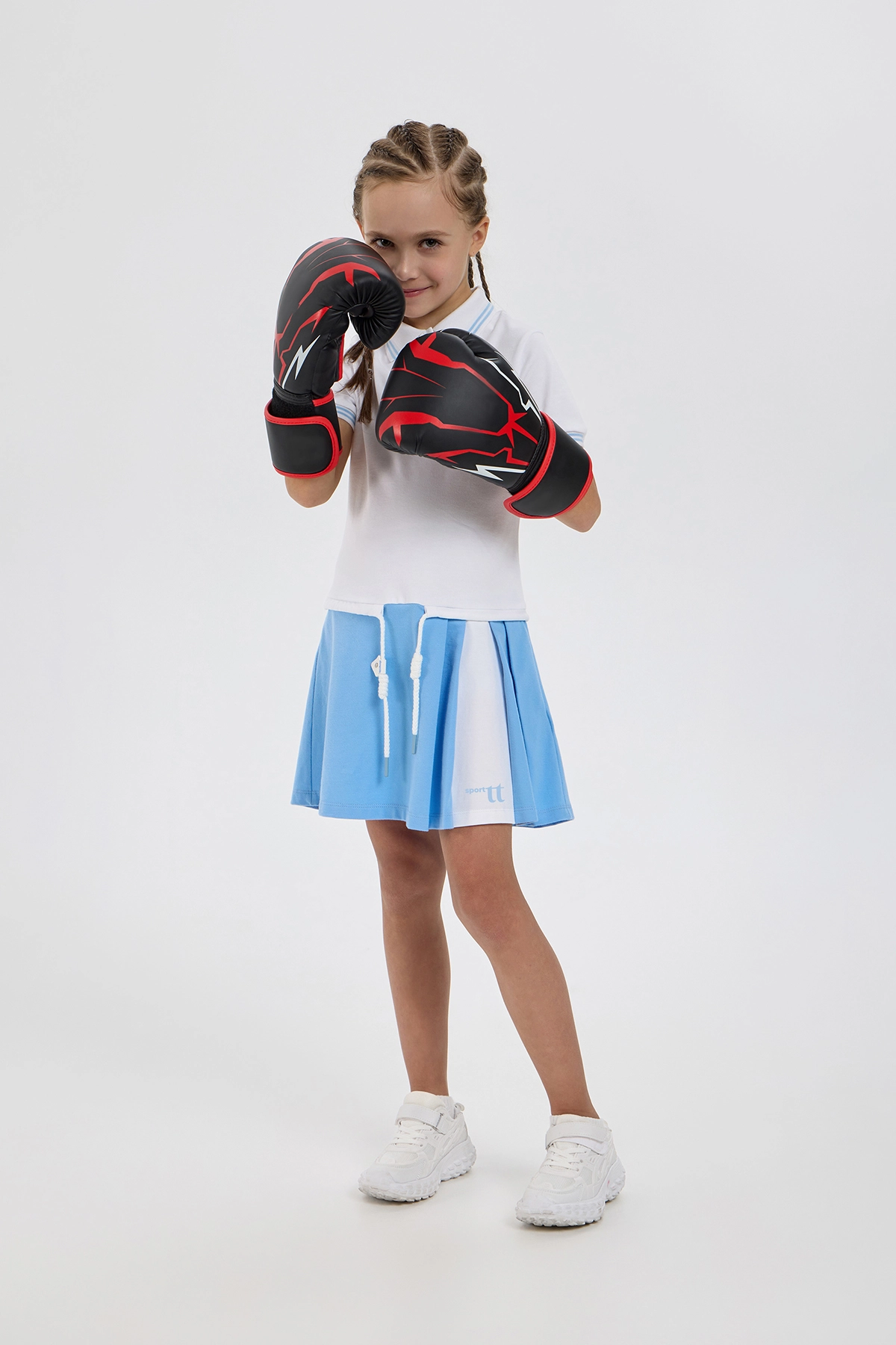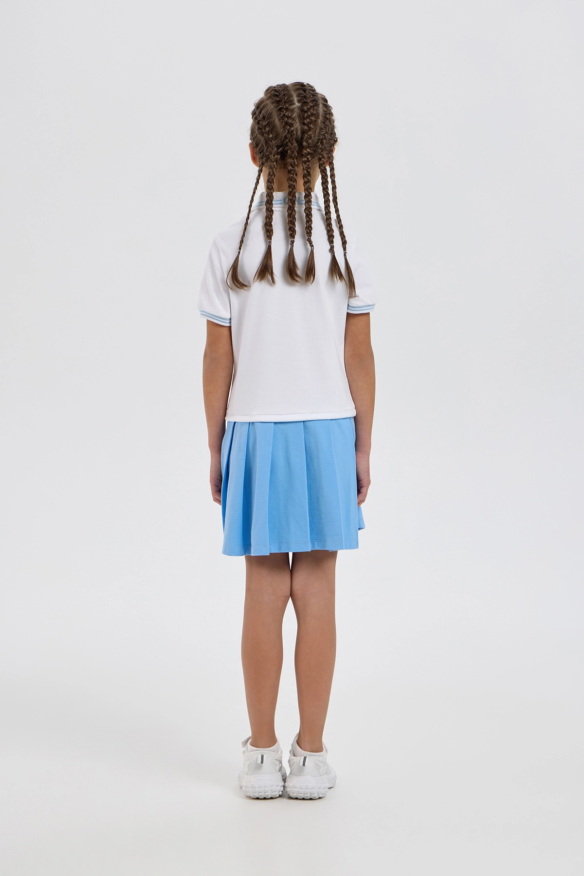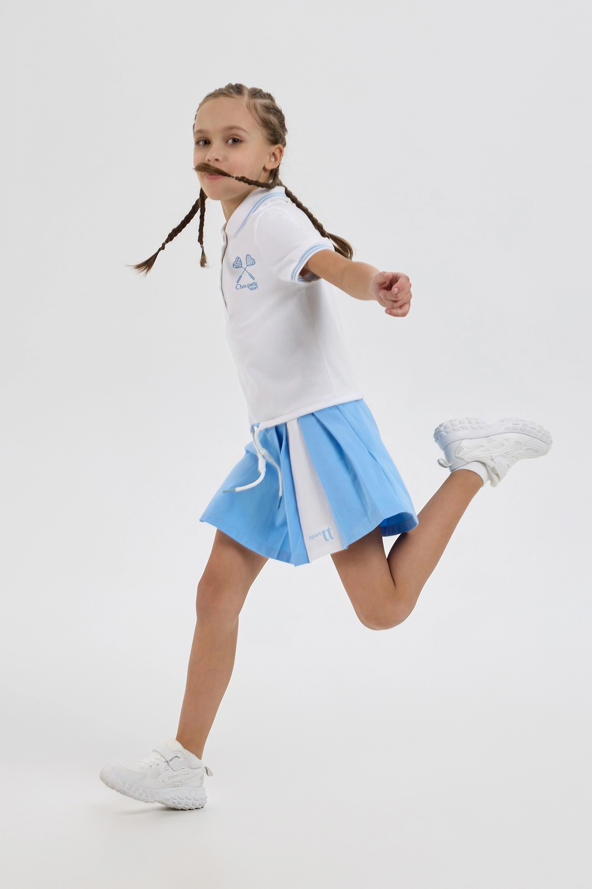 Элегантное платье-поло спортивного кроя для девочек — превосходный выбор для тенниса, танцев и повседневной носки. Изделие прямого покроя выполнено из мягкого воздухопроницаемого трикотажа, гарантирующего удобство как ... во время тренировок, так и в обычной жизни. Классический отложной воротник-поло и планка с пуговицами придают изделию аккуратный и спортивно-элегантный вид, а контрастная голубая отделка на воротнике и рукавах добавляет образу свежести. Поло дополнено аккуратной вышивкой изображающей теннисные ракетки со стразами. Наличие кулиски с регулировкой чуть ниже линии талии помогает идеально подогнать объём по фигуре. Платье отлично комбинируется с различными видами спортивной обуви и аксессуарами.