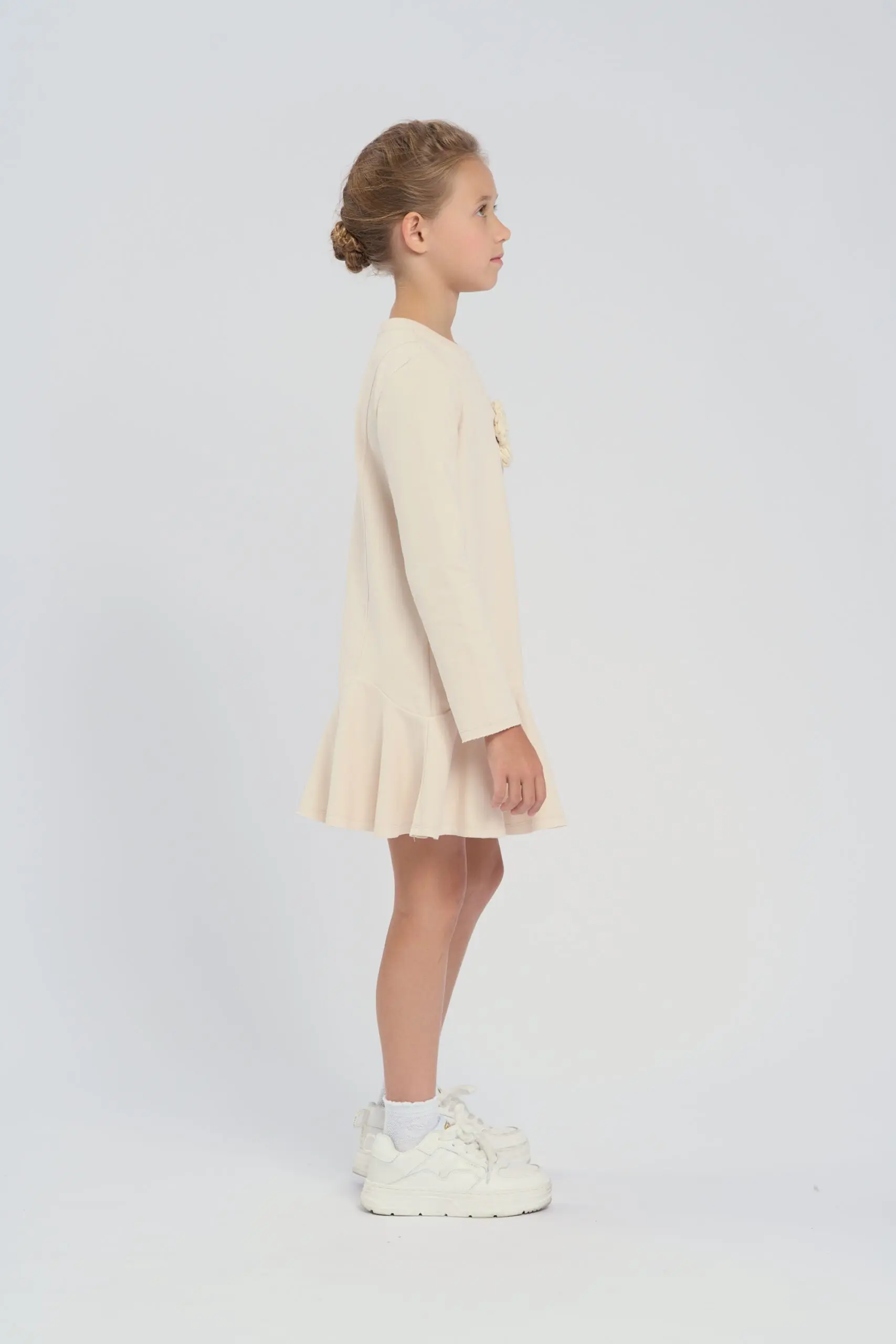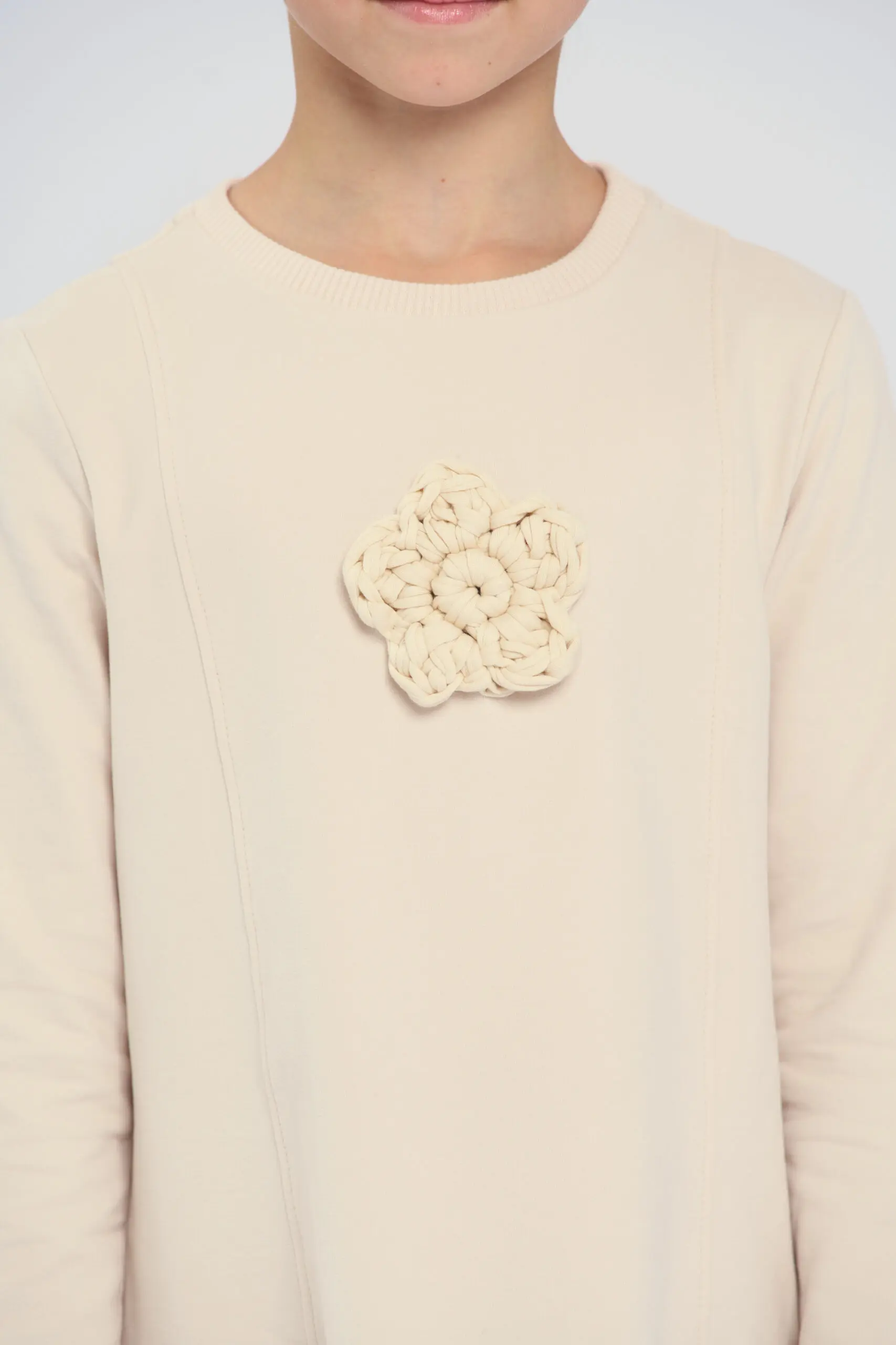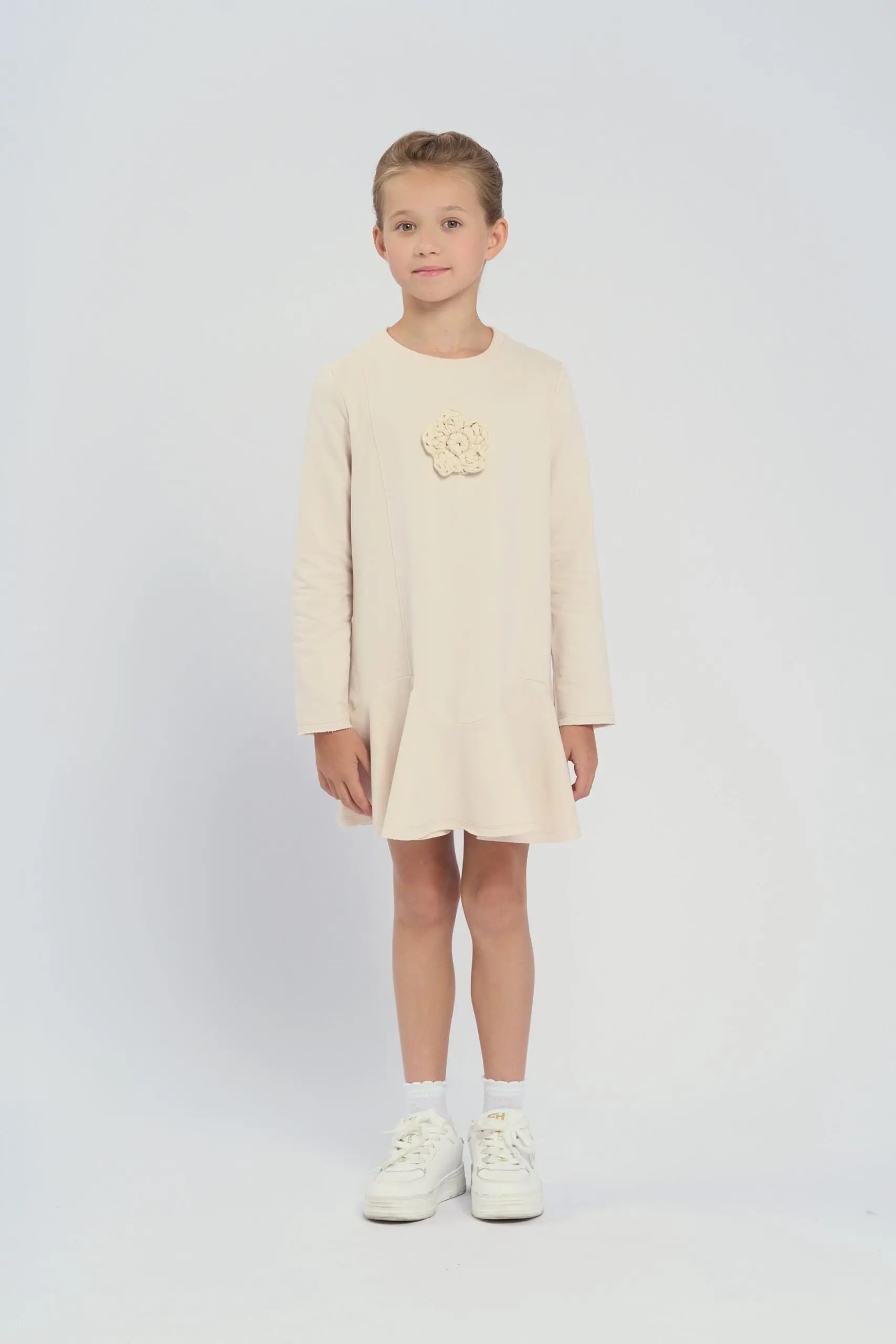 Трикотажное платье изготовлено из футера красивого бежевого оттенка. Модель с широким воланом по краю. Круглый вырез горловины и комфортный свободный силуэт гарантируют ребенку комфорт, поэтому платье ... подходит для повседневного гардероба и активной носки. Объемный вязаный цветок, расположенный по центру платья, служит эффектным украшением дизайна. Качественная смесовая ткань обладает хорошей эластичностью, не растягивается и быстро восстанавливает форму.