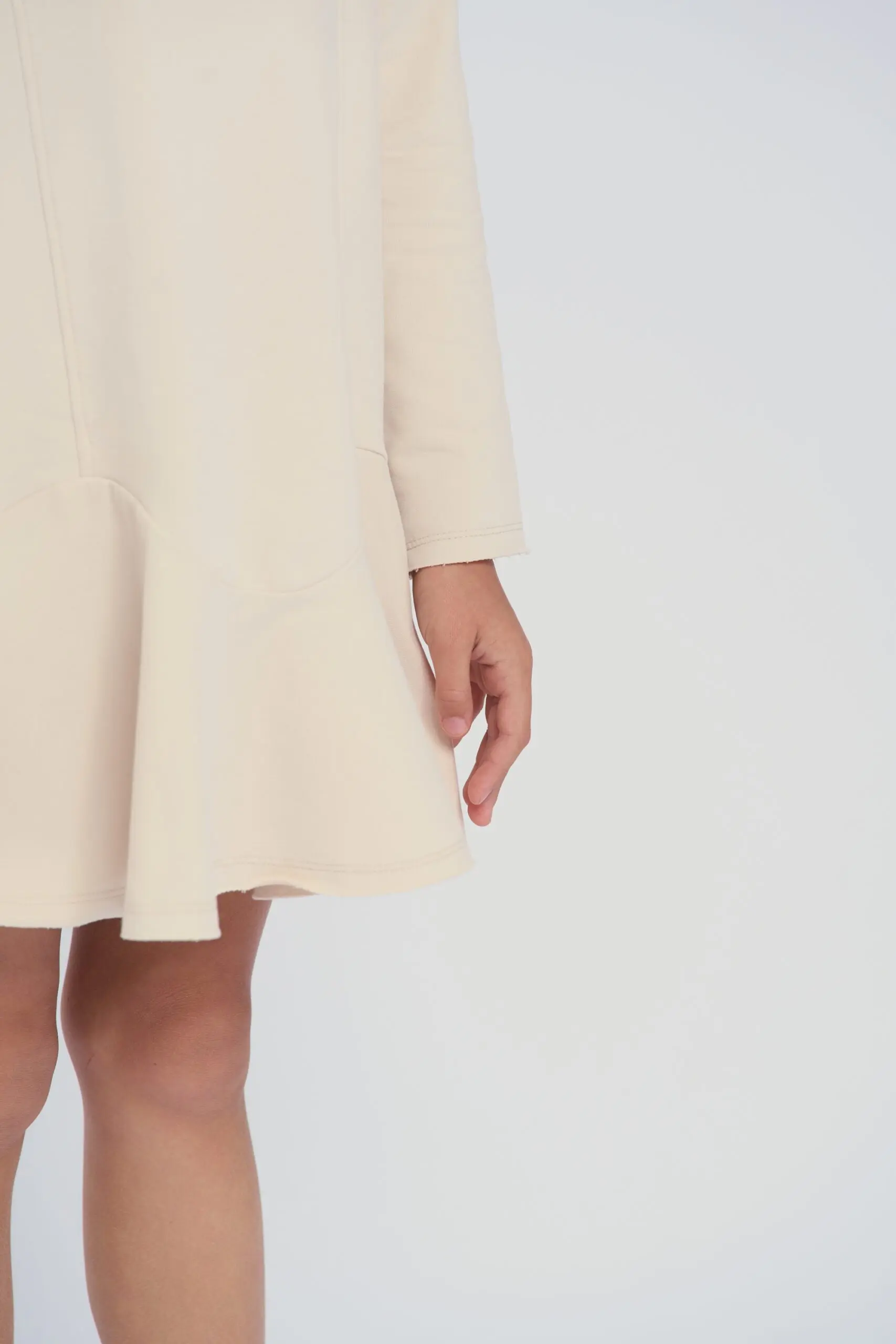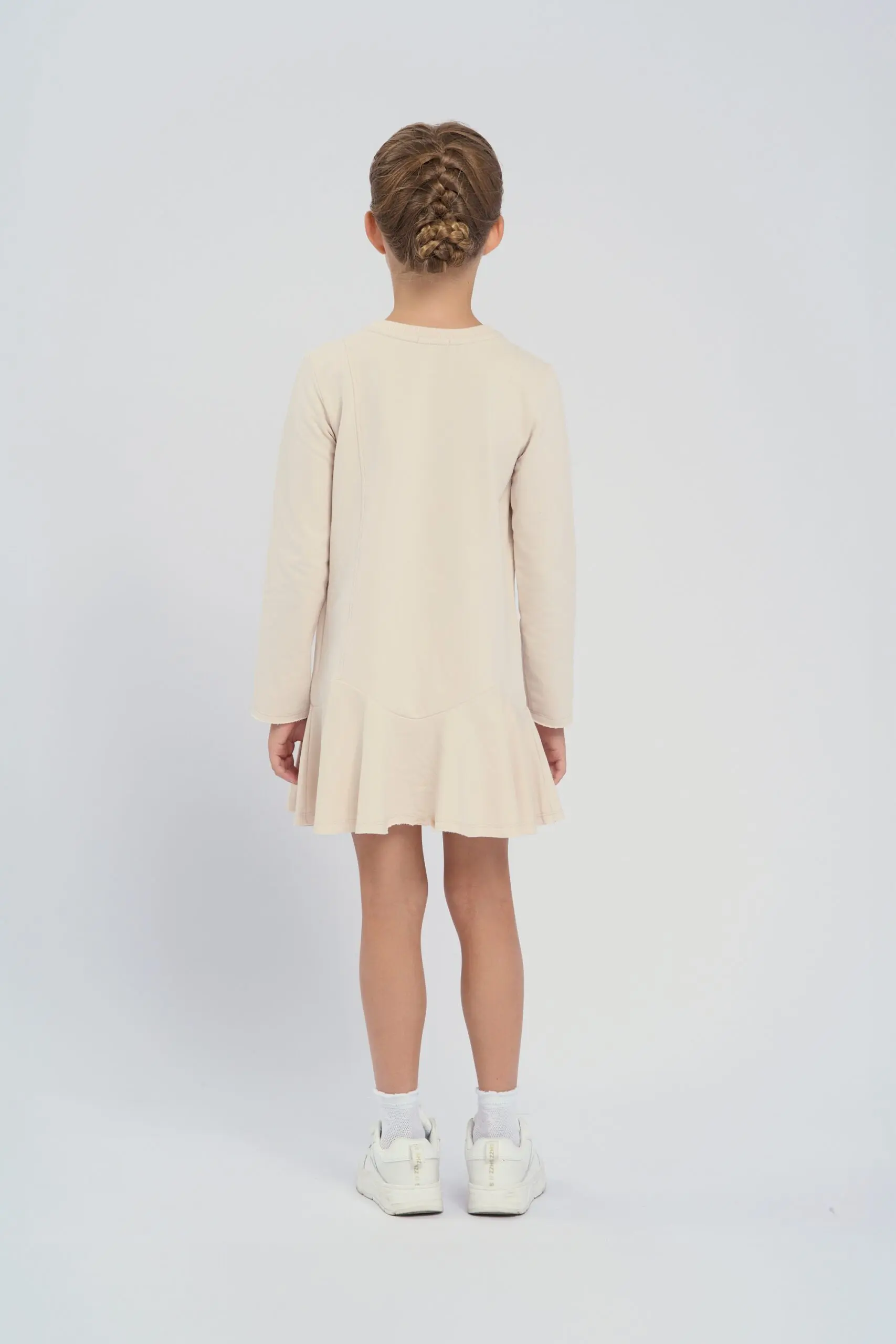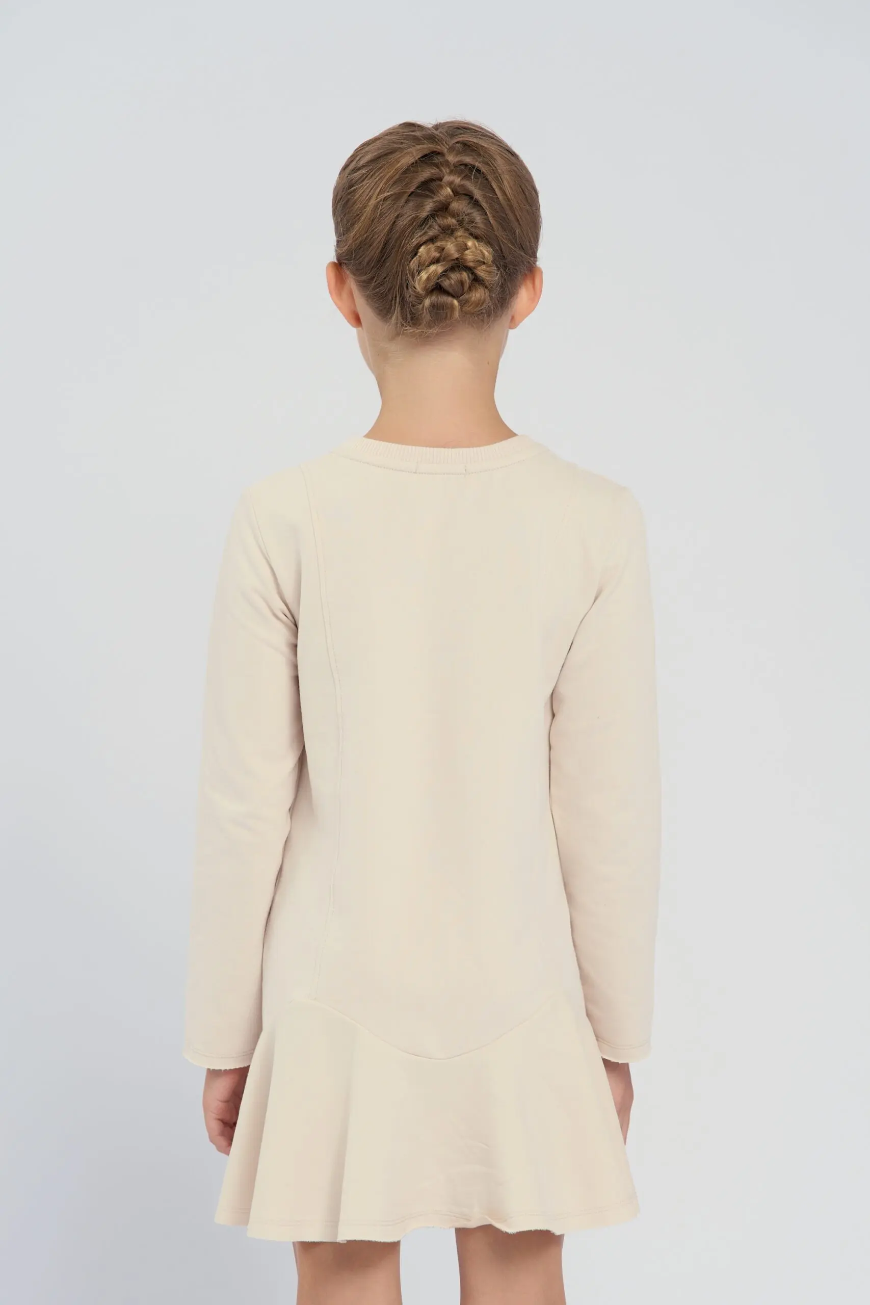 Трикотажное платье изготовлено из футера красивого бежевого оттенка. Модель с широким воланом по краю. Круглый вырез горловины и комфортный свободный силуэт гарантируют ребенку комфорт, поэтому платье ... подходит для повседневного гардероба и активной носки. Объемный вязаный цветок, расположенный по центру платья, служит эффектным украшением дизайна. Качественная смесовая ткань обладает хорошей эластичностью, не растягивается и быстро восстанавливает форму.