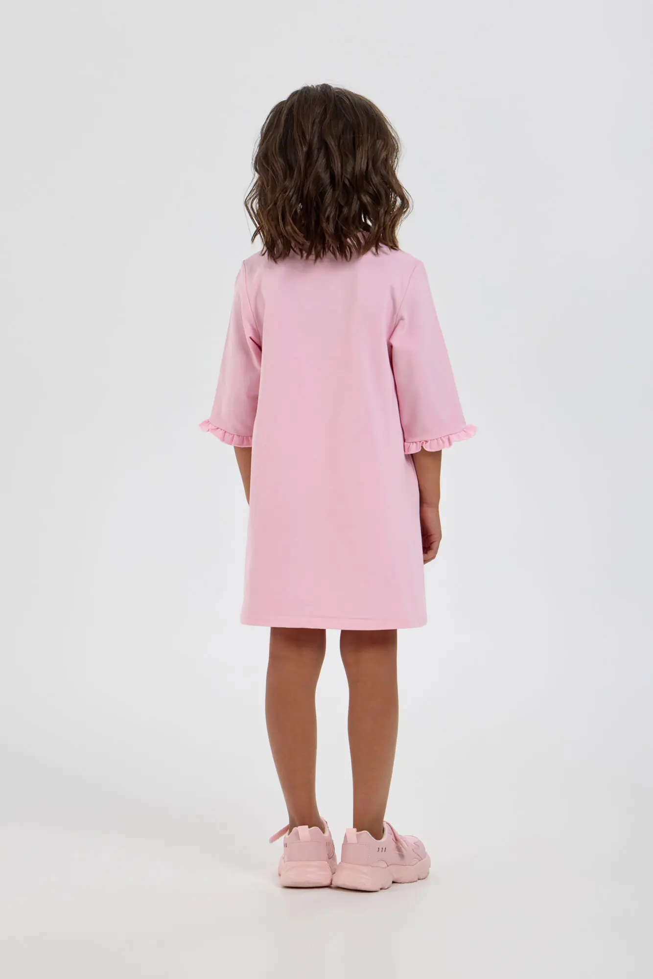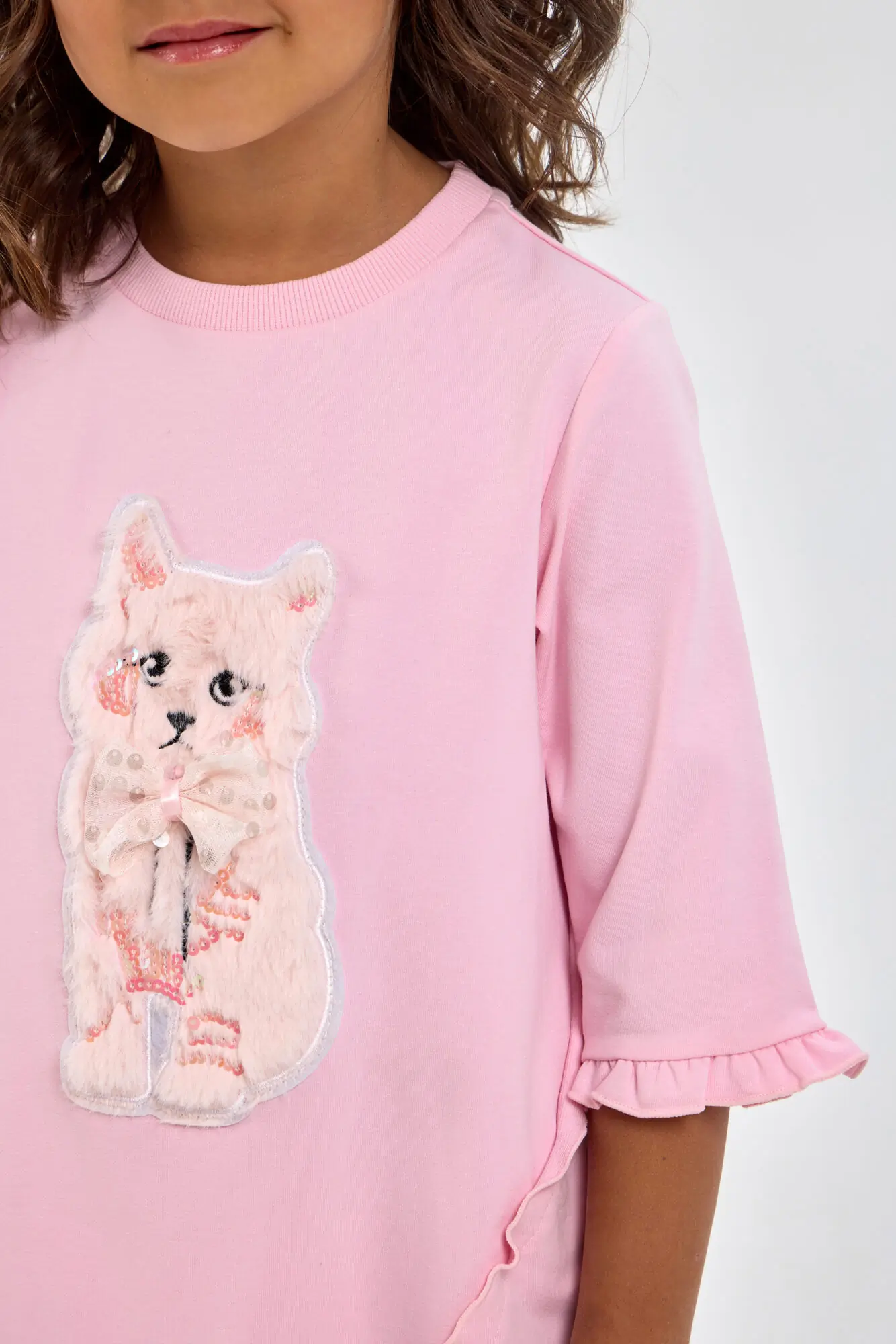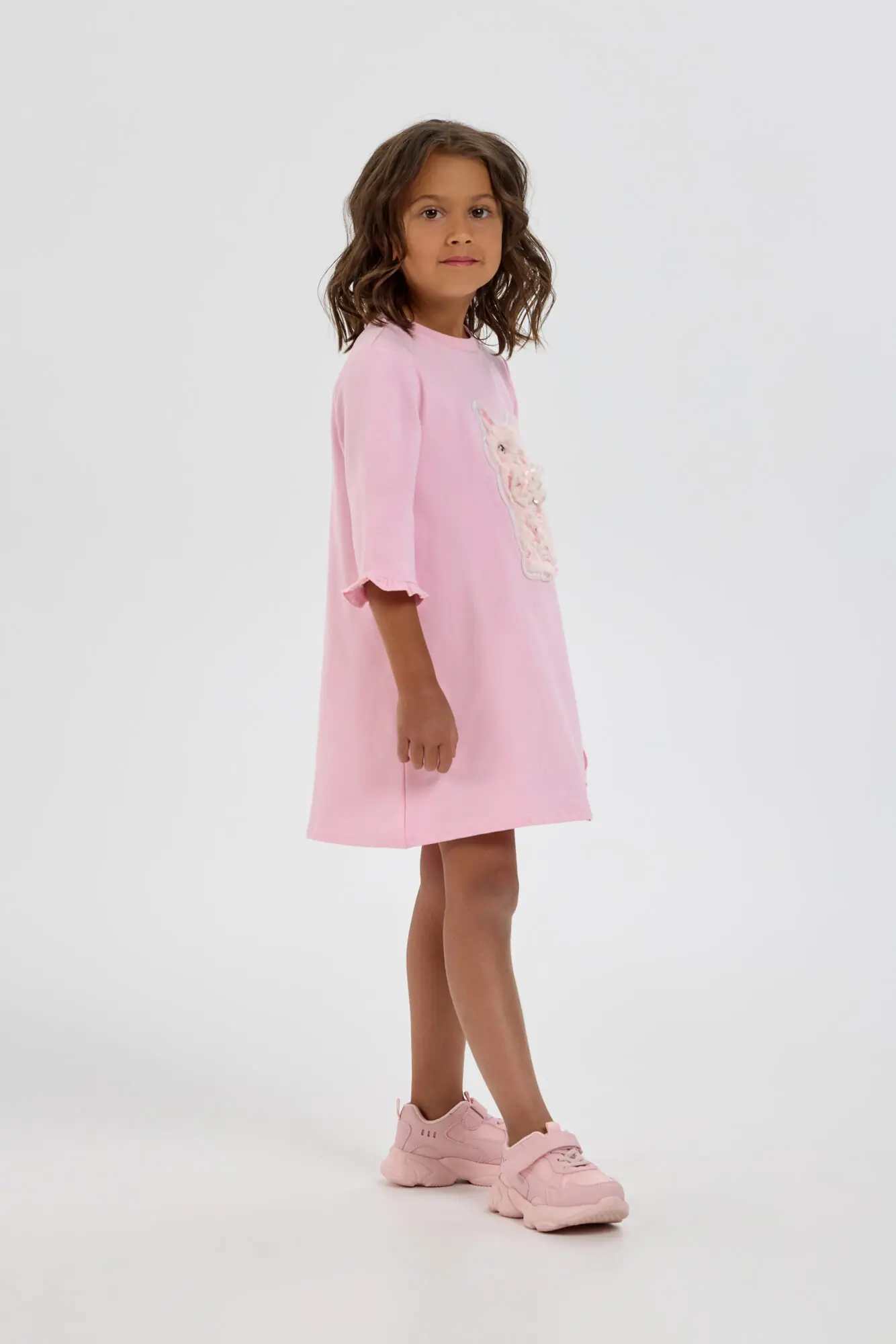 Оригинальное платье для девочки, выполненное из трикотажа в пастельно-розовом оттенке. Фасон платья – свободный, рукава длинные. Горловина круглой формы аккуратно обработана окантовкой. Особую привлекательность платью придает ... объемная декоративная аппликация и асимметричная оборка. Благодаря оригинальному оформлению и ярким элементом декора, это платье станет отличным выбором как для обычных дней, так и для праздничных событий.