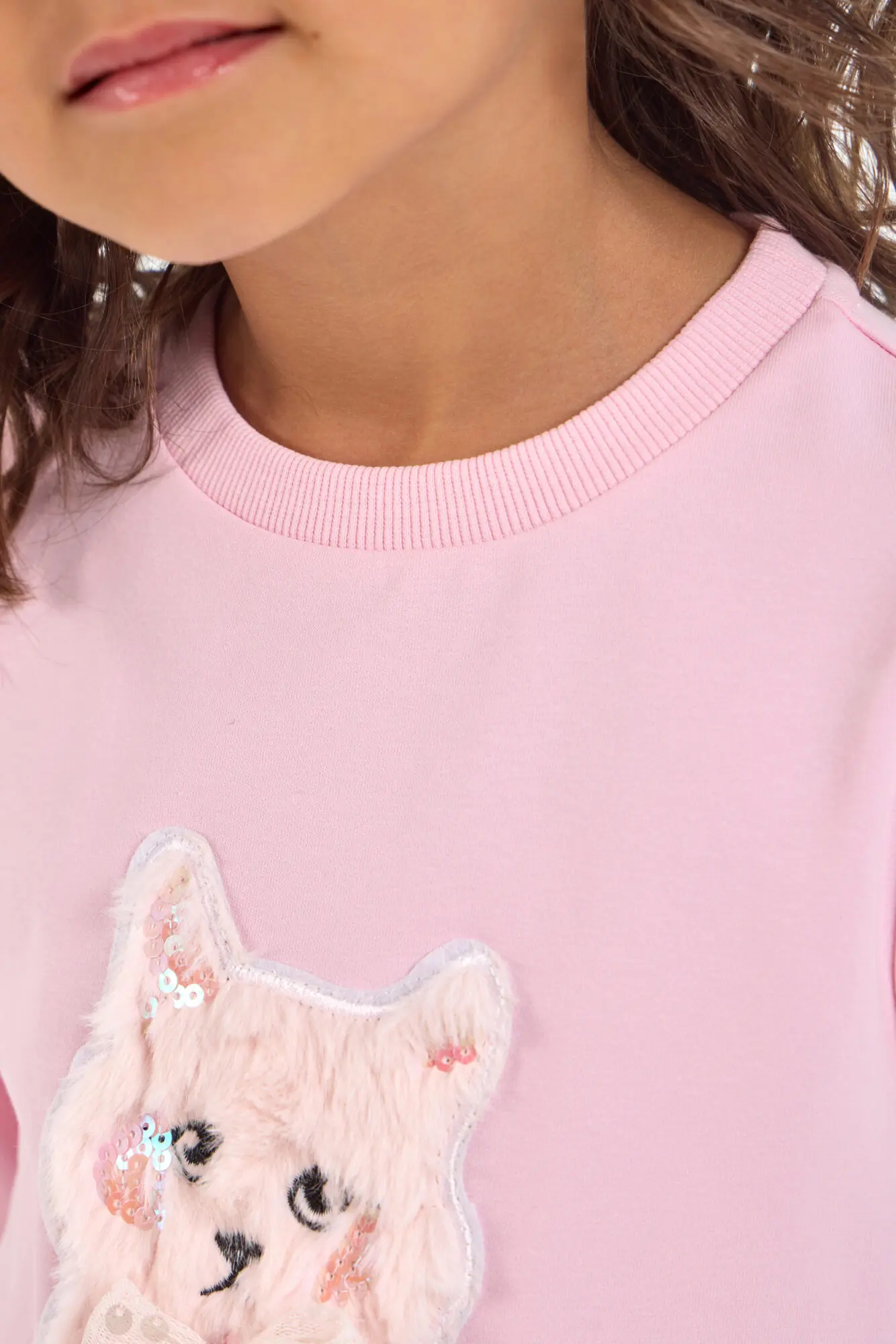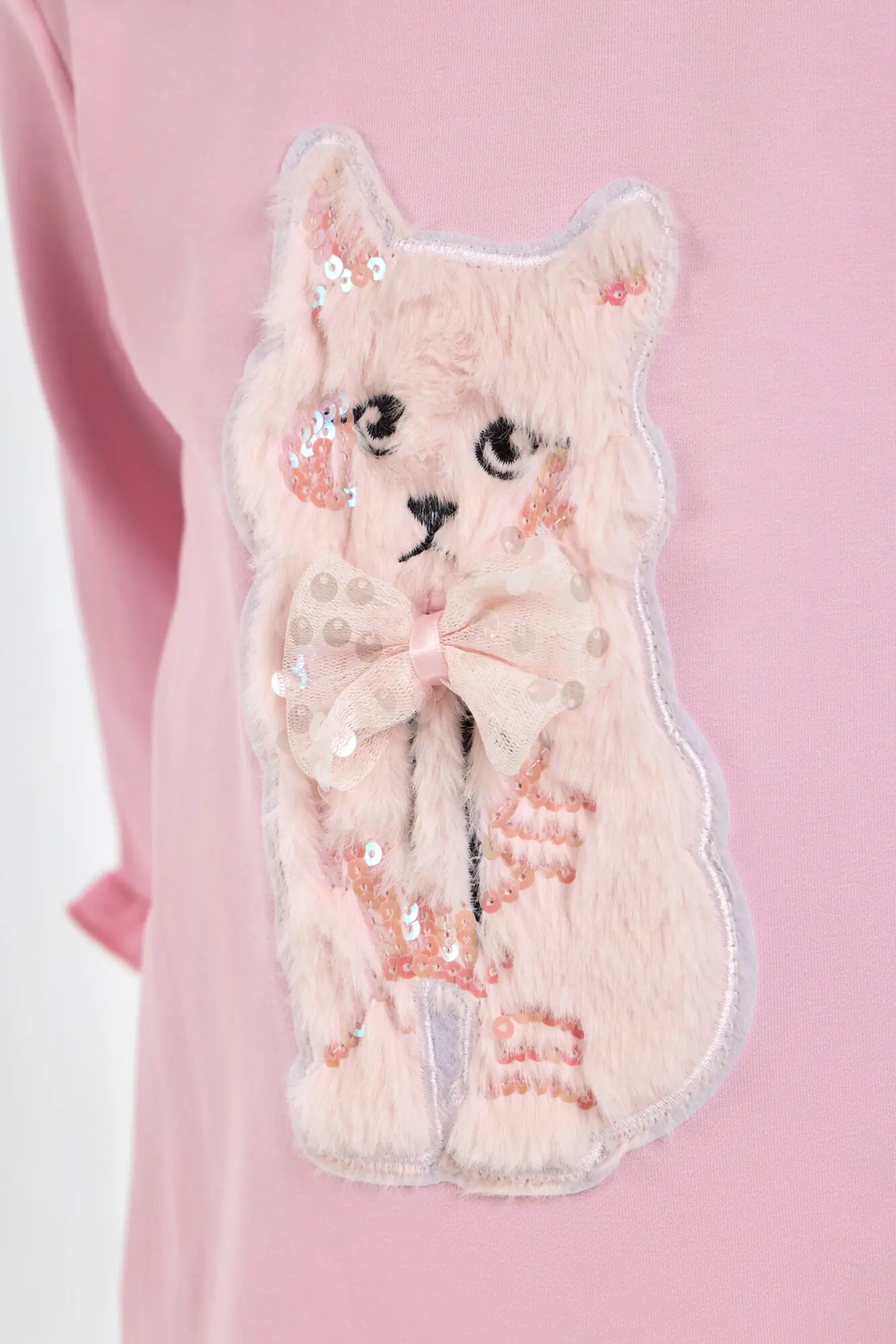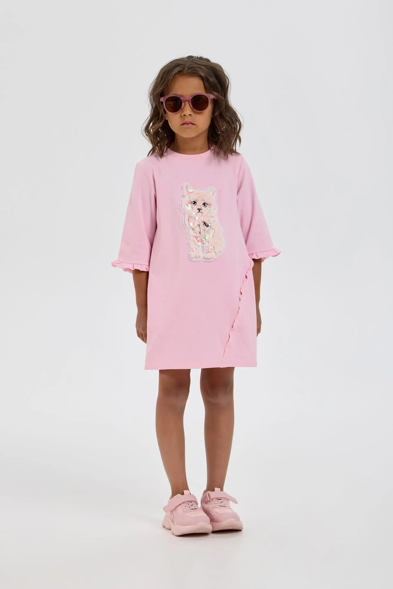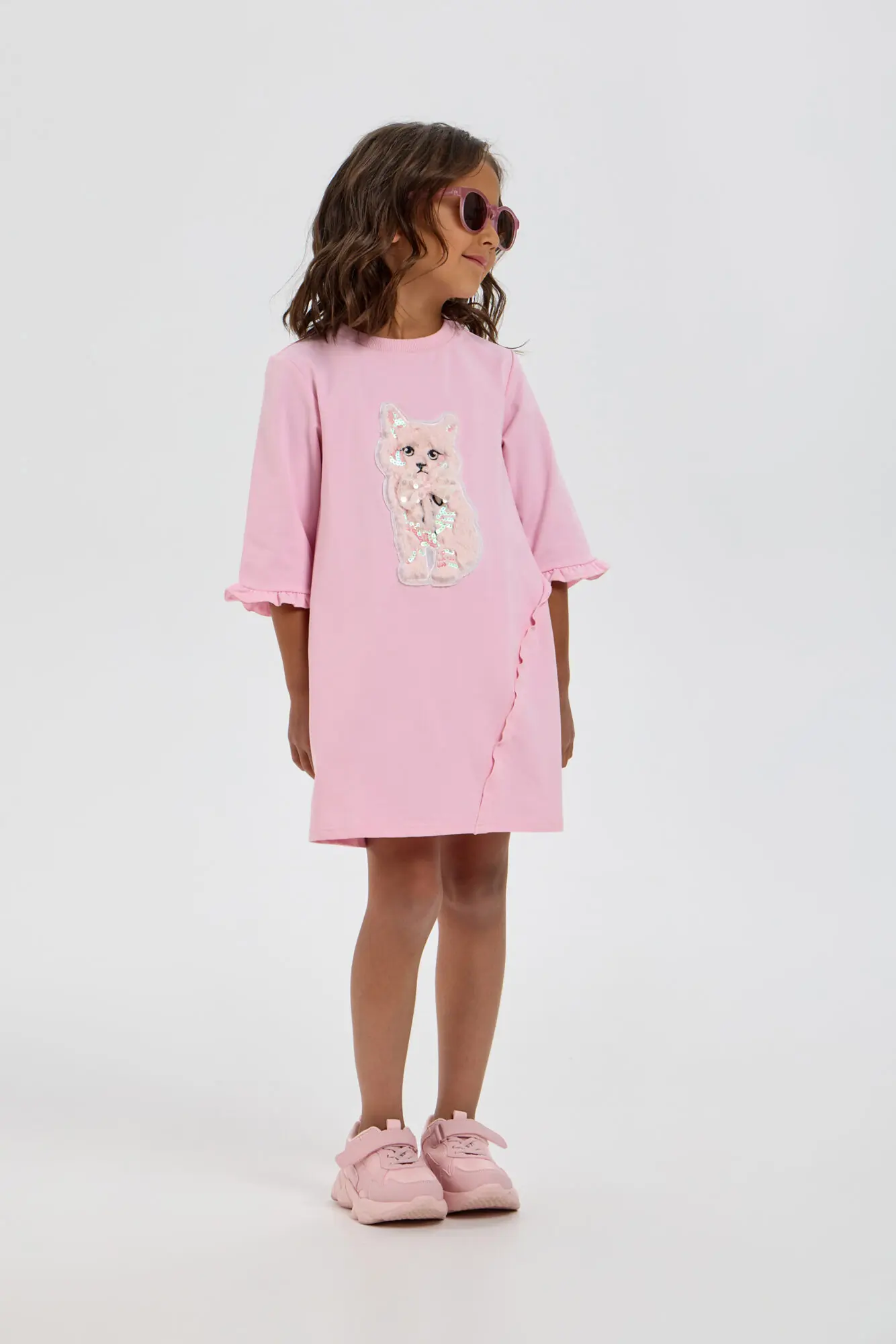 Оригинальное платье для девочки, выполненное из трикотажа в пастельно-розовом оттенке. Фасон платья – свободный, рукава длинные. Горловина круглой формы аккуратно обработана окантовкой. Особую привлекательность платью придает ... объемная декоративная аппликация и асимметричная оборка. Благодаря оригинальному оформлению и ярким элементом декора, это платье станет отличным выбором как для обычных дней, так и для праздничных событий.