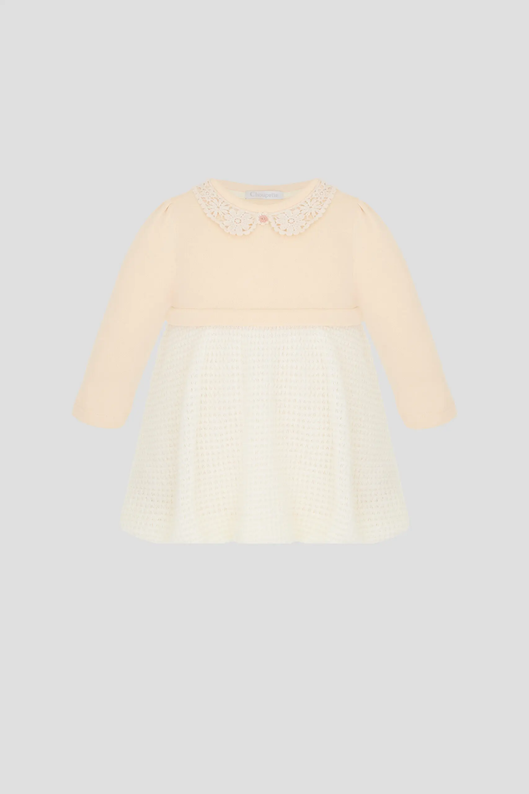 Очаровательное платье для девочки с пышной юбкой идеально подходит для повседневного гардероба и для особого случая. Модель изготовлена из мягкого и приятного телу хлопка актуального оттенка ... экрю. Ажурный воротник украшает круглую горловину и по цвету перекликается с юбкой, что делает дизайн гармоничным. Комфортный силуэт не стесняет движения ребенка. Пряжа из натурального хлопка не вызывает раздражения, что особенно важно для маленьких детей.