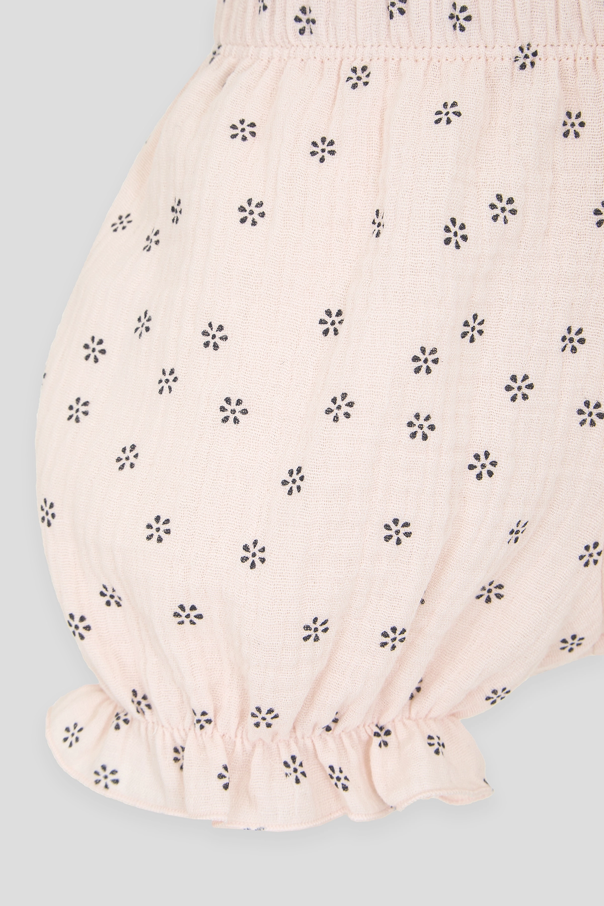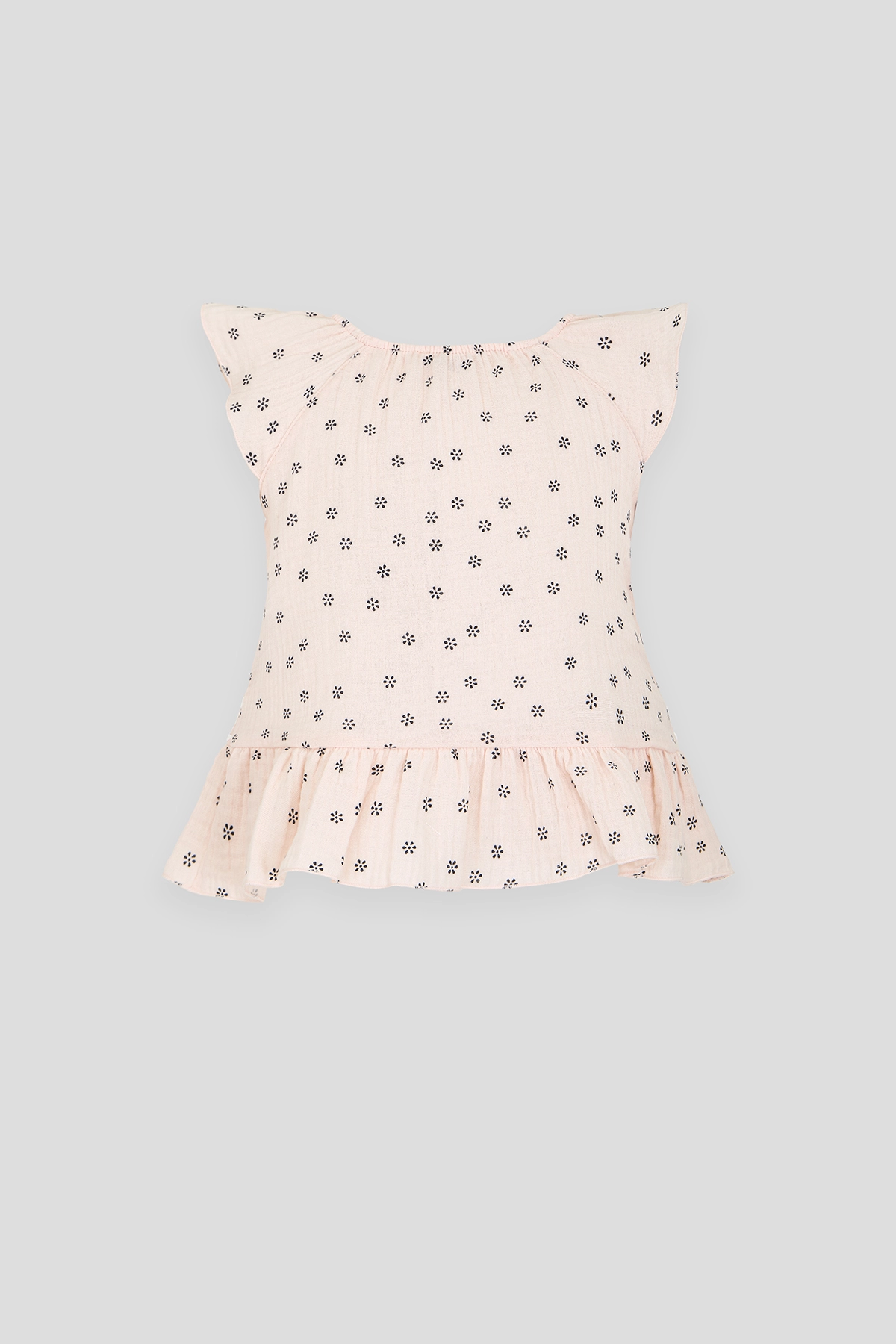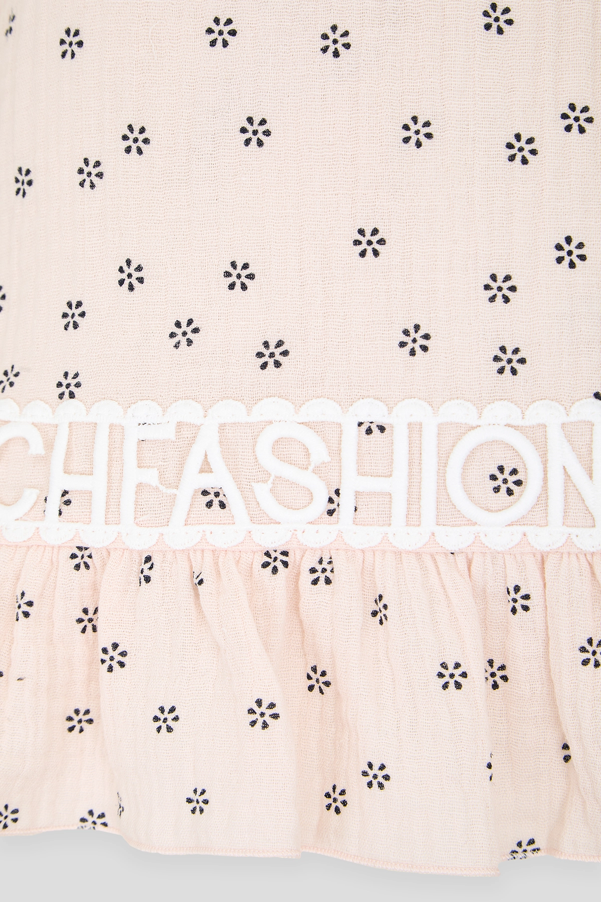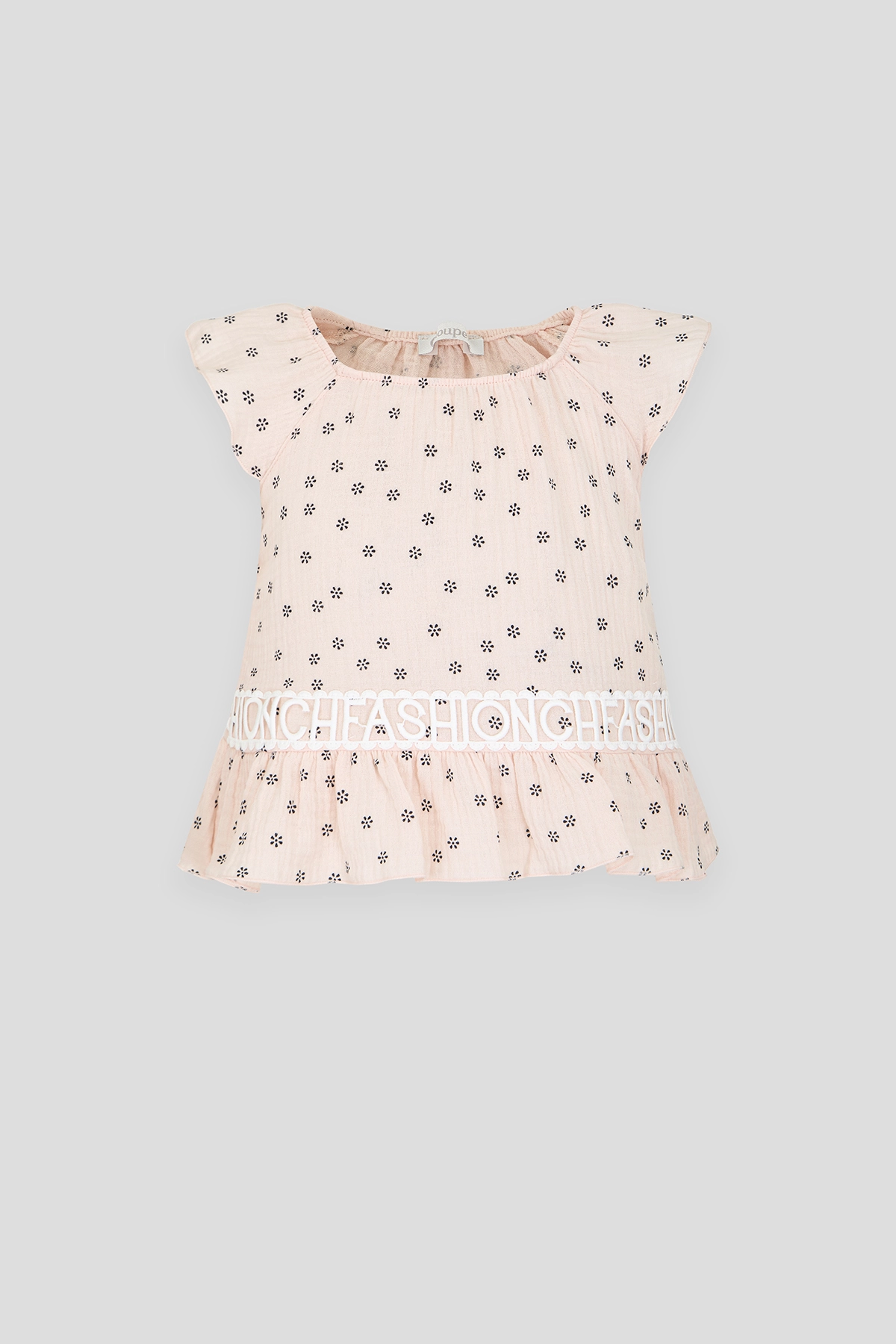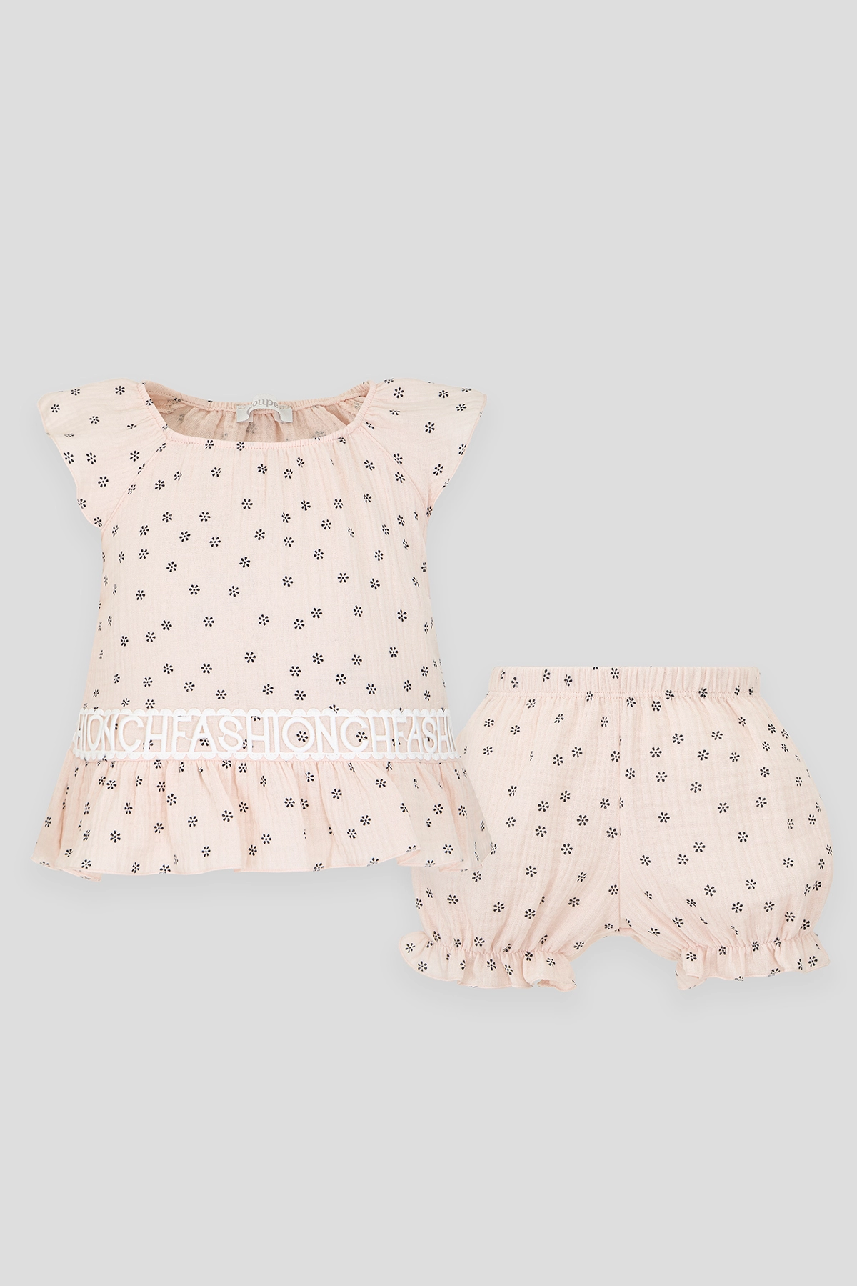 Очаровательный детский комплект в тёплом бежевом оттенке станет стильным и удобным решением для летнего гардероба. В набор входят лёгкая туника и шорты, выполненные из дышащего материала ... с мягкой текстурой, который обеспечивает комфорт и подходит для активного дня. Свободный крой туники с короткими рукавами создаёт ощущение лёгкости и не стесняет движений, а мягкая сборка по низу добавляет образу нежности. Шорты с эластичным поясом обеспечивают удобную посадку и позволяют ребёнку свободно двигаться. Нежный принт с мелким цветочным мотивом придаёт комплекту аккуратный и гармоничный вид, а декоративный пояс с надписью добавляет современный акцент. Лёгкая ткань хорошо пропускает воздух, помогая поддерживать комфорт даже в тёплую погоду.