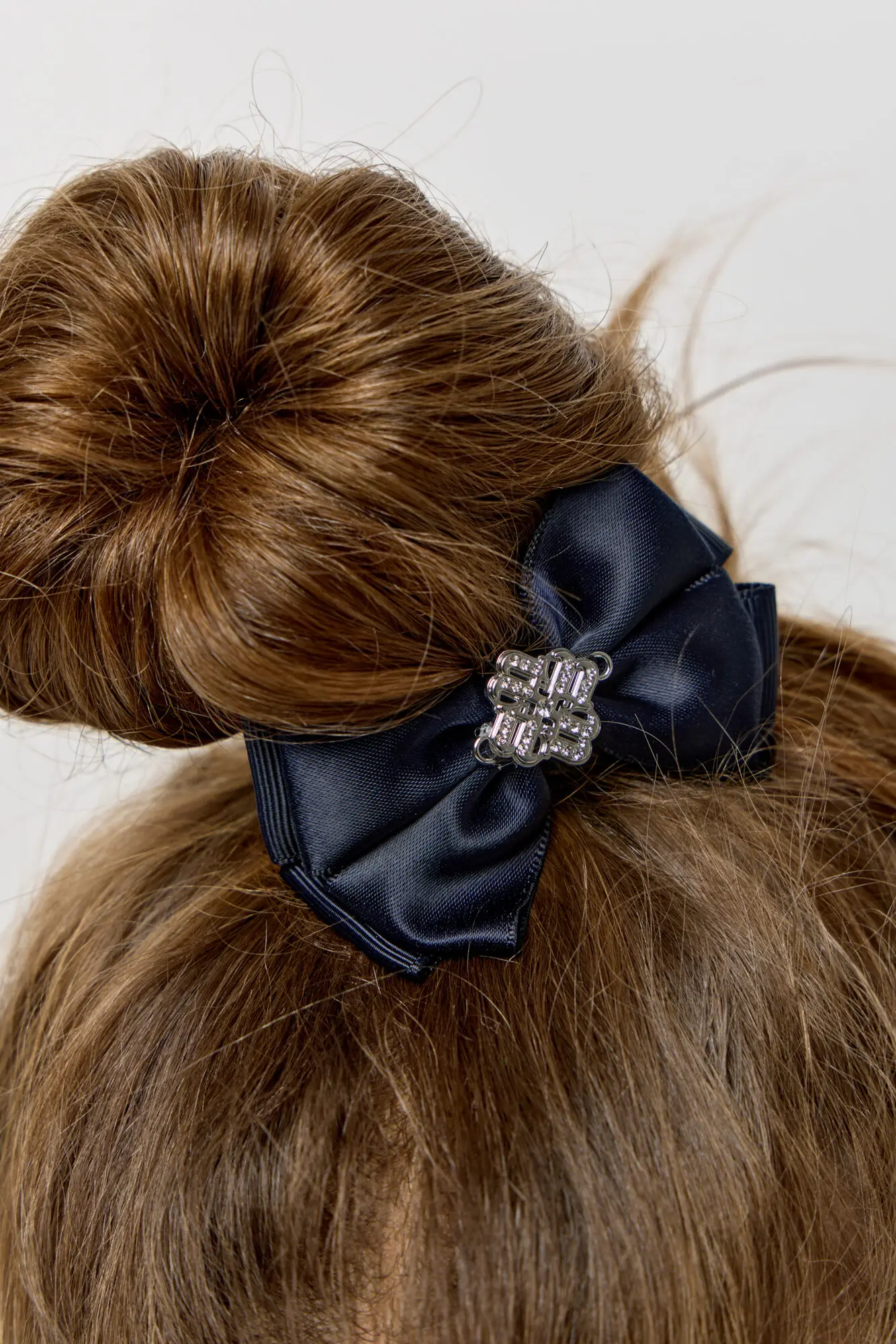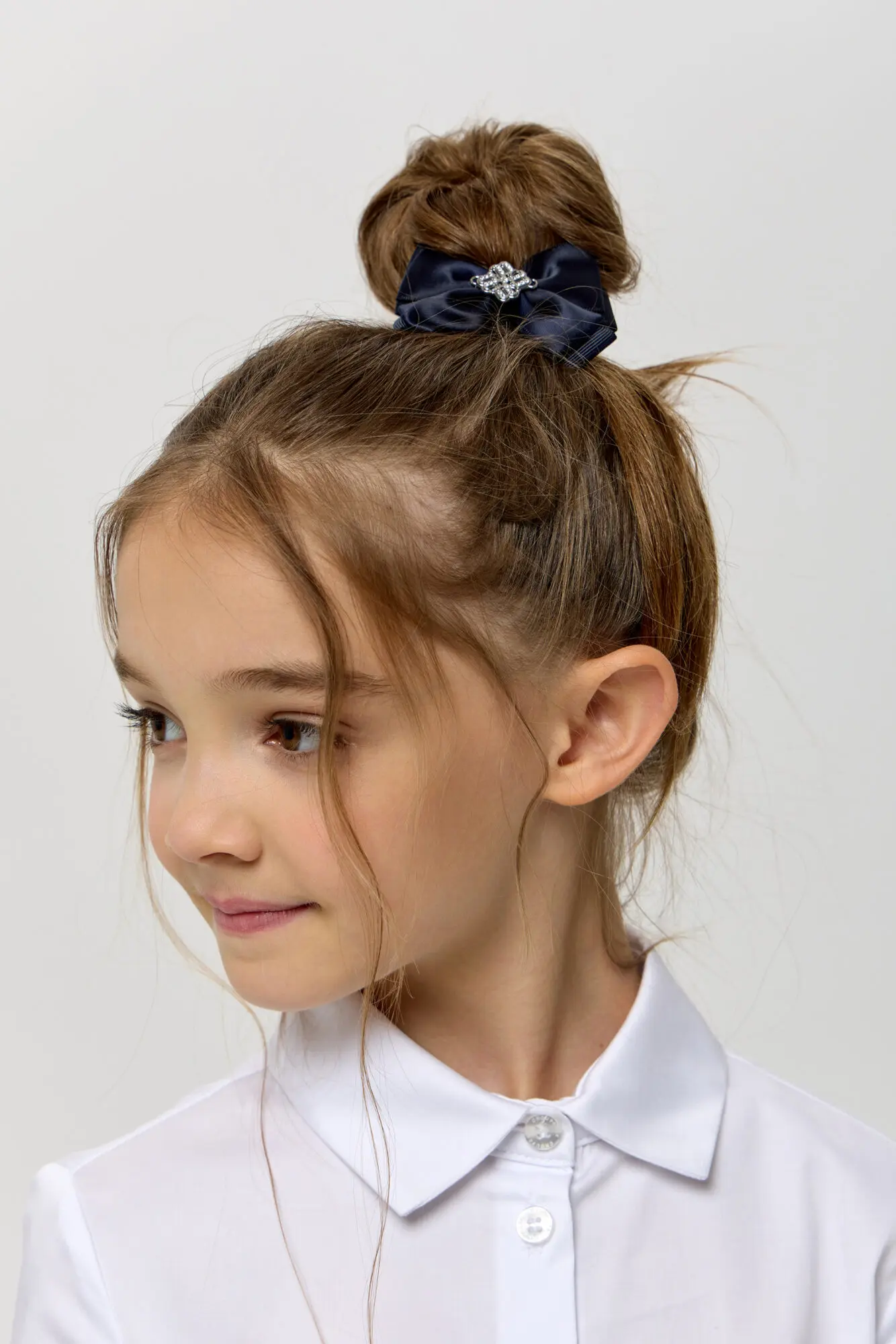 За счет благородного синего оттенка резинка для волос с бантом будет отлично смотреться со школьной формой любого цветового сочетания и завершит элегантный образ ученицы.