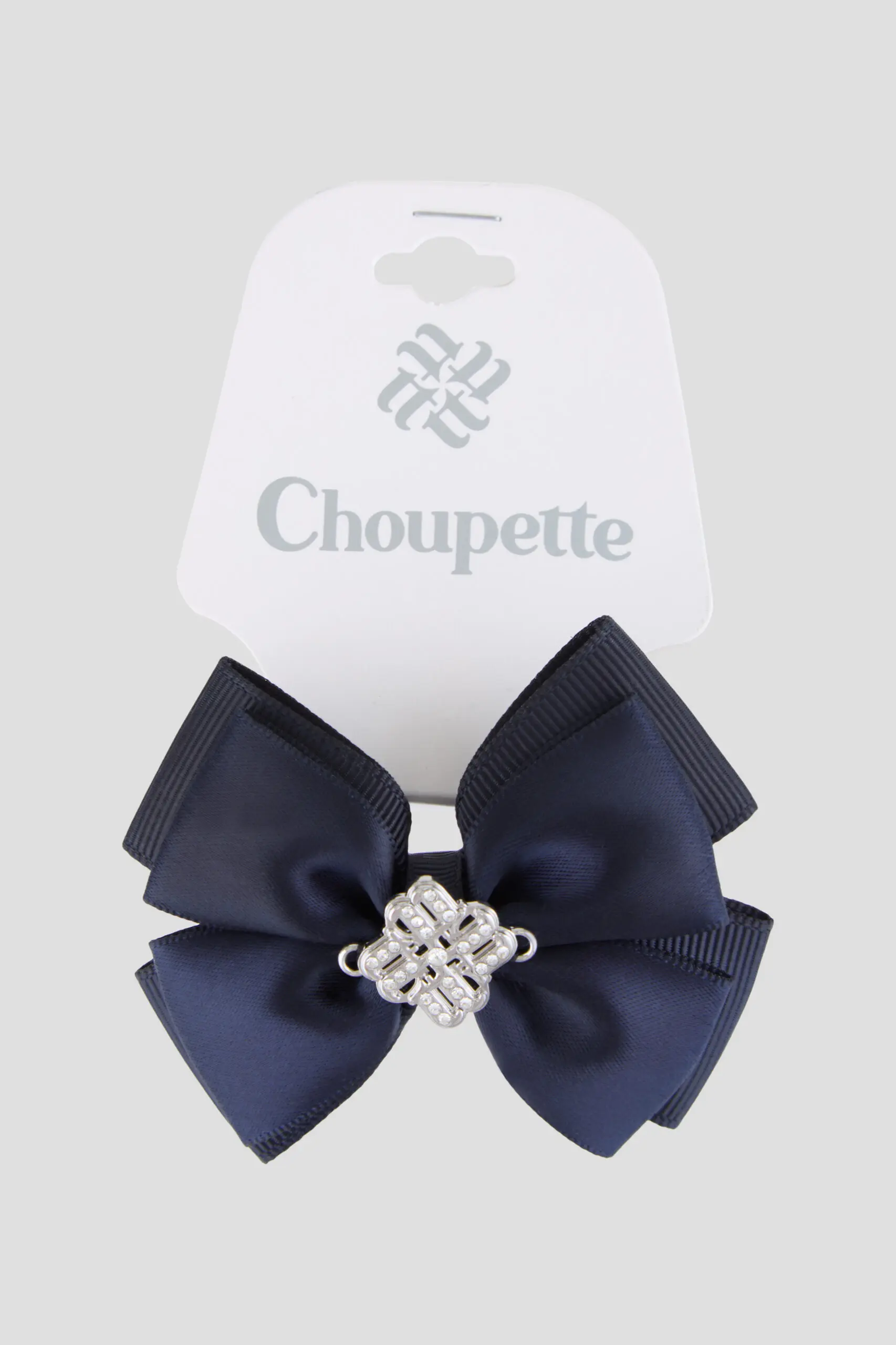 Непременным украшением для прически из длинных волос послужит резинка для волос с бантом. Даная модель представляет собой несколько бантов из широкой синей ленты, декорированных пряжкой со ... стразами в форме первых букв бренда Choupette.