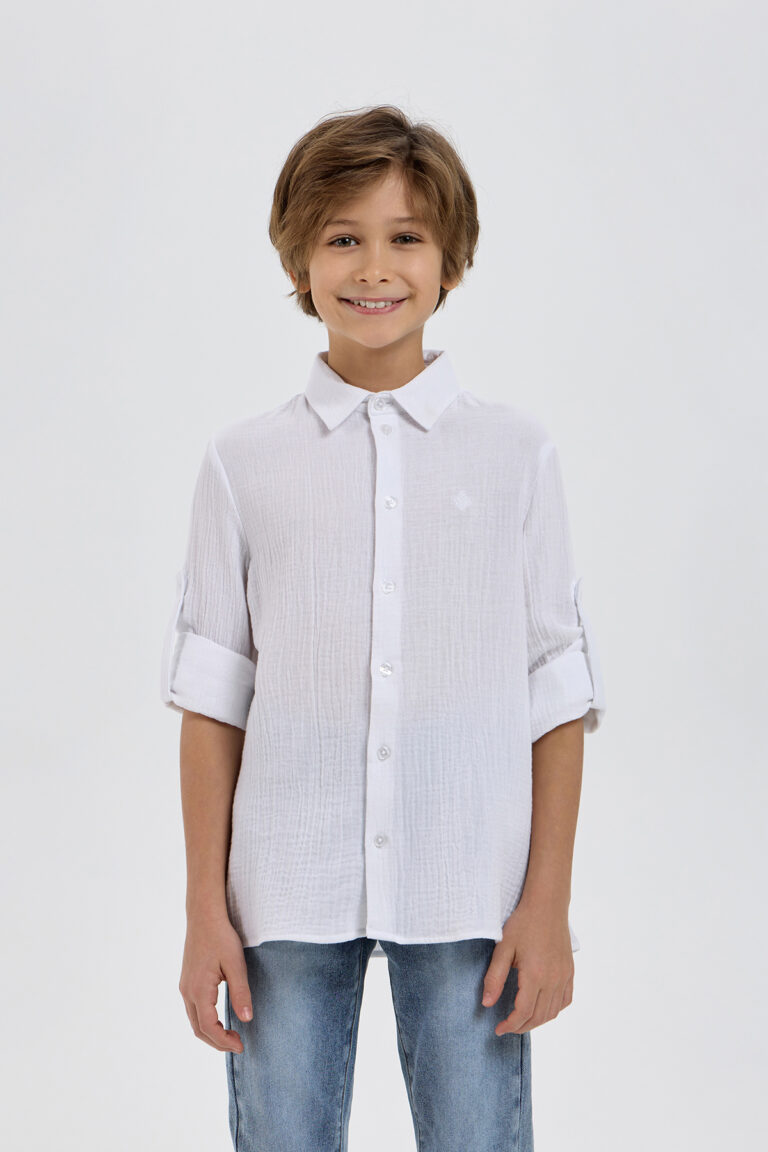 Сорочка для мальчика свободного силуэта выполнена из жатого хлопка. Значимым достоинством этой модели является простота в уходе. Среди особенностей рубашки: стандартный отложной воротник, застегивающаяся на пуговицы ... планка, длинные рукава с возможностью регулировки. Эта модель превосходно сочетается как с классическими брюками, так и с джинсами.
