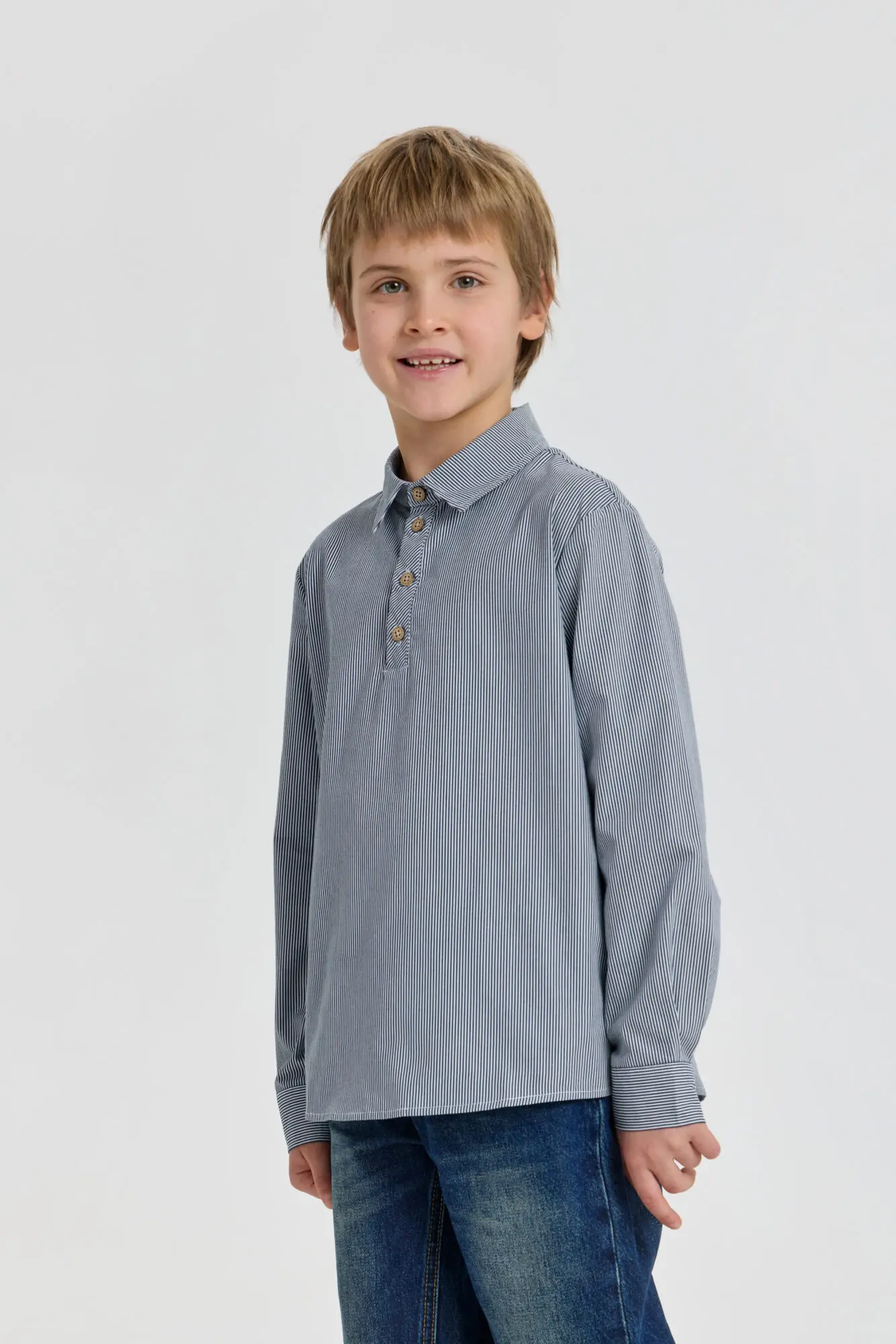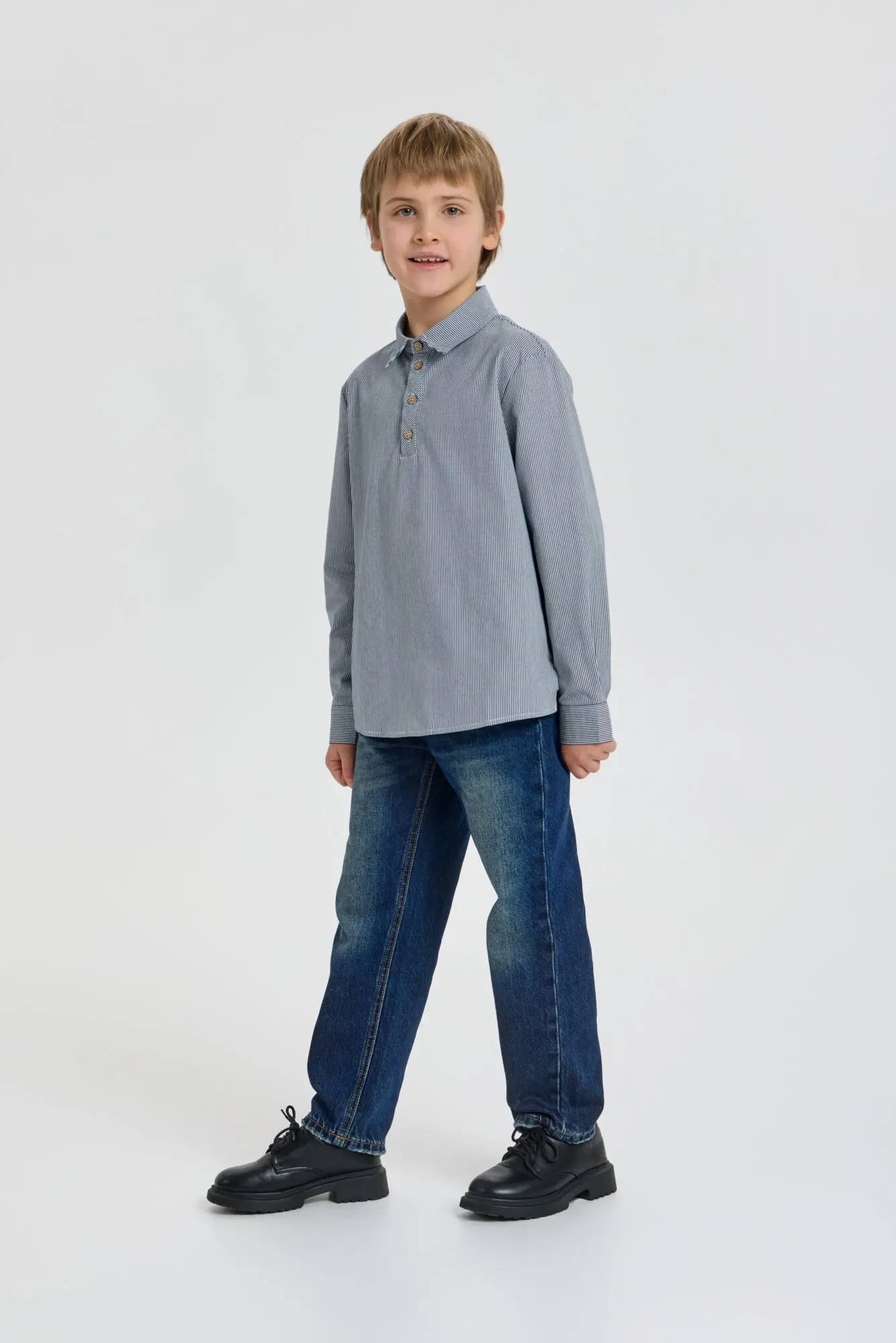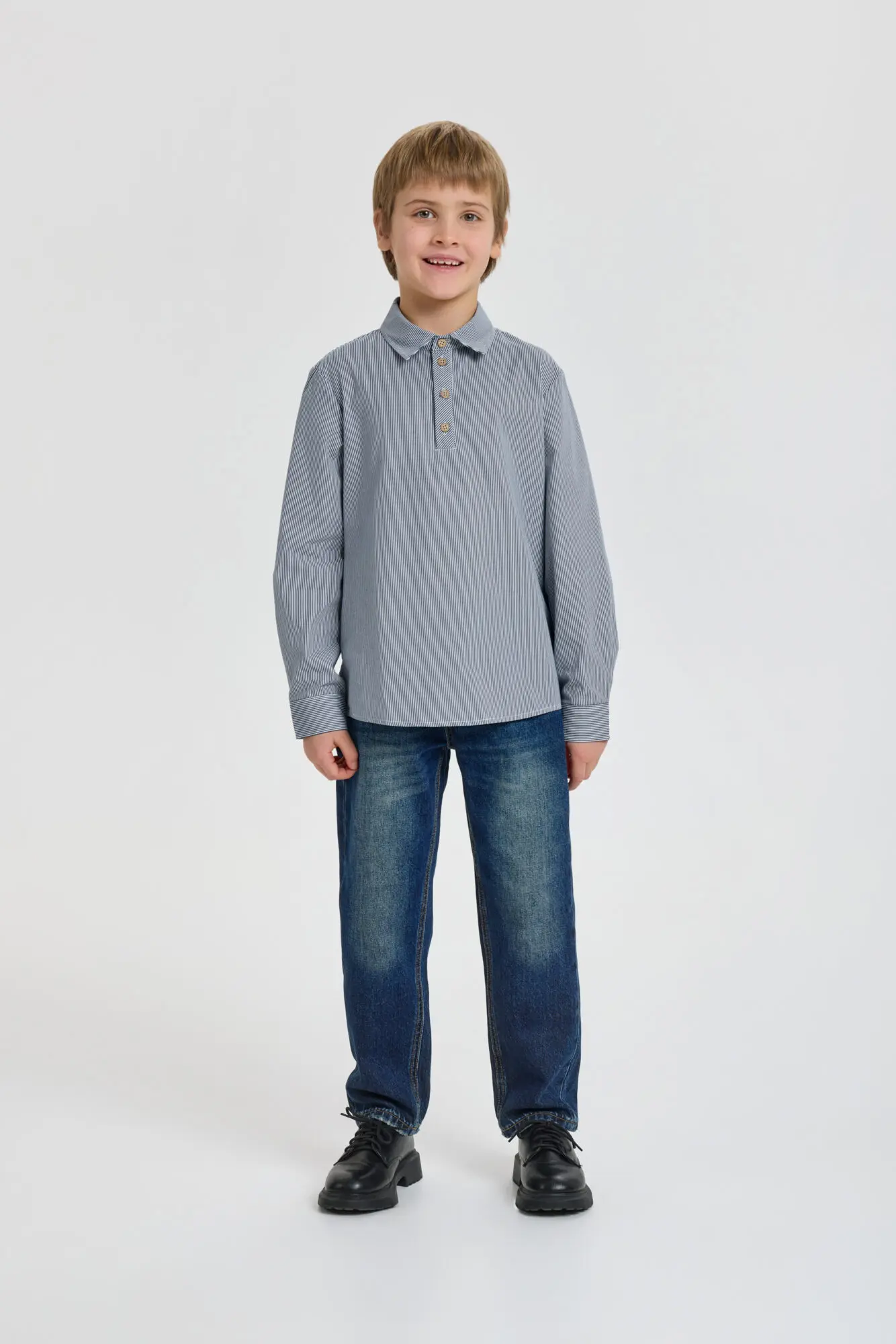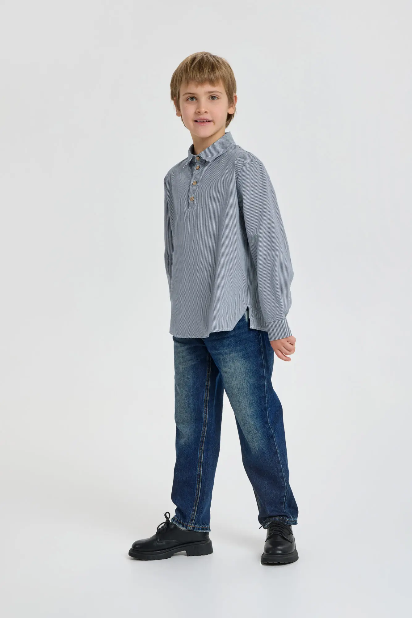 Стильная рубашка из хлопка для мальчика – актуальный и популярный предмет гардероба. Свободный силуэт, длинные рукава с манжетами и отложной воротник-поло с застежкой на пуговицы создают современный образ. Боковые ... разрезы в нижней части обеспечивают комфортную посадку и позволяют аккуратно заправлять рубашку в брюки без лишнего объема. Универсальный дизайн позволяет сочетать ее как с джинсами, так и с элегантными брюками. Прекрасно дополнит образ пиджак или кардиган.