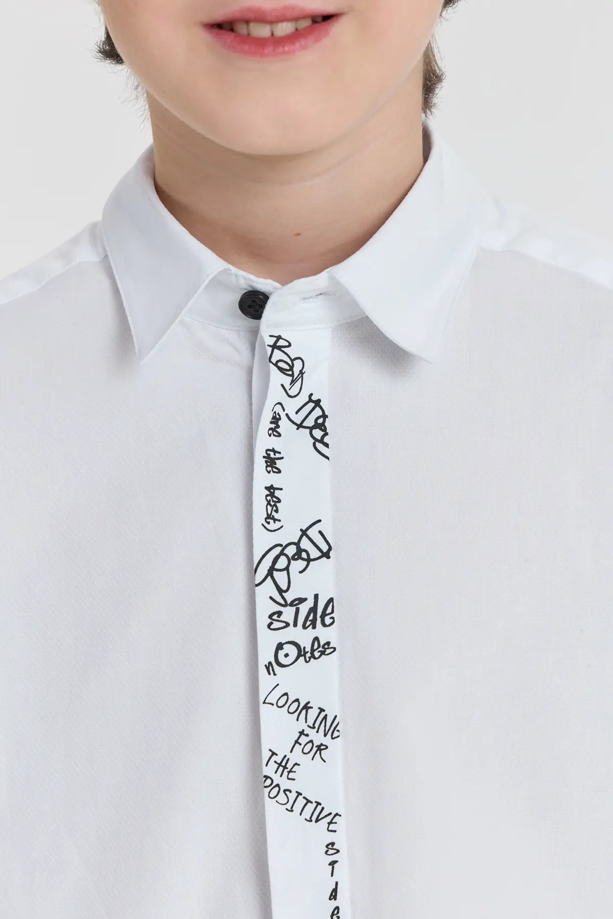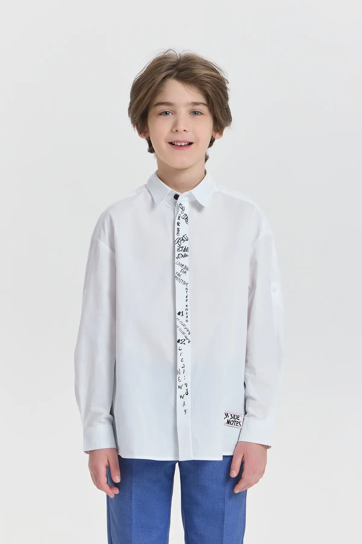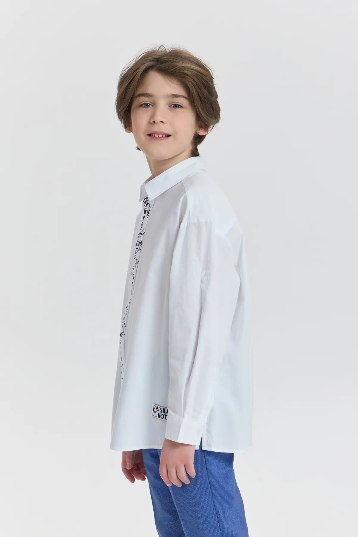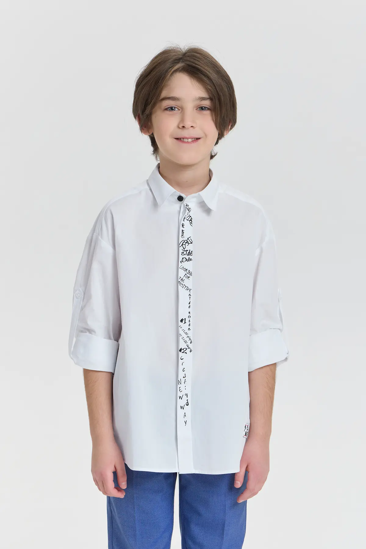 Современная рубашка в чистом белом исполнении разработана для мальчиков, стремящихся подчеркнуть индивидуальность в нарядных образах. Рубашка станет отличным выбором для праздничных событий, дружеских встреч и семейных ... торжеств. Модель свободной посадки выполнена из лёгкой гладкой ткани, которая обеспечивает комфорт и аккуратный внешний вид. Классический воротник и застёжка на пуговицы дополнены контрастной декоративной планкой с графичными надписями, придающей изделию оригинальность и динамичный акцент. Укороченные рукава с отворотами добавляют образу непринуждённости и актуальности.