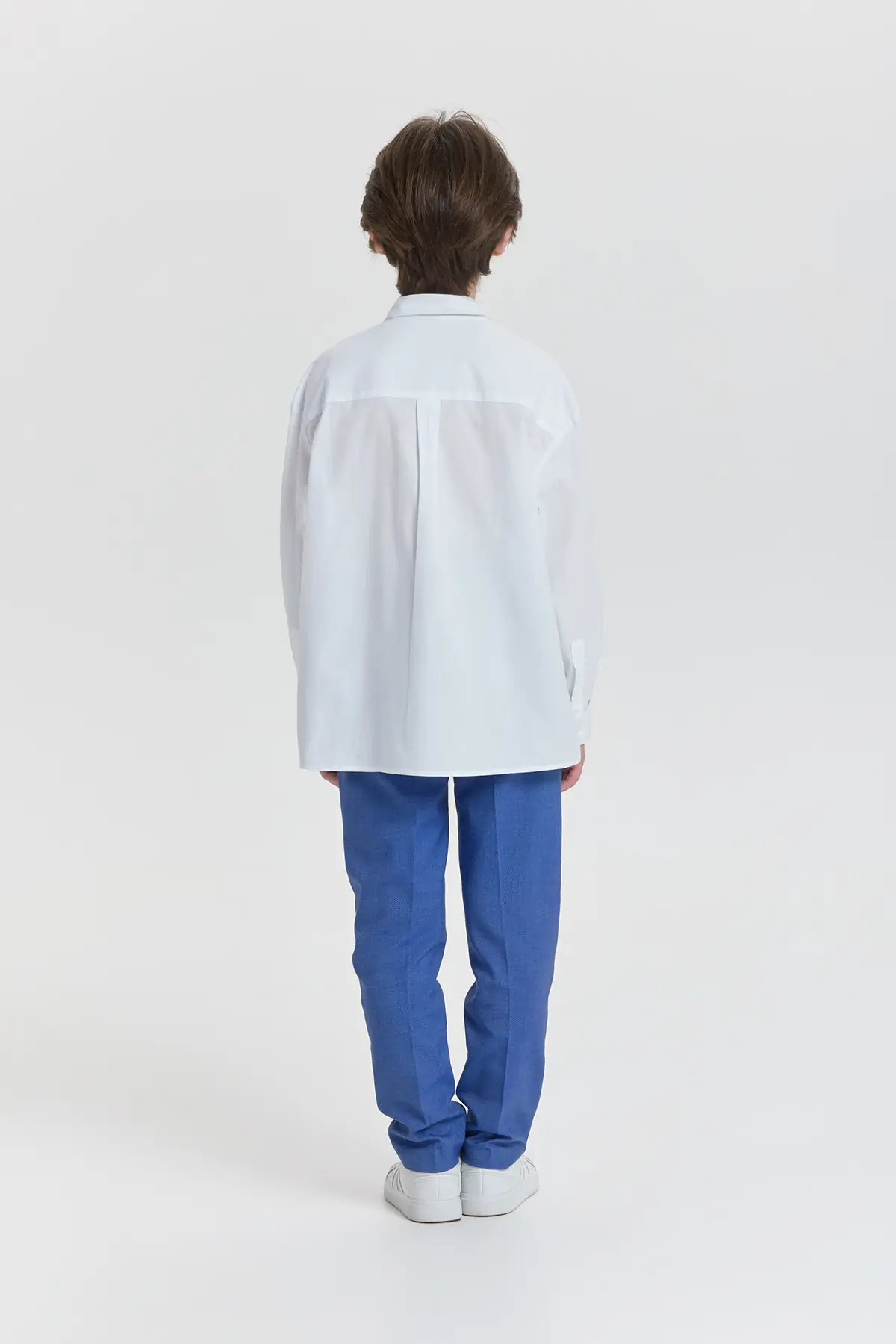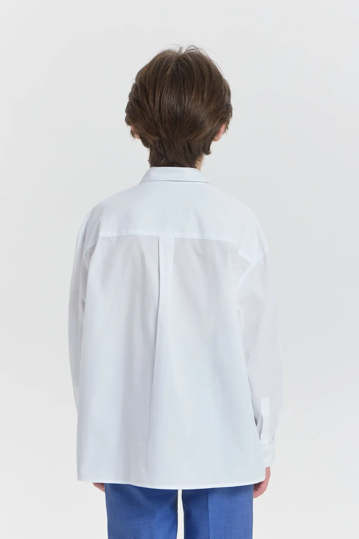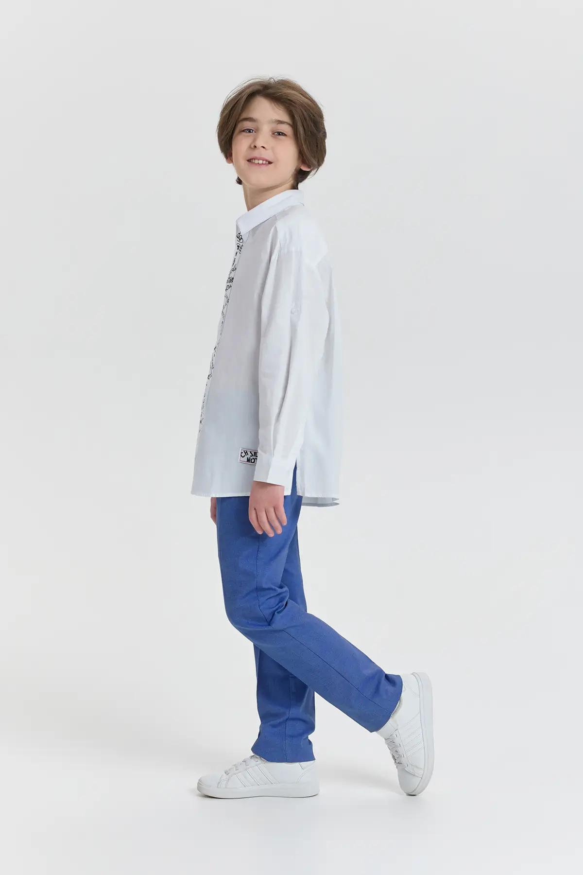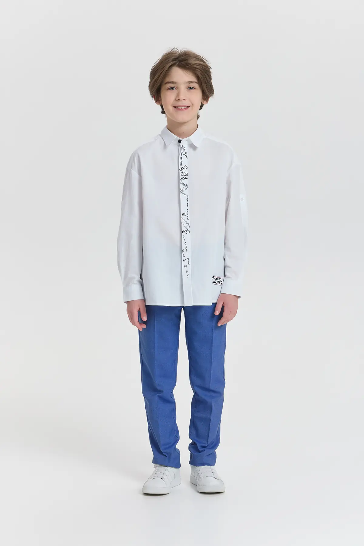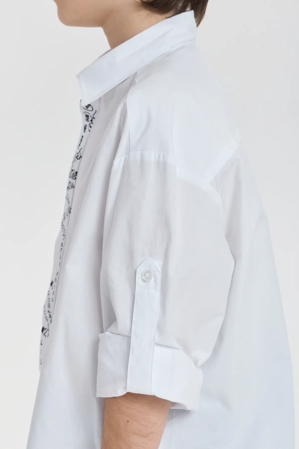 Современная рубашка в чистом белом исполнении разработана для мальчиков, стремящихся подчеркнуть индивидуальность в нарядных образах. Рубашка станет отличным выбором для праздничных событий, дружеских встреч и семейных ... торжеств. Модель свободной посадки выполнена из лёгкой гладкой ткани, которая обеспечивает комфорт и аккуратный внешний вид. Классический воротник и застёжка на пуговицы дополнены контрастной декоративной планкой с графичными надписями, придающей изделию оригинальность и динамичный акцент. Укороченные рукава с отворотами добавляют образу непринуждённости и актуальности.