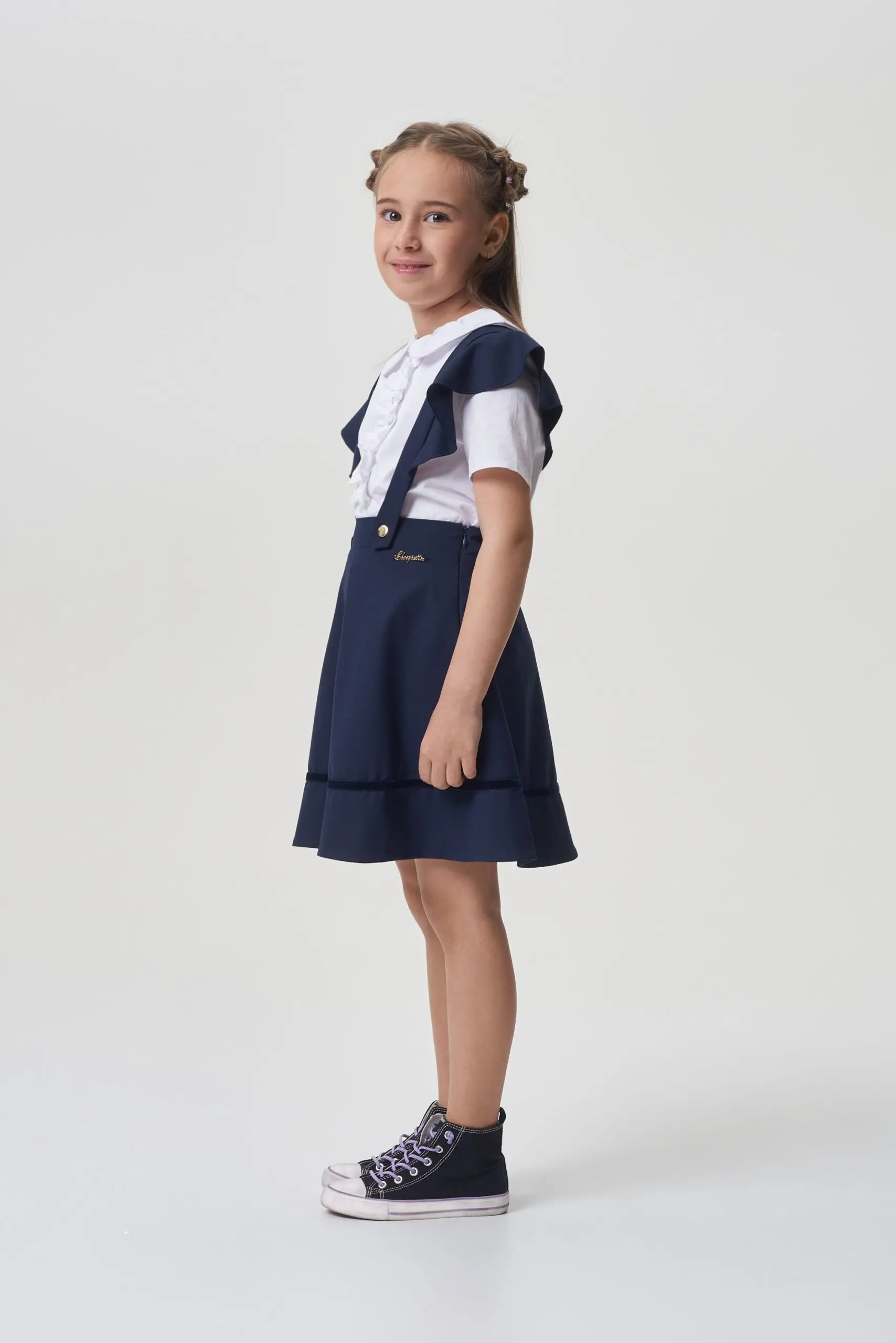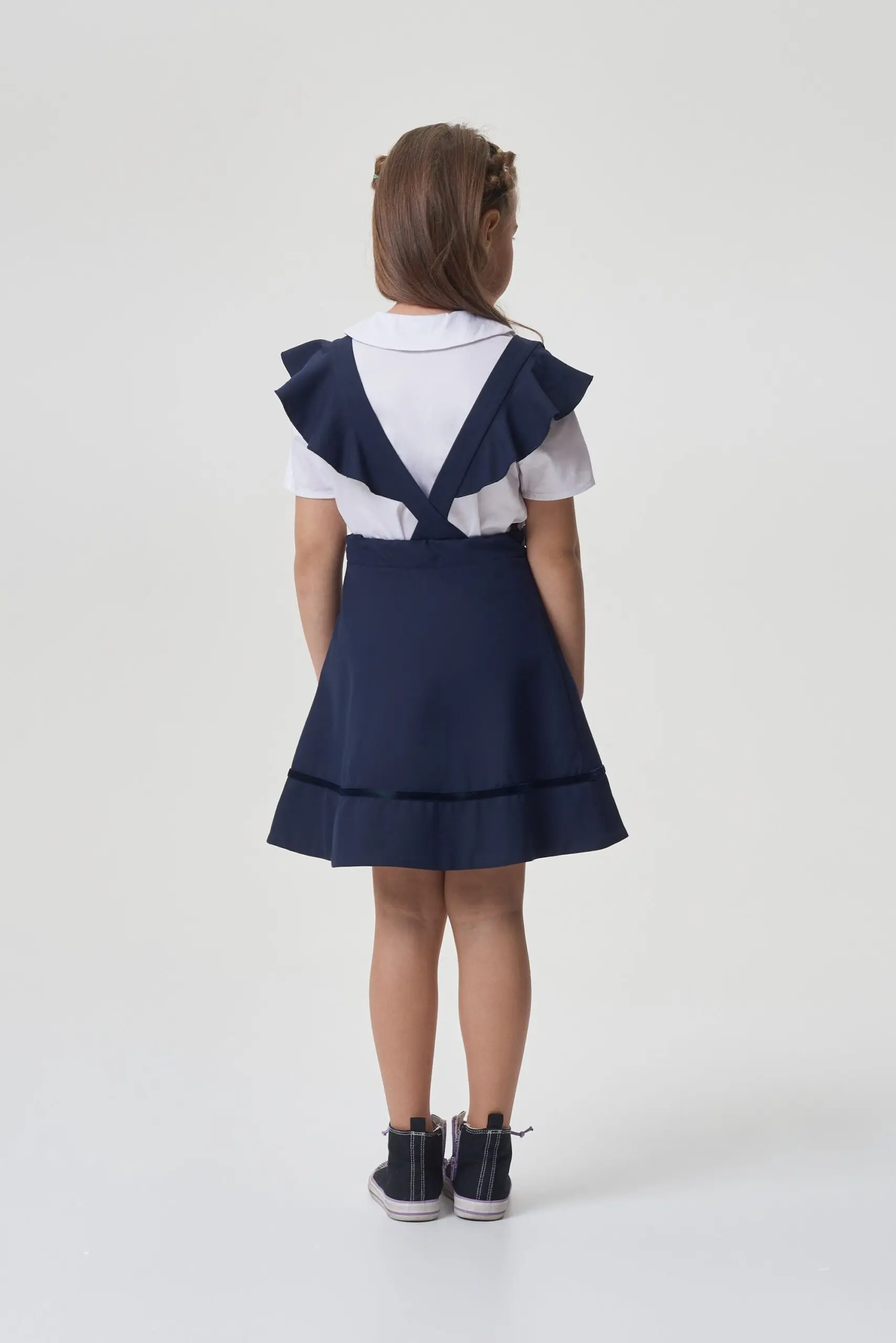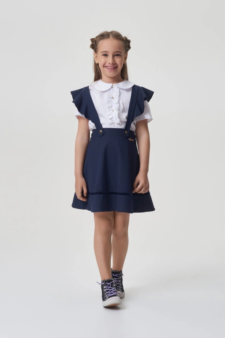 Классический синий сарафан для девочки – стильная и практичная основа школьной формы. Модель с расклешенной юбкой длиной выше колена дополнена темно-синим отделочным кантом. Бретели с крылышками ... перекрещиваются на спине. На поясе – декоративные металлические пуговицы.