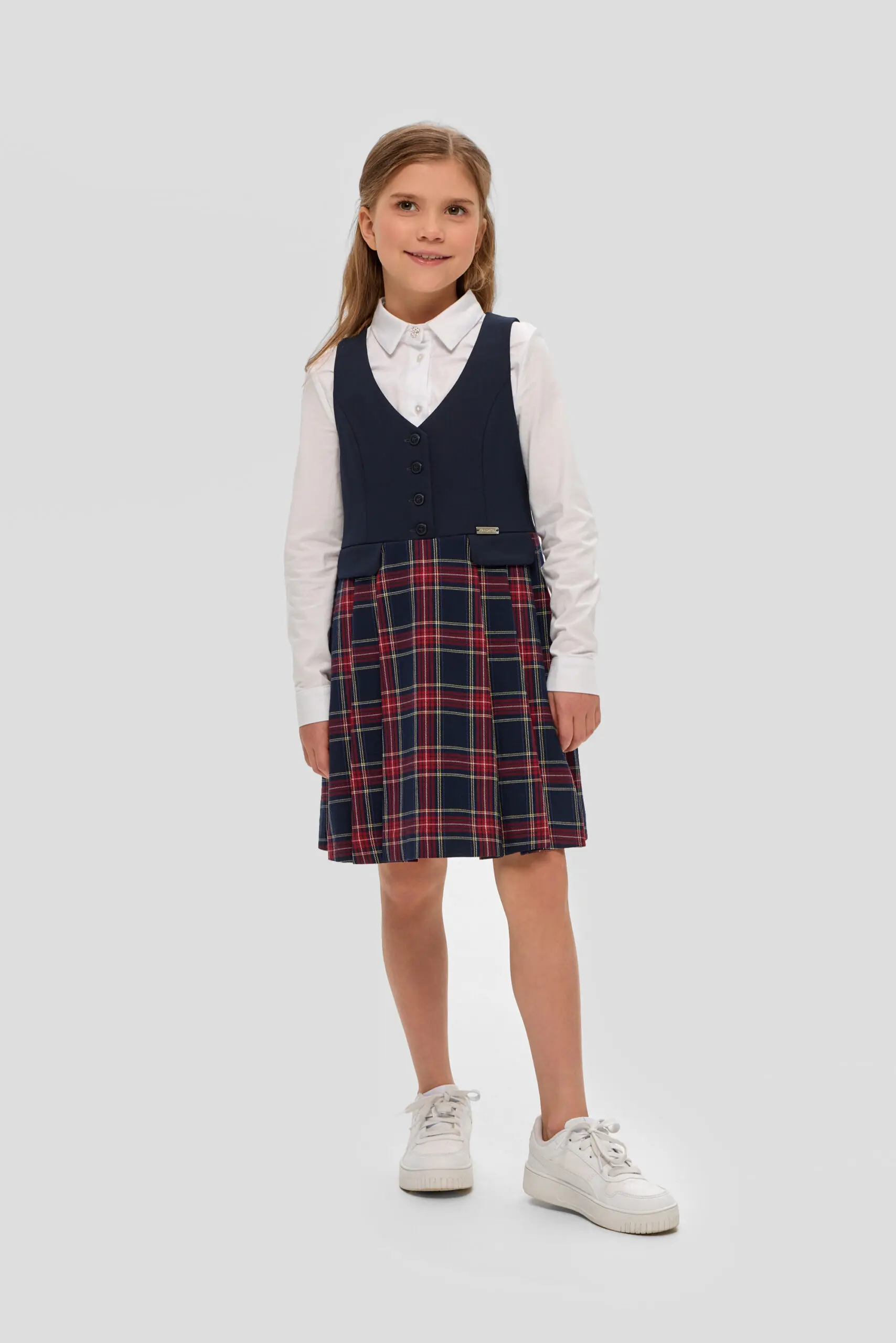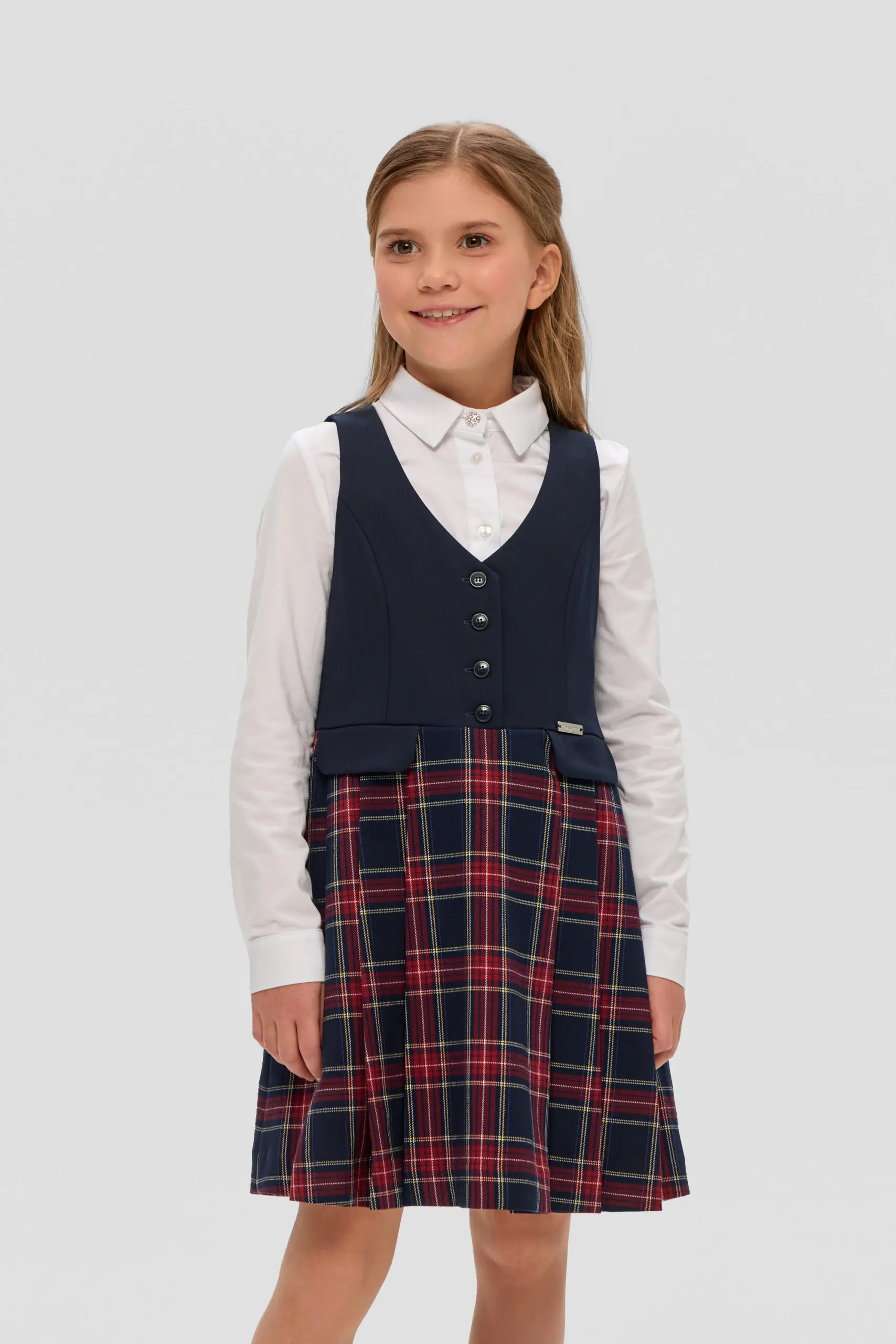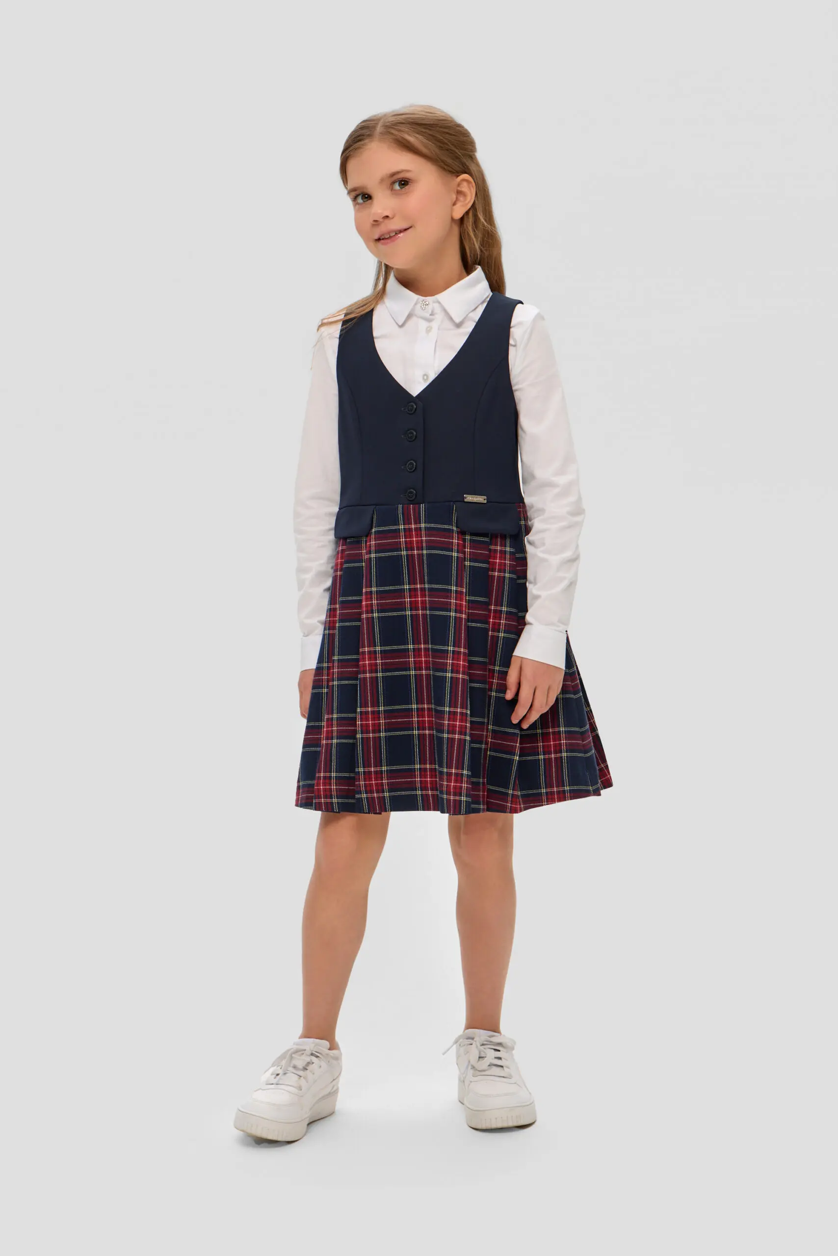 Сарафан для девочки - стильная модель, сочетающая в себе однотонный синий верх и яркий низ в классическую шотландскую клетку. Крой выдержан в классическом стиле: спереди застежка ... на пуговицах, юбка с крупными боковыми складками, на спинке имеется ремешок для регулировки изделия по объему. Дополнительно на талии имеются клапаны-обманки с фирменным логотипом бренда. Смешанный материал неприхотлив в ношении: не мнется, не скатывается, не лоснится, легко стирается. Купить такой комбинированный сарафан в клетку для девочки – отличное решение для школьных будней.