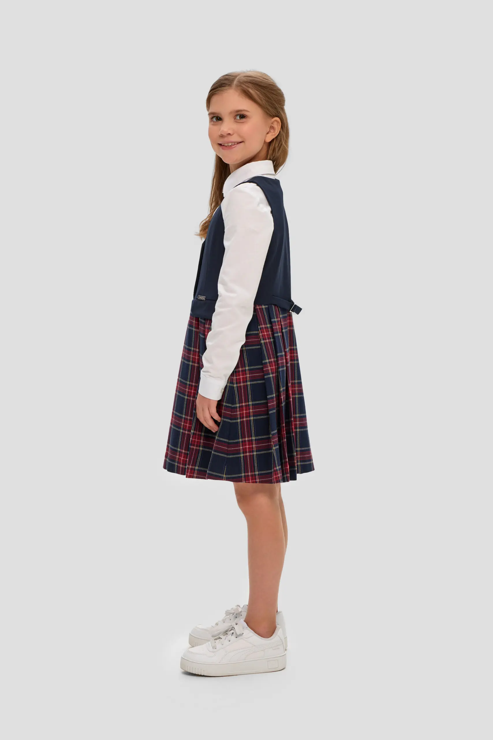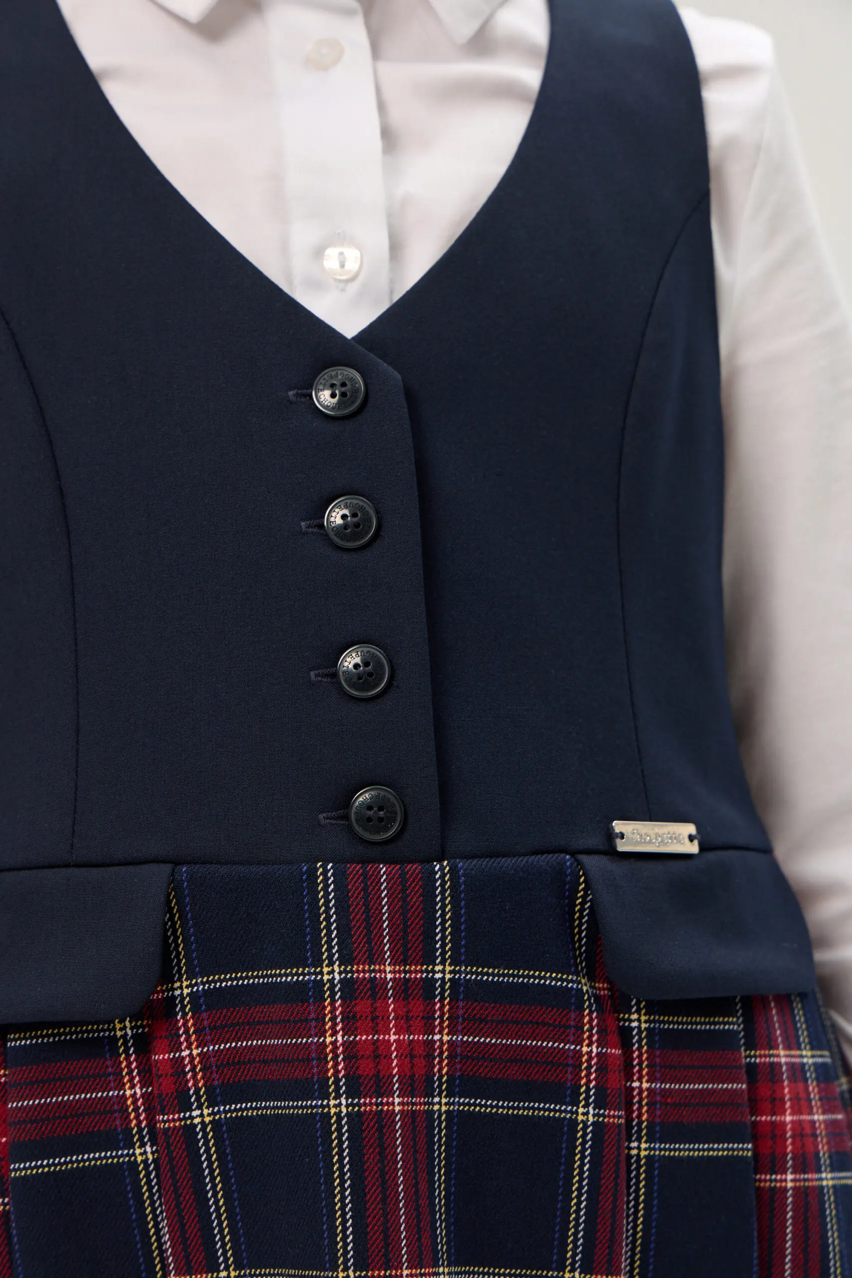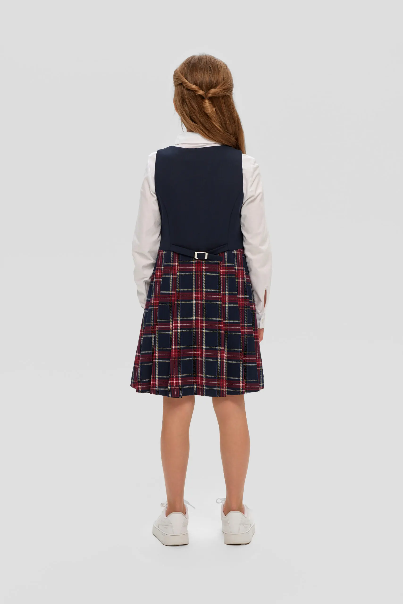 Сарафан для девочки - стильная модель, сочетающая в себе однотонный синий верх и яркий низ в классическую шотландскую клетку. Крой выдержан в классическом стиле: спереди застежка ... на пуговицах, юбка с крупными боковыми складками, на спинке имеется ремешок для регулировки изделия по объему. Дополнительно на талии имеются клапаны-обманки с фирменным логотипом бренда. Смешанный материал неприхотлив в ношении: не мнется, не скатывается, не лоснится, легко стирается. Купить такой комбинированный сарафан в клетку для девочки – отличное решение для школьных будней.