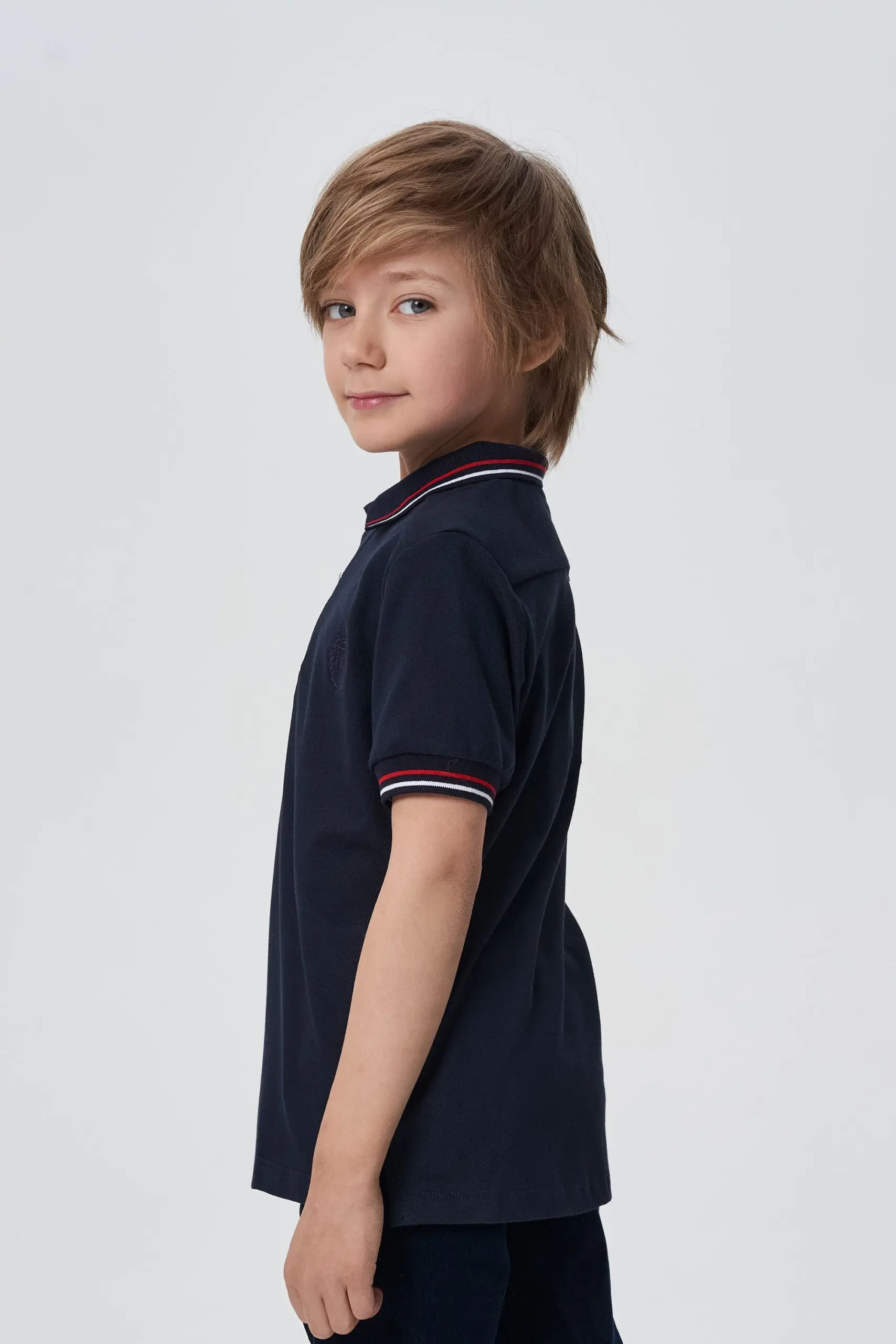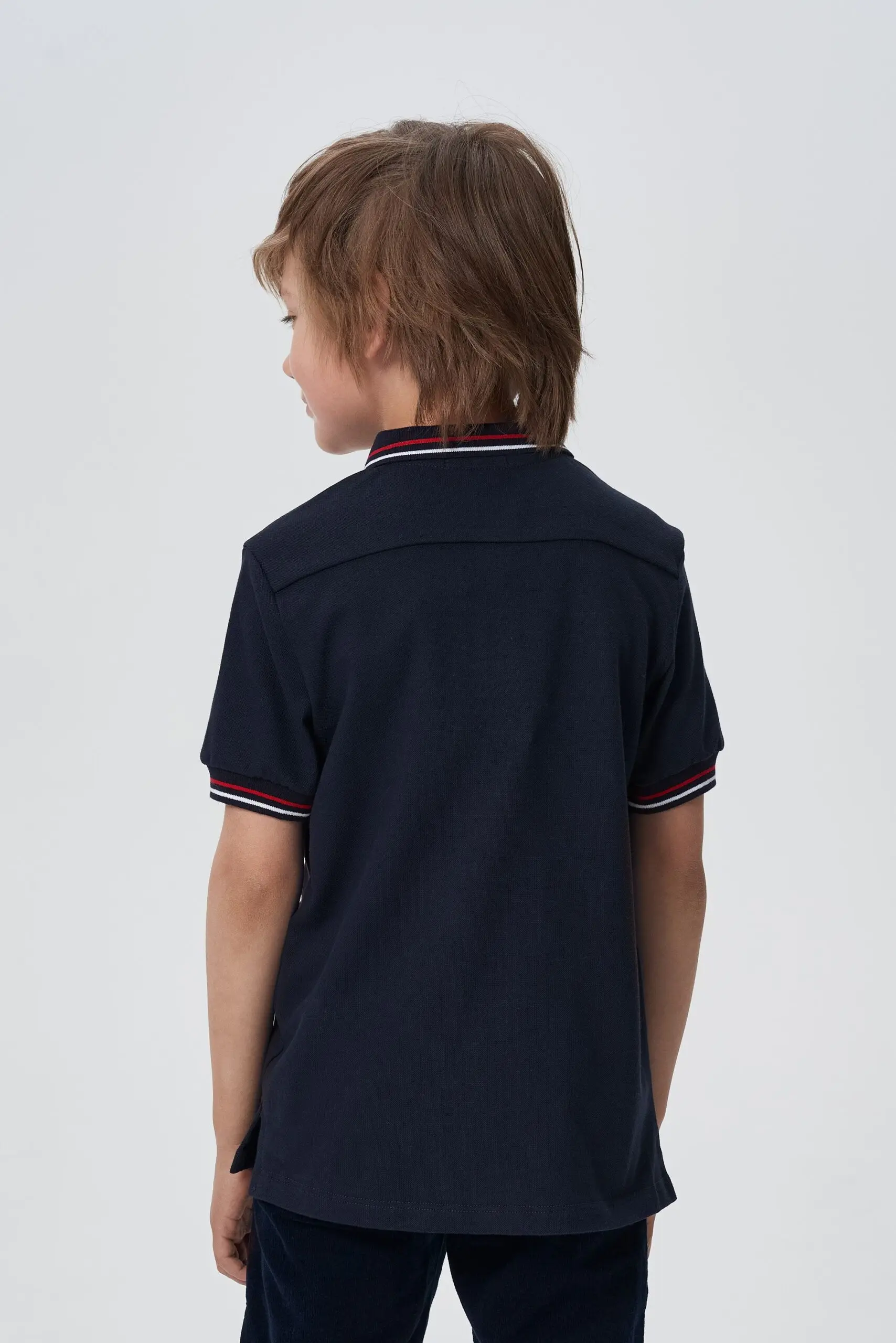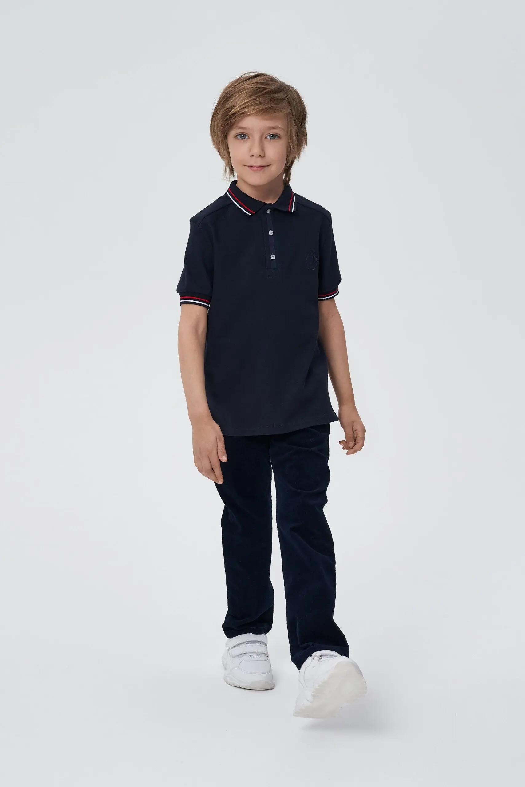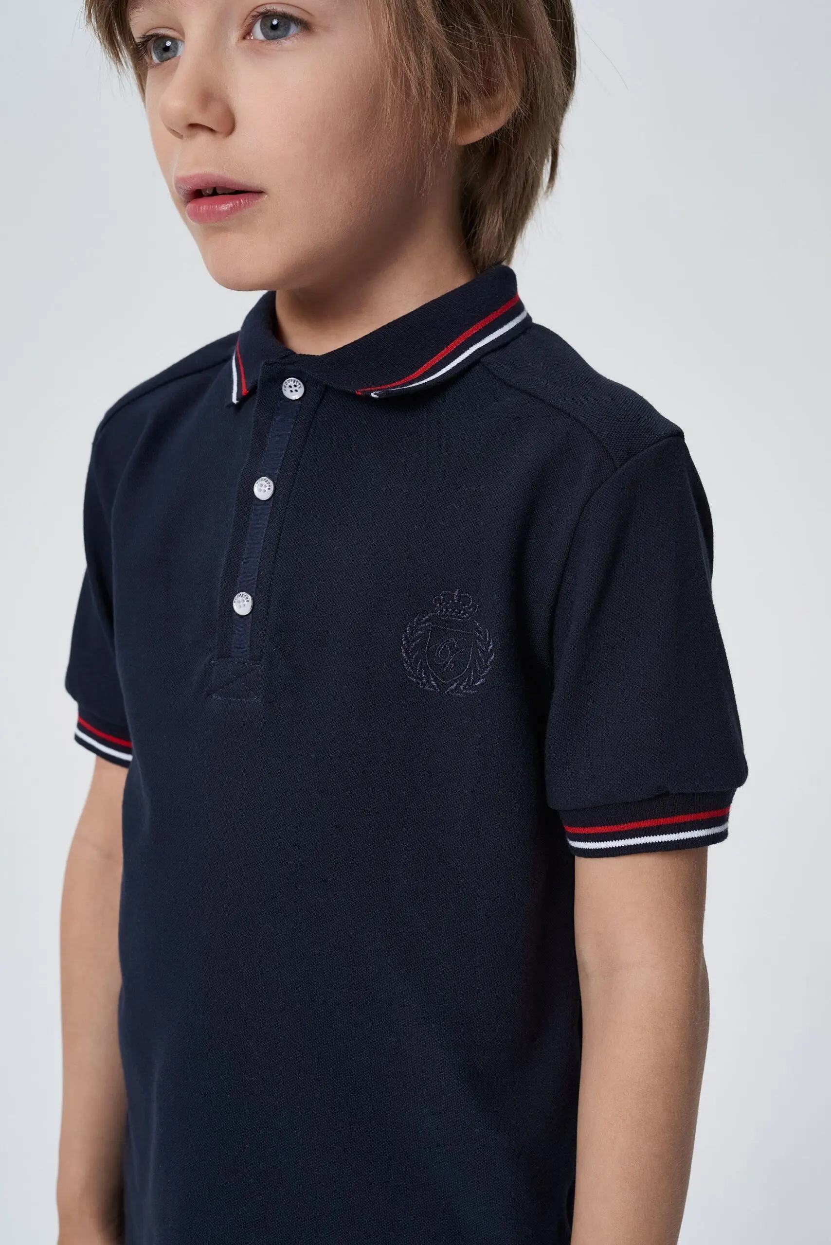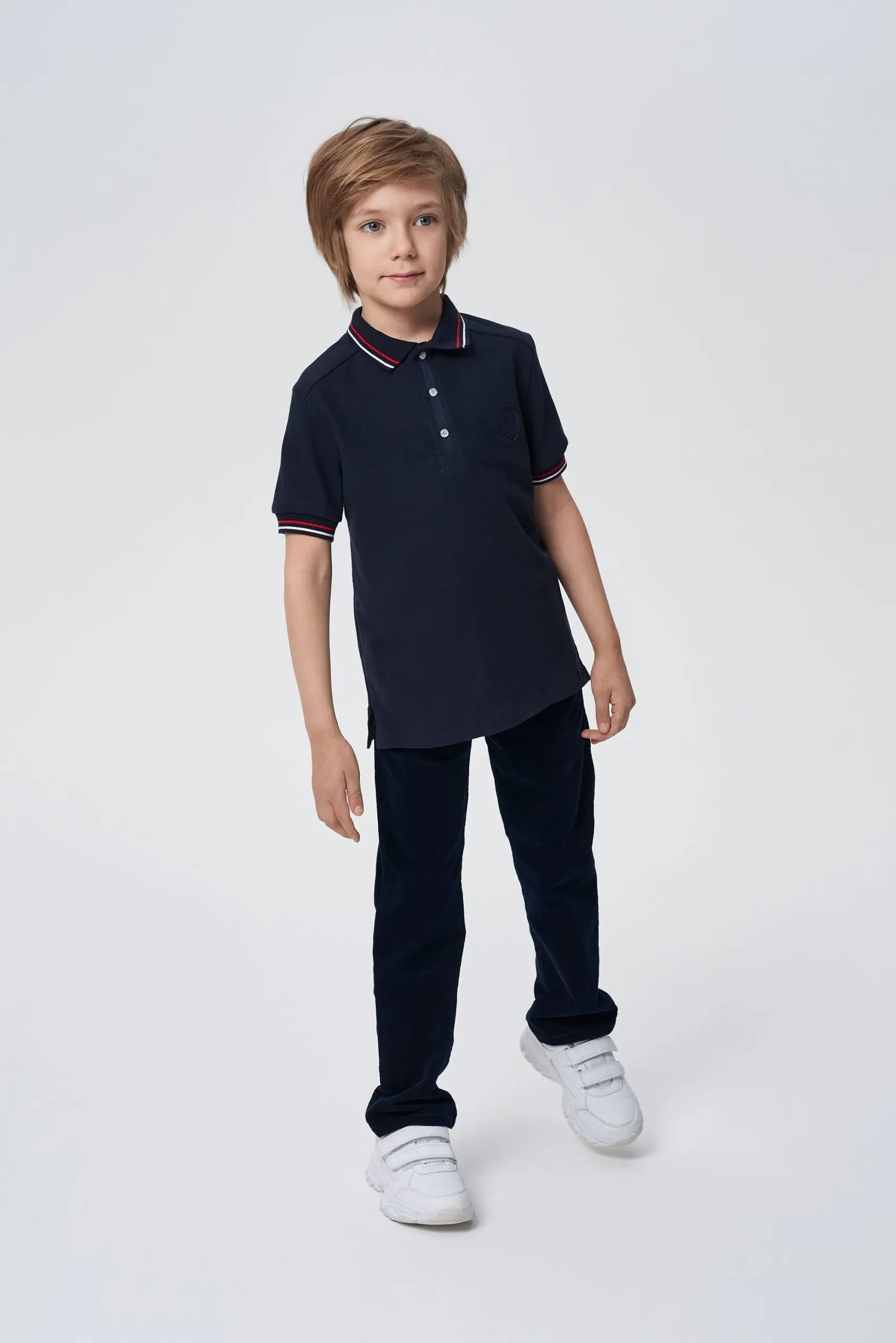 Темно-синяя рубашка-поло для мальчика сочетает в себе лучшие черты классического и спортивного стиля. Модель с коротким рукавом выполнена из мягкой хлопчатобумажной ткани. Края отложного воротника и ... манжеты оформлены контрастной бело-бордовой полоской, на планке три белые кнопки. С левой стороны груди – вышитый шеврон в тон основного цвета.