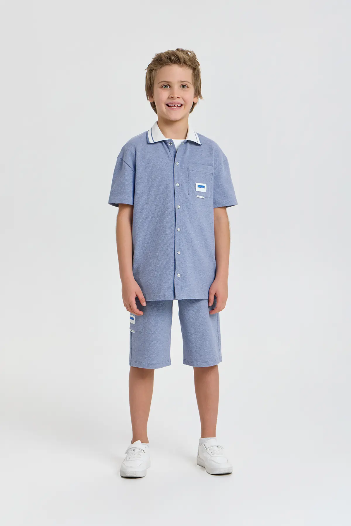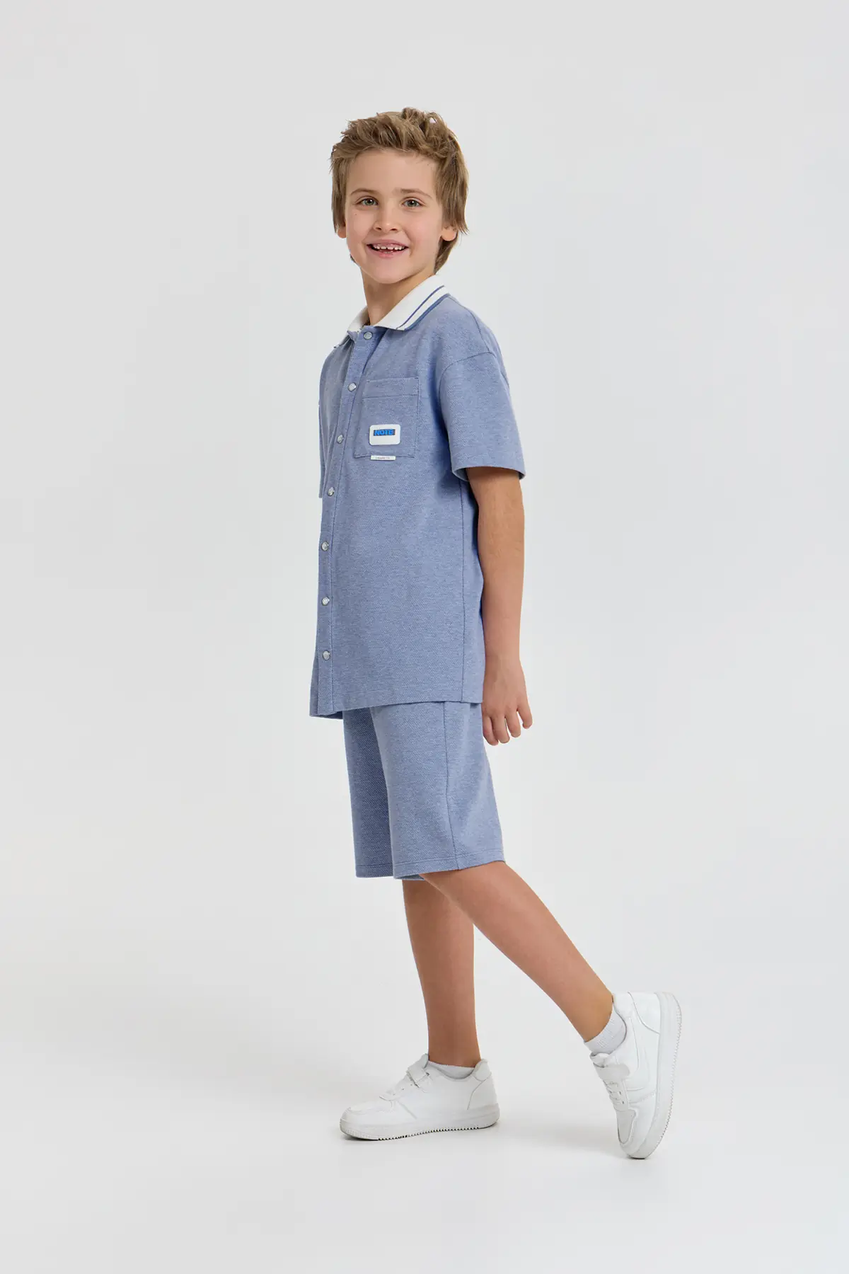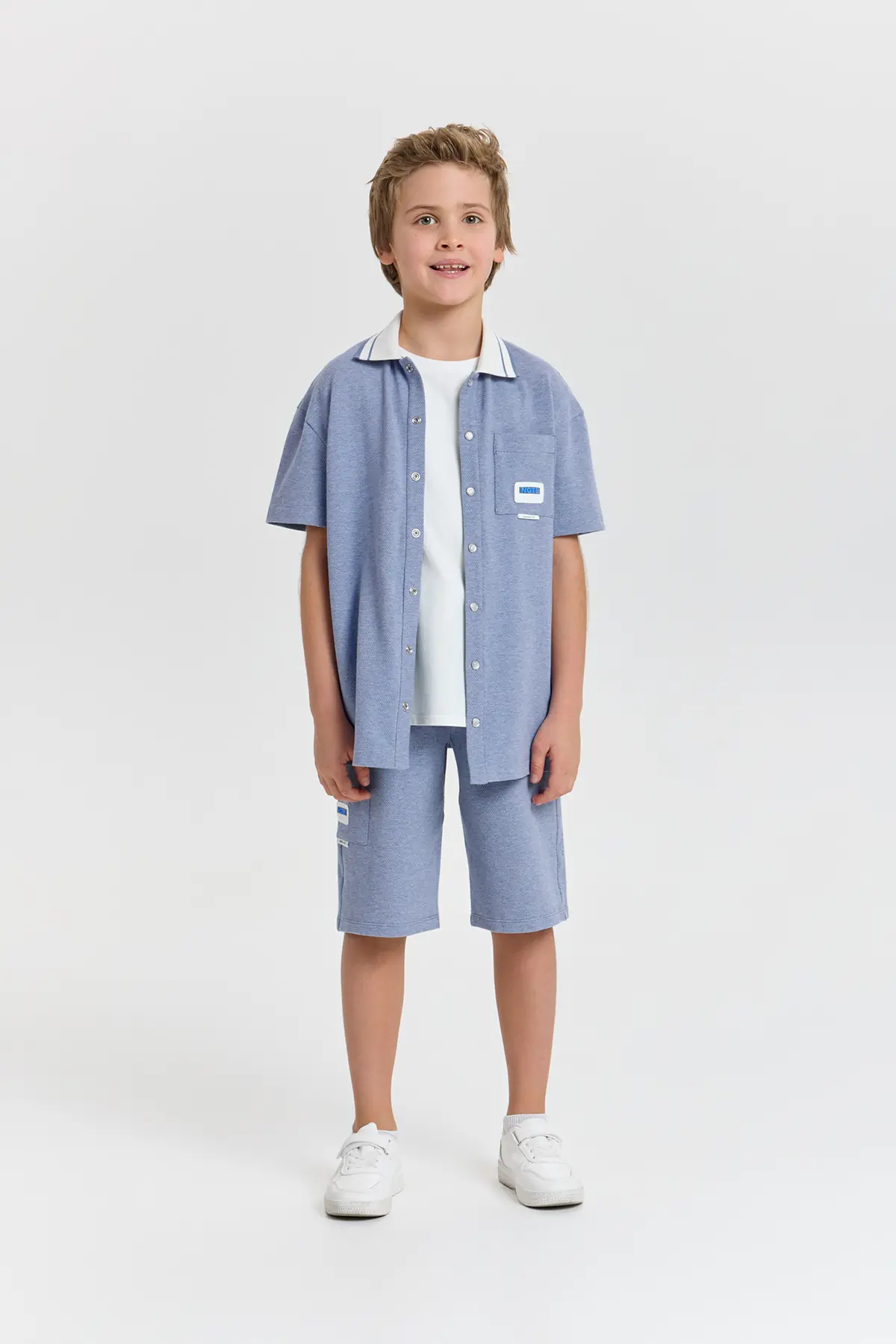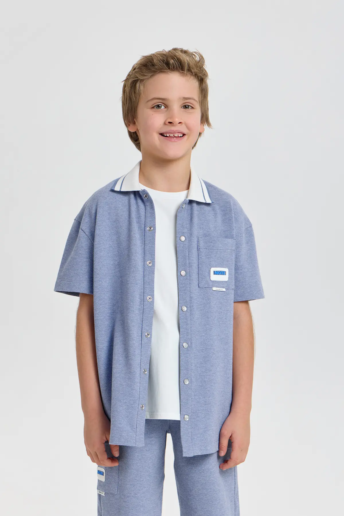 Лёгкая рубашка-жакет в изысканном серо-голубом цвете создана для мальчиков, которые ценят аккуратный внешний вид и стильные решения для особых случаев. Модель свободного силуэта выполнена из фактурной ... ткани, придающей образу выразительность и современное звучание. Дизайн дополнен отложным воротником, короткими рукавами и застёжкой на пуговицы, а накладной карман с лаконичным декором добавляет практичности и завершает образ. Такая рубашка-жакет станет отличным выбором для праздников, встреч и семейных мероприятий.
