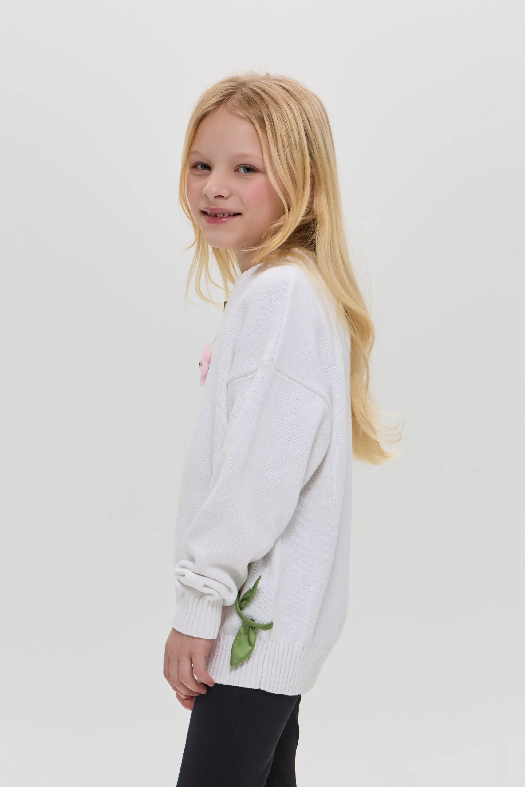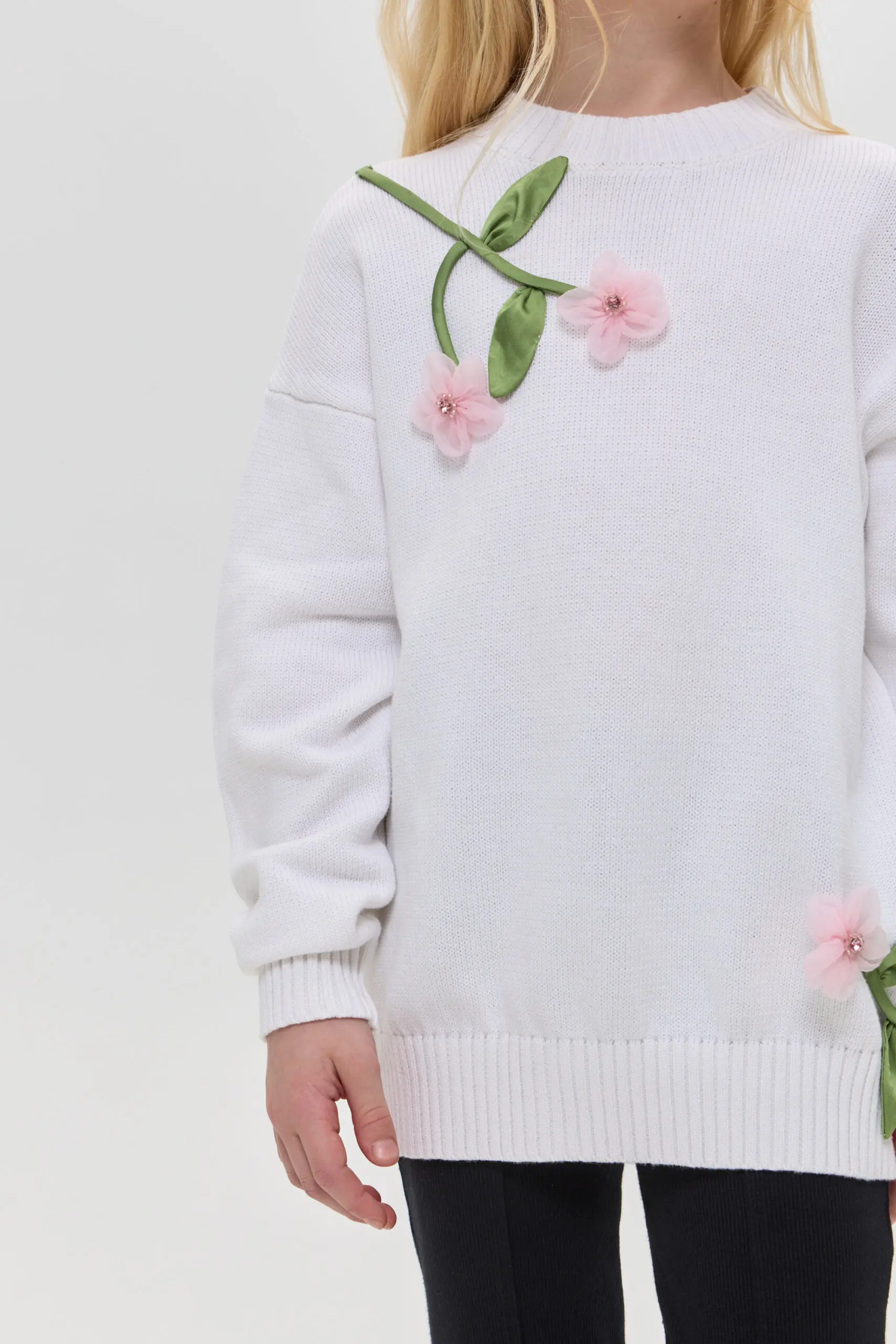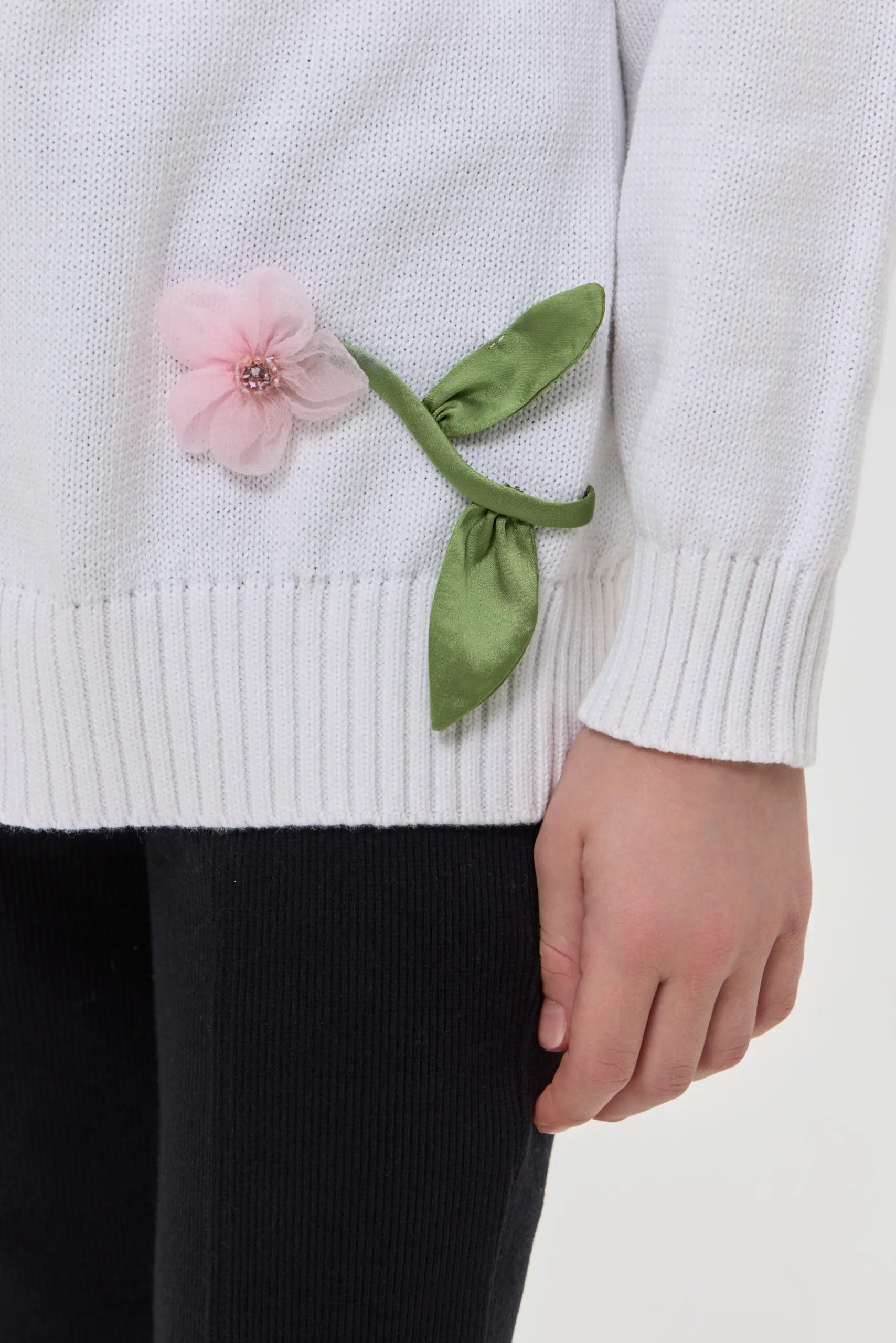 Вязаный свитер для девочки - отличный вариант для любого времени года. Он станет универсальным спутником на прогулках или на семейных праздниках. Свитер легко комбинируется с джинсами, ... юбками или леггинсами, позволяя девочкам выражать свой стиль и индивидуальность. Аппликация из объемных цветов украшенных стразами поможет создать по-настоящему весеннее настроение. Удобная округлая горловина, манжеты на рукавах и по низу изделия гарантируют комфортную посадку. Изготовленный из натурального хлопка, свитер обладает приятным на ощупь, мягким материалом.