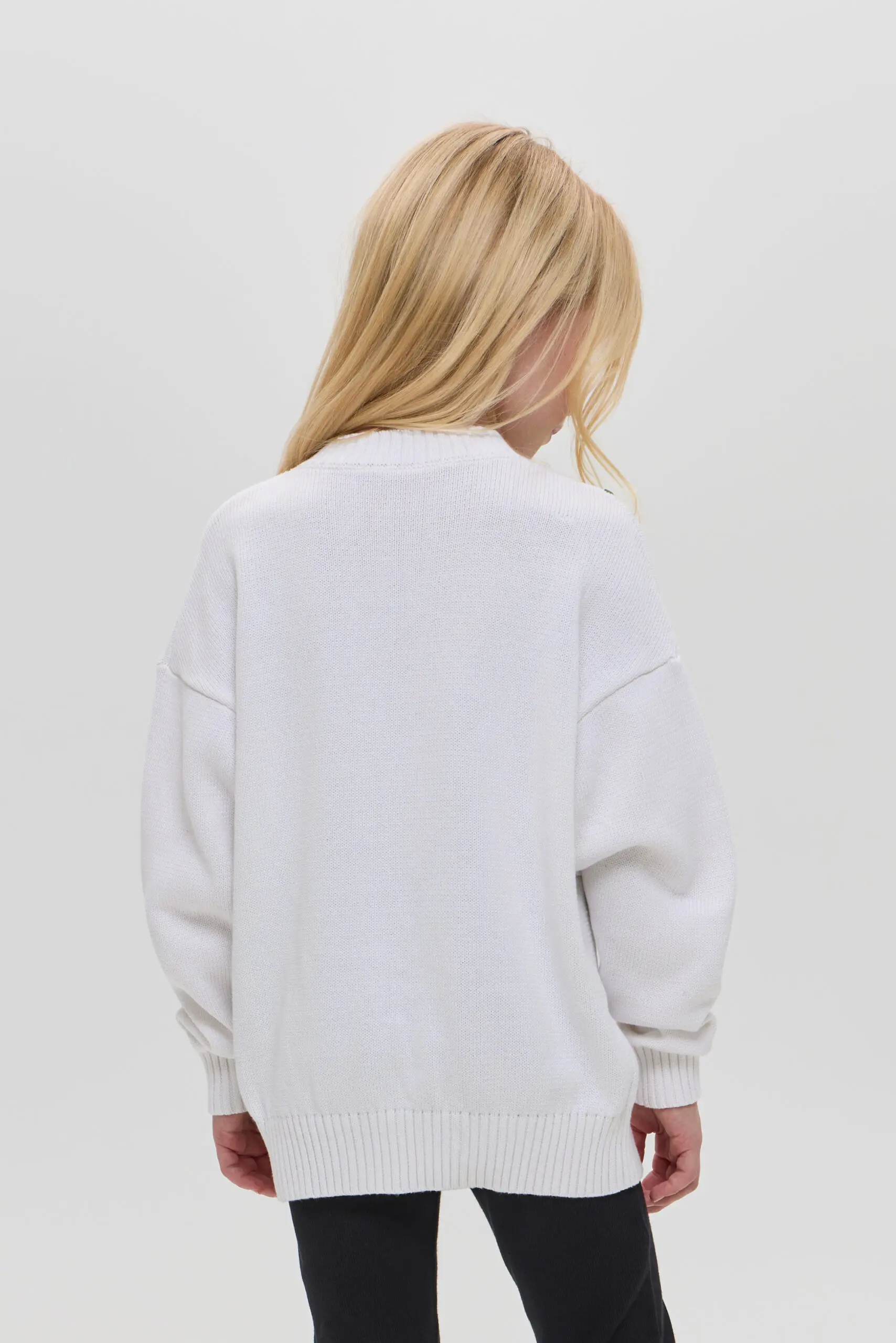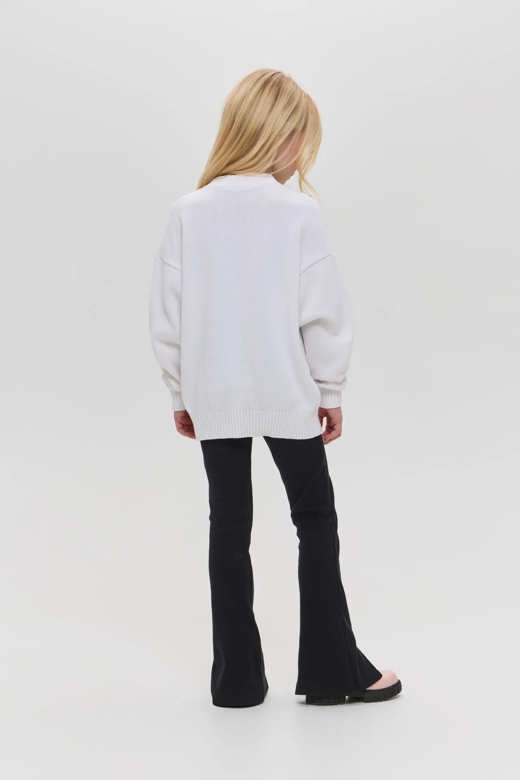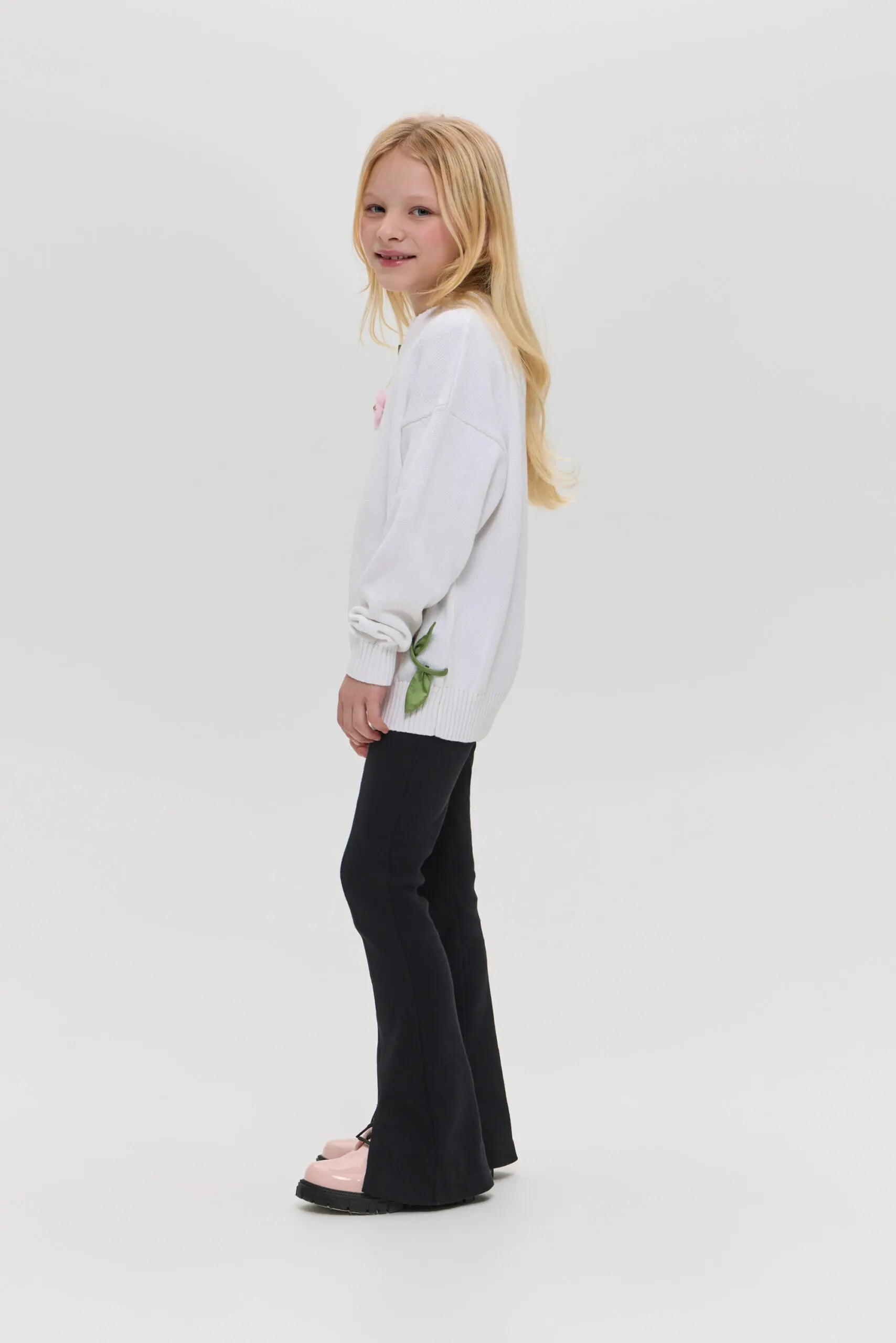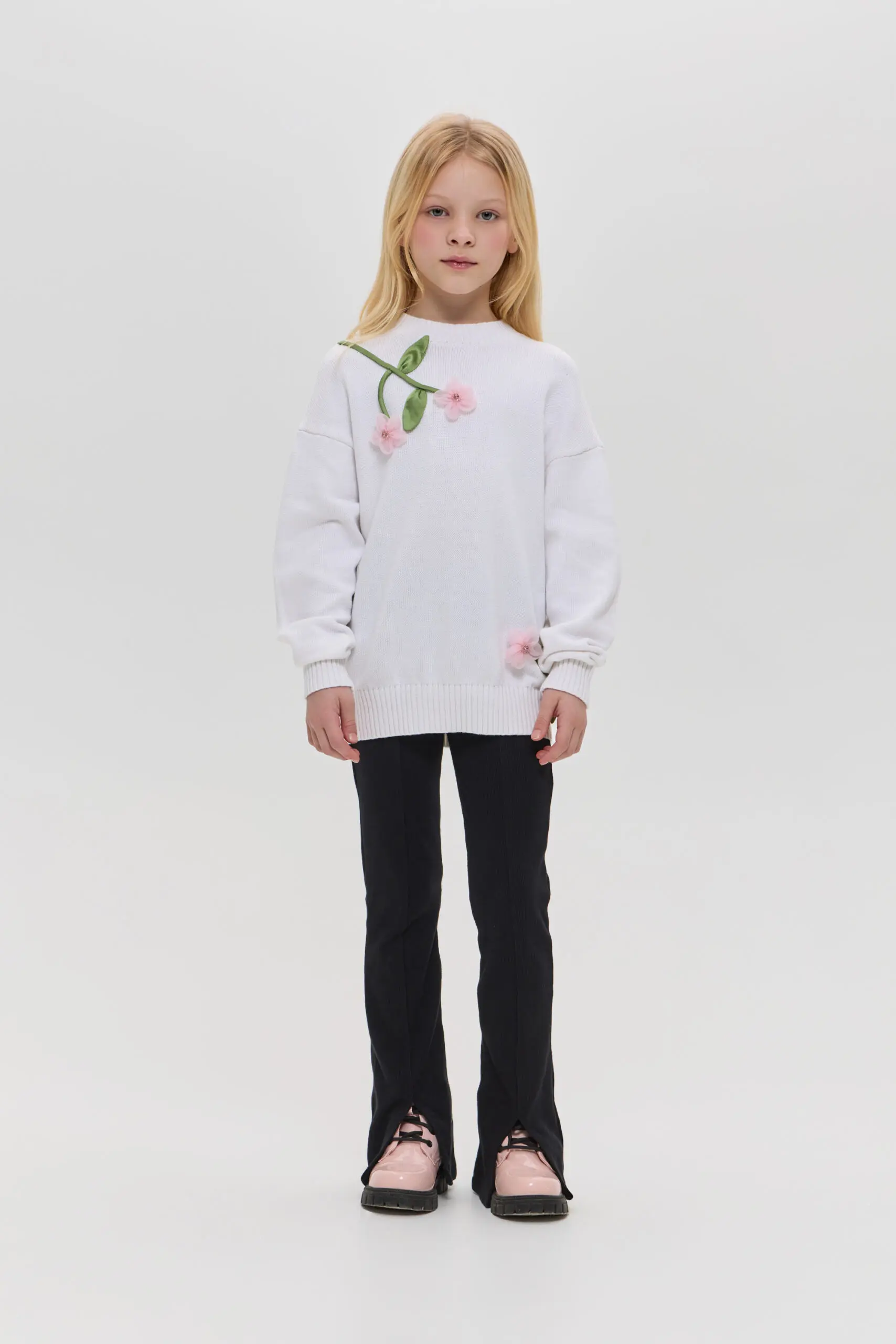 Вязаный свитер для девочки - отличный вариант для любого времени года. Он станет универсальным спутником на прогулках или на семейных праздниках. Свитер легко комбинируется с джинсами, ... юбками или леггинсами, позволяя девочкам выражать свой стиль и индивидуальность. Аппликация из объемных цветов украшенных стразами поможет создать по-настоящему весеннее настроение. Удобная округлая горловина, манжеты на рукавах и по низу изделия гарантируют комфортную посадку. Изготовленный из натурального хлопка, свитер обладает приятным на ощупь, мягким материалом.