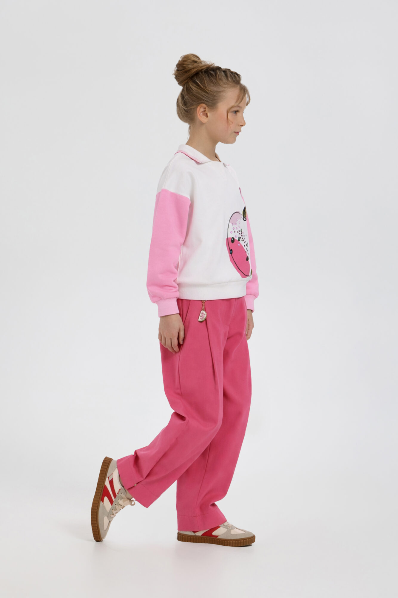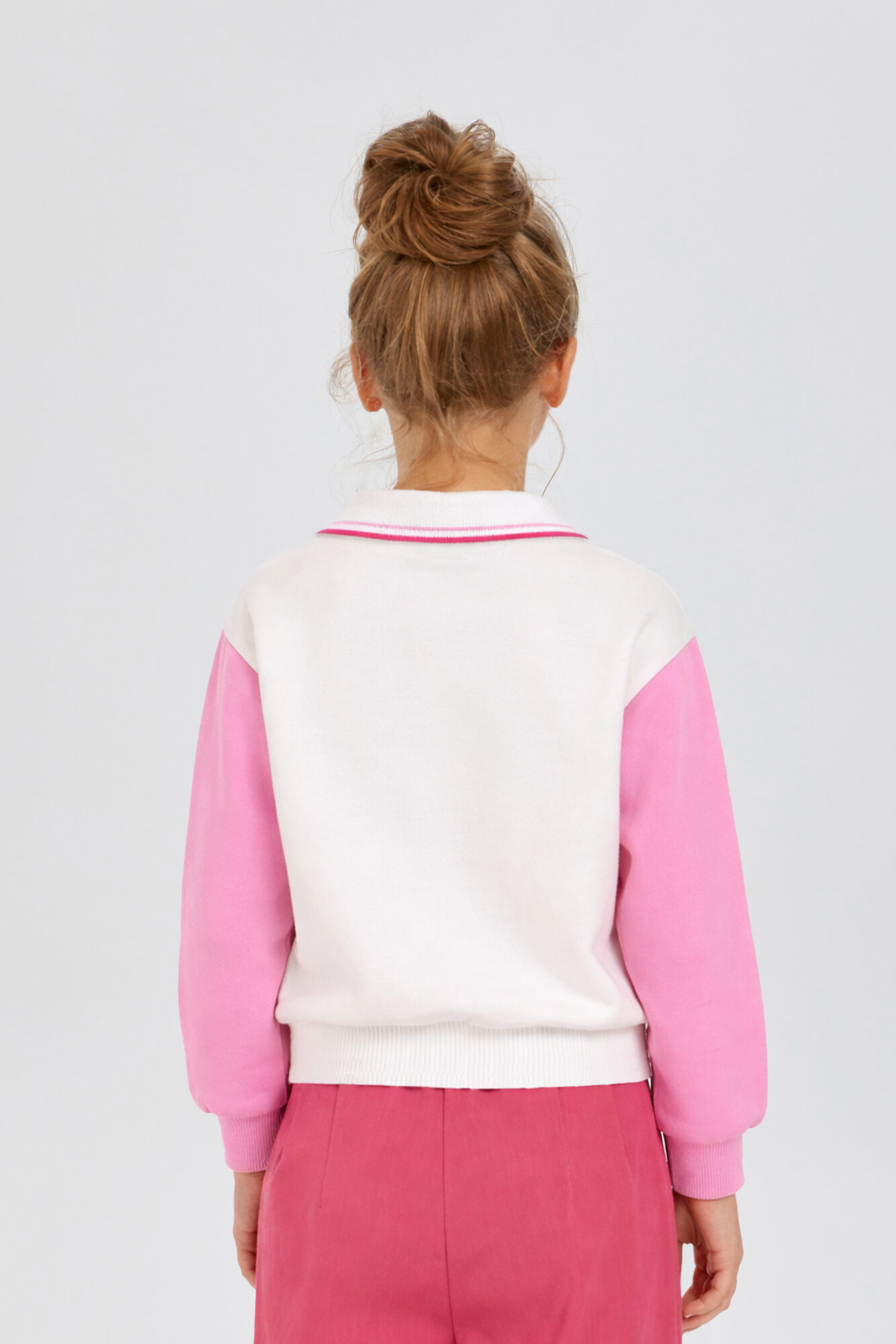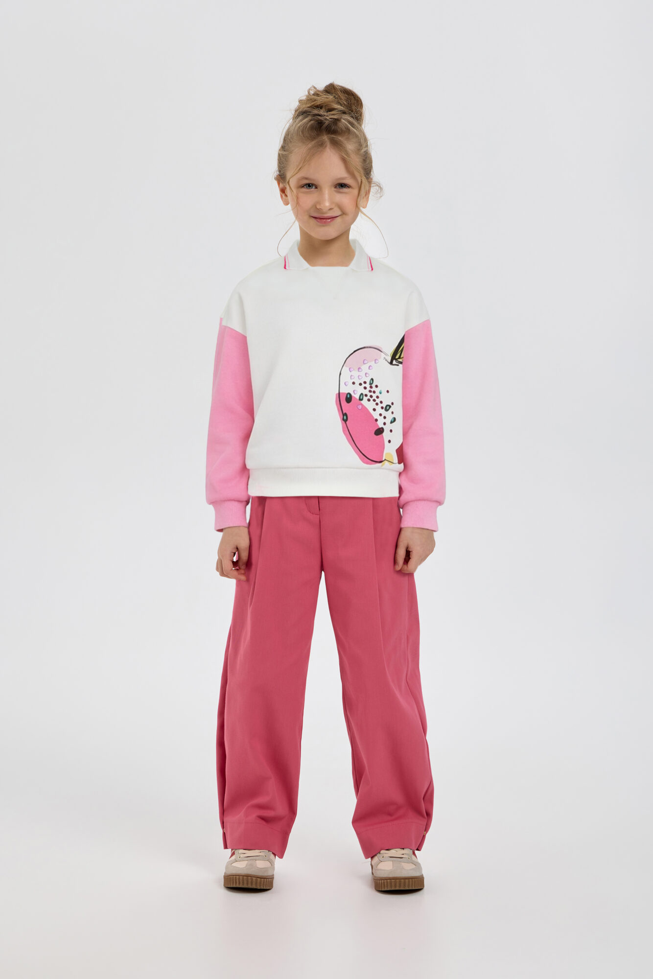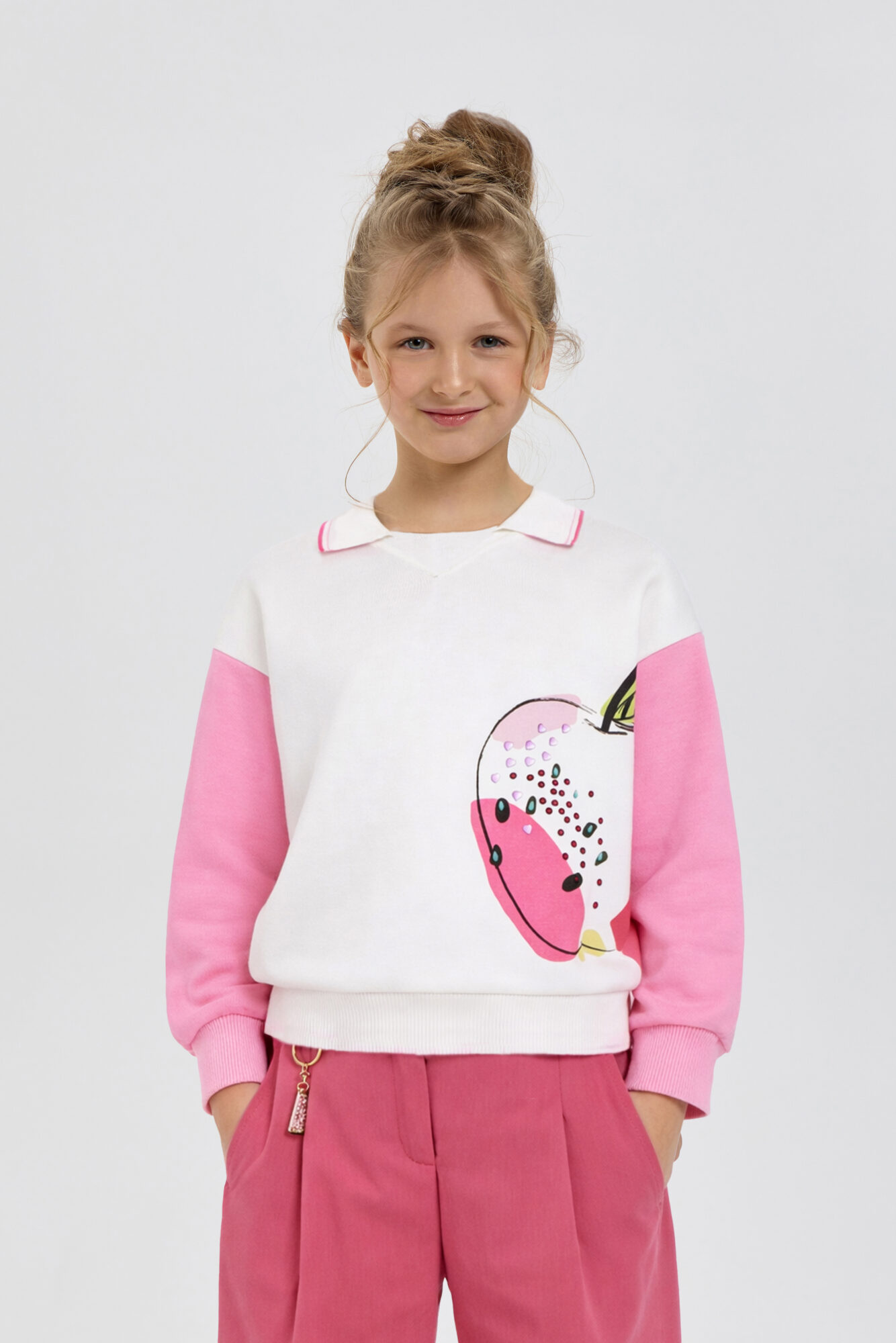 Комбинированный свитшот представляет собой модную и комфортную деталь одежды, идеально дополняющую гардероб юной особы. Изделие выполнено из качественного материала на основе хлопка. Оно имеет свободный силуэт, ... длинные рукава и отложной ворот. Широкие резинки на манжетах и по нижнему краю гарантируют удобство, делая модель не просто привлекательной, но и практичной. Свитшот украшен выразительным принтом. Данная дизайнерская особенность добавляет вещи яркости и помогает подчеркнуть индивидуальность владелицы. Эта модель отлично сочетается с многочисленными элементами одежды — её можно носить с брюками, джинсами или юбками, формируя различные стилистические решения. Такой свитшот подходит для повседневной носки и для неформальных выходов, что обеспечивает его универсальность и делает востребованным в любой коллекции вещей.