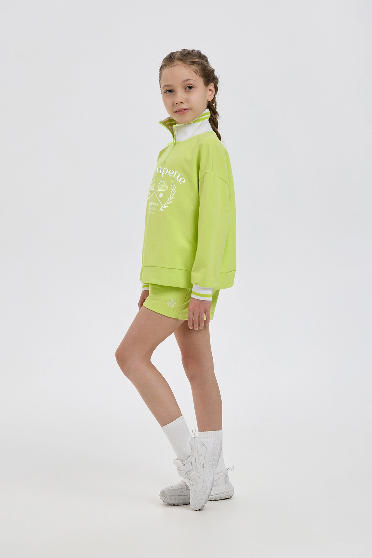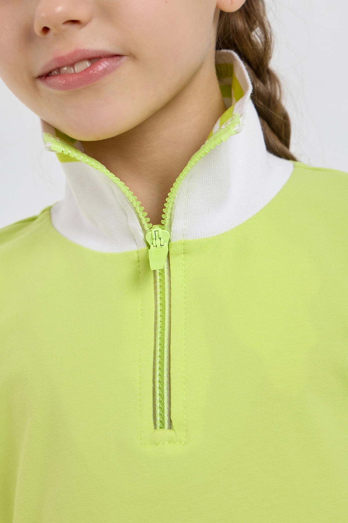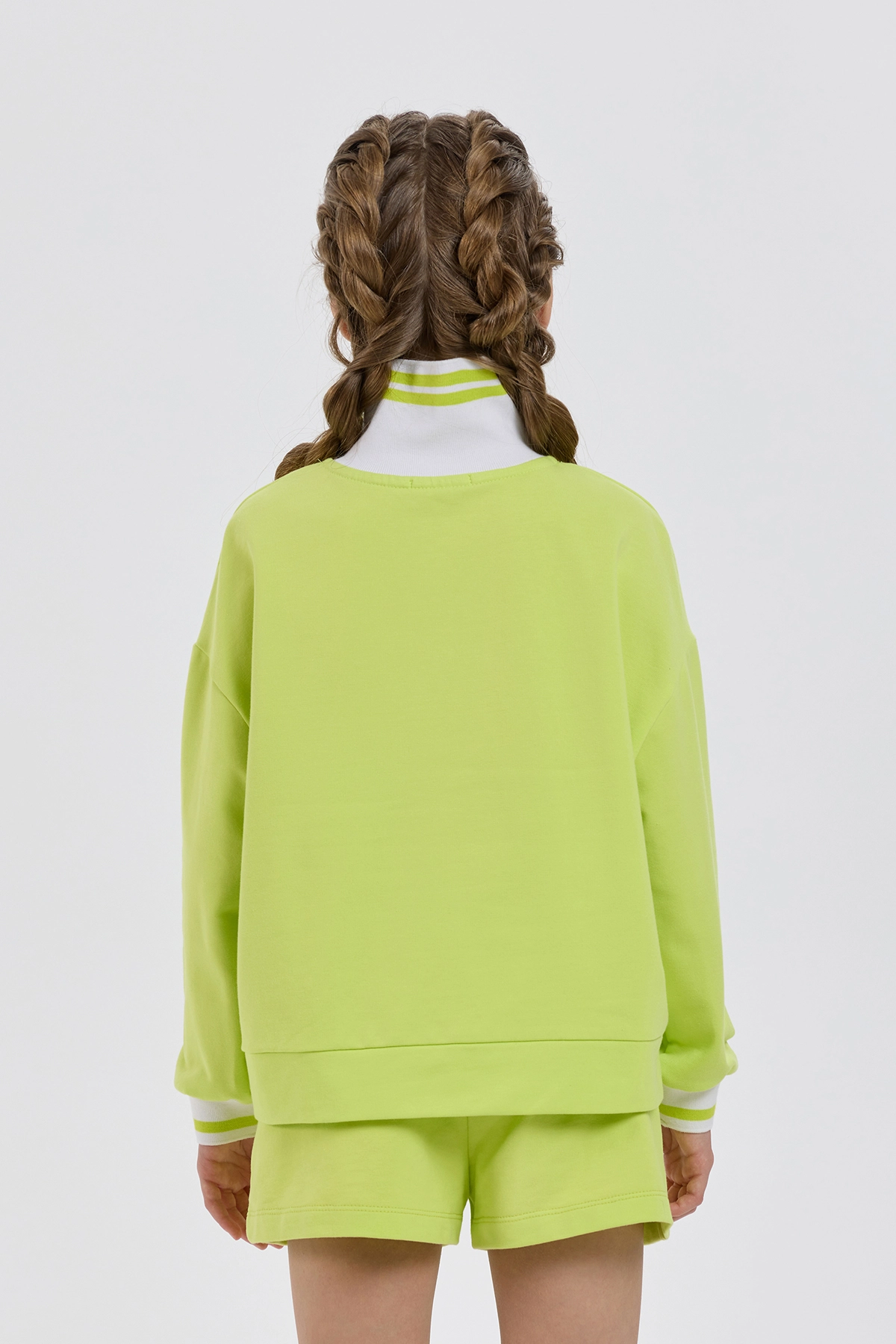 Яркий спортивный свитшот станет отличным выбором для тренировок, репетиций, соревнований и активного отдыха. Яркая салатовая цветовая гамма придает модели свежесть и динамику, а минималистичный дизайн соответствует ... актуальным тенденциям детской спортивной моды и танцевальной уличной культуры. Модель свободного силуэта выполнена с длинными рукавами и дополнена высоким воротником-стойкой с короткой молнией, что делает изделие особенно удобным и практичным. Контрастные детали на воротнике и манжетах придают модели аккуратный и современный вид, а мягкая эластичная резинка по низу обеспечивает комфортную посадку. Свитшот выполнен из мягкого и приятного к телу материала, который хорошо сохраняет тепло и при этом позволяет коже дышать. Модель отлично подходит для тренировок, занятий в студии, активных прогулок и повседневной носки. Она легко сочетается с шортами, легинсами и спортивной обувью, создавая модные спортивные и повседневные образы.