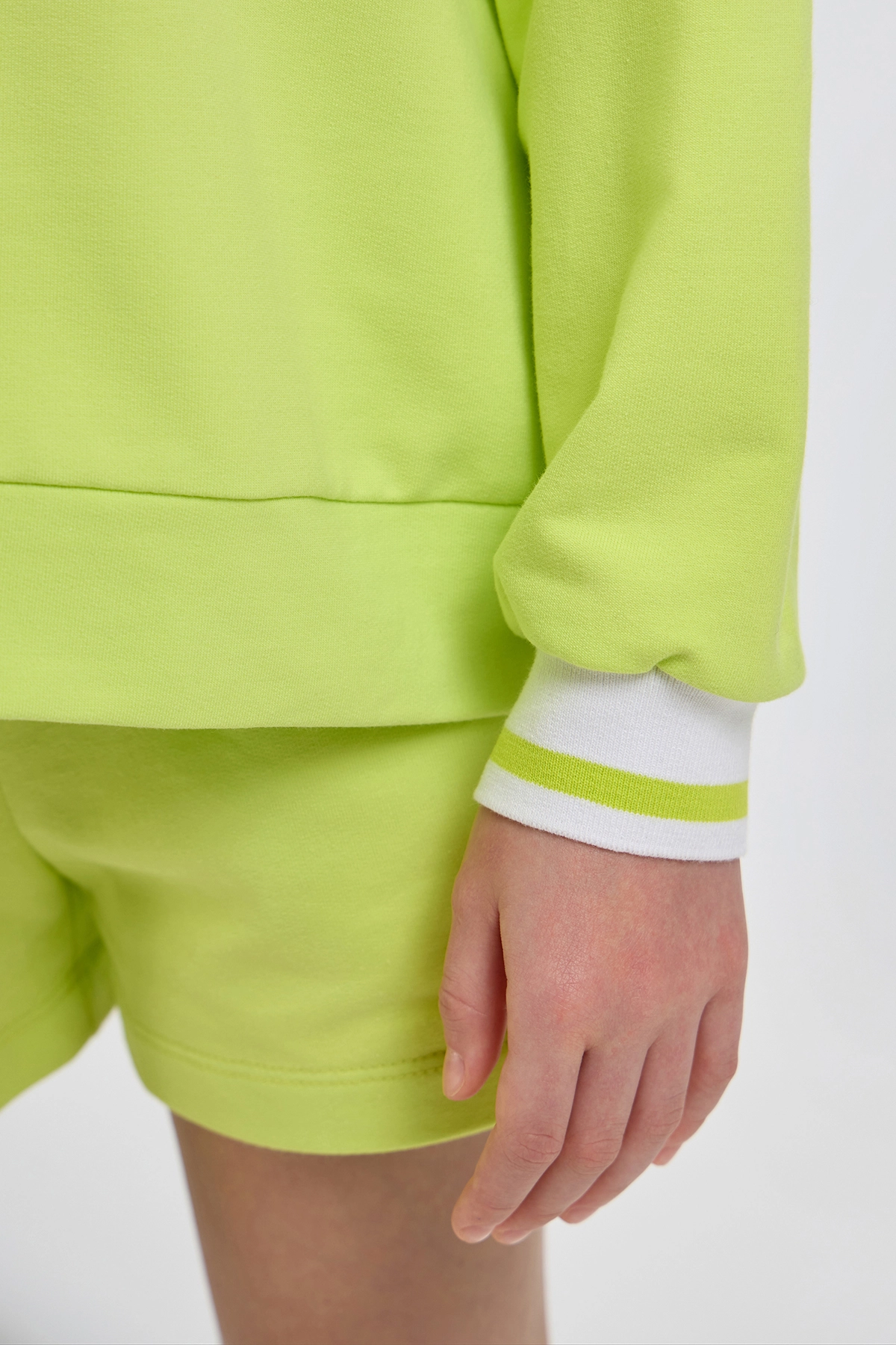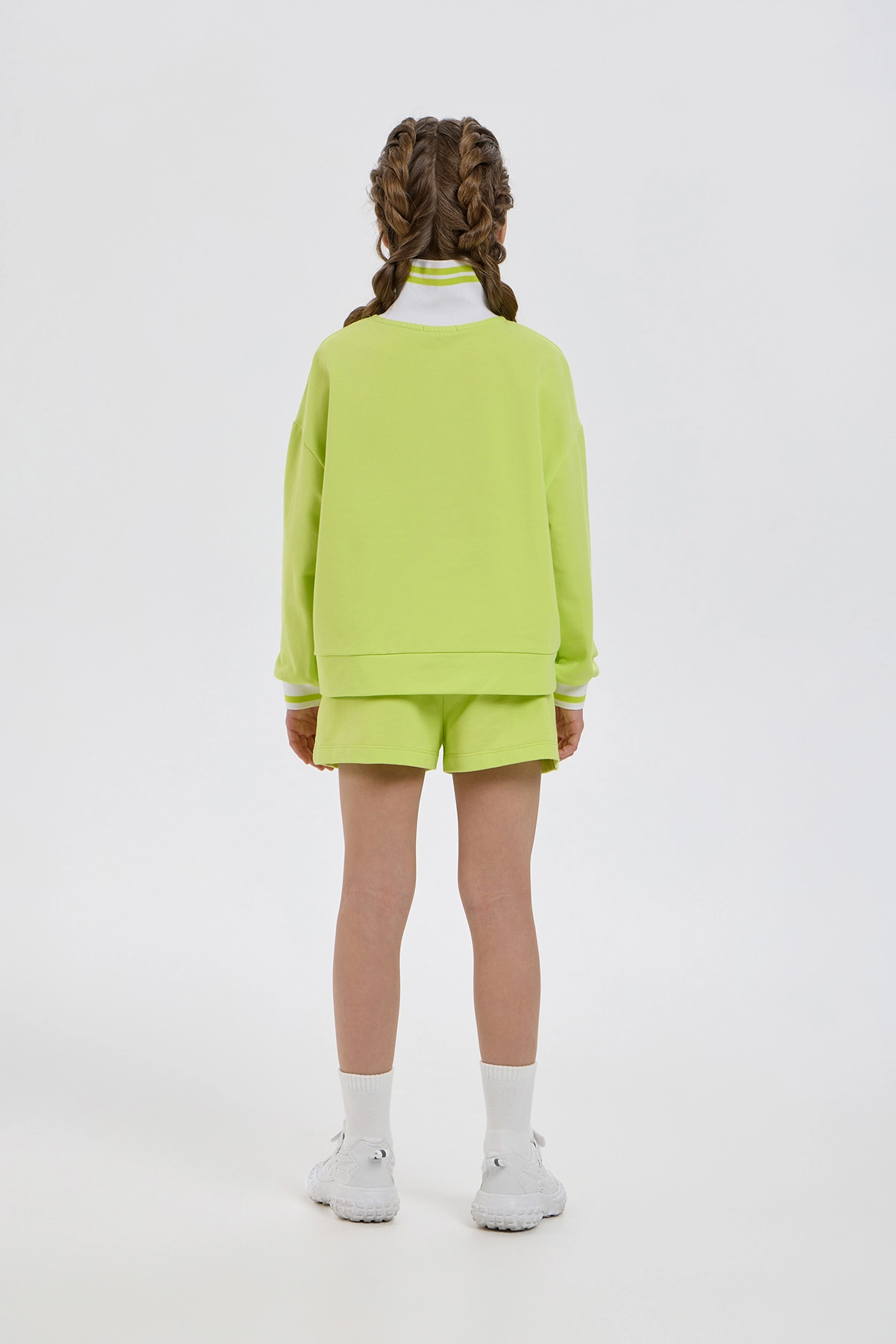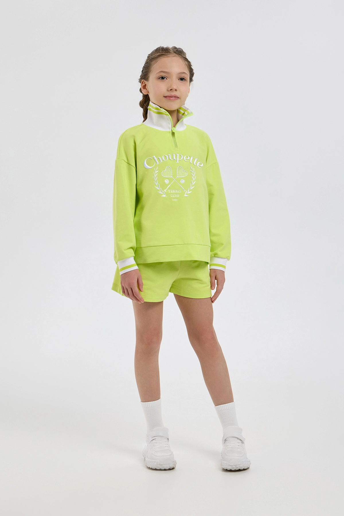 Яркий спортивный свитшот станет отличным выбором для тренировок, репетиций, соревнований и активного отдыха. Яркая салатовая цветовая гамма придает модели свежесть и динамику, а минималистичный дизайн соответствует ... актуальным тенденциям детской спортивной моды и танцевальной уличной культуры. Модель свободного силуэта выполнена с длинными рукавами и дополнена высоким воротником-стойкой с короткой молнией, что делает изделие особенно удобным и практичным. Контрастные детали на воротнике и манжетах придают модели аккуратный и современный вид, а мягкая эластичная резинка по низу обеспечивает комфортную посадку. Свитшот выполнен из мягкого и приятного к телу материала, который хорошо сохраняет тепло и при этом позволяет коже дышать. Модель отлично подходит для тренировок, занятий в студии, активных прогулок и повседневной носки. Она легко сочетается с шортами, легинсами и спортивной обувью, создавая модные спортивные и повседневные образы.