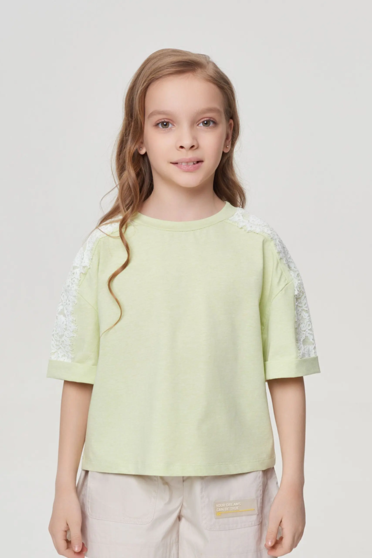 Короткие рукава топа декорированы широким кружевом, добавляя ему нежности.
