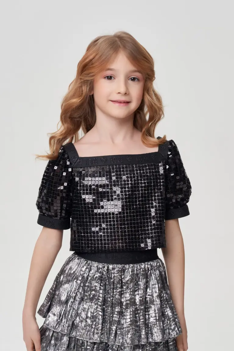 Нарядный топ для девочки выполнен в черном цвете из ткани, усыпанной пайетками квадратной формы. Модель с квадратным вырезом горловины и короткими рукавами-фонариками. Комфортный прямой силуэт обеспечивает ... ребенку удобство. Черный цвет позволяет подобрать к топу любой низ, изменяя при этом вид готового комплекта.