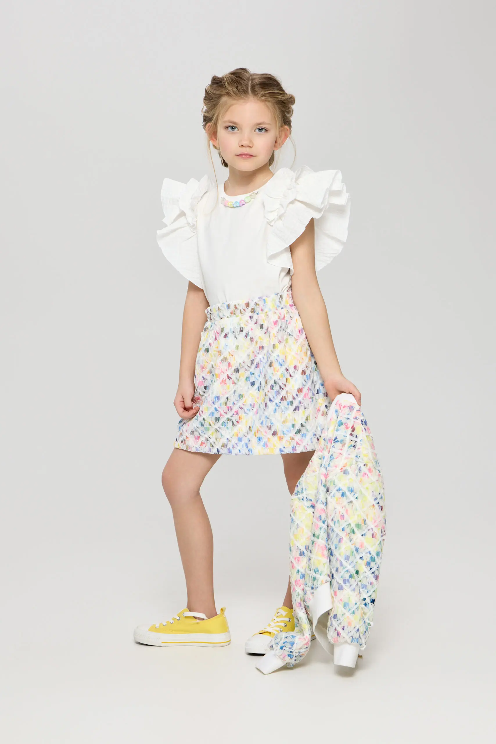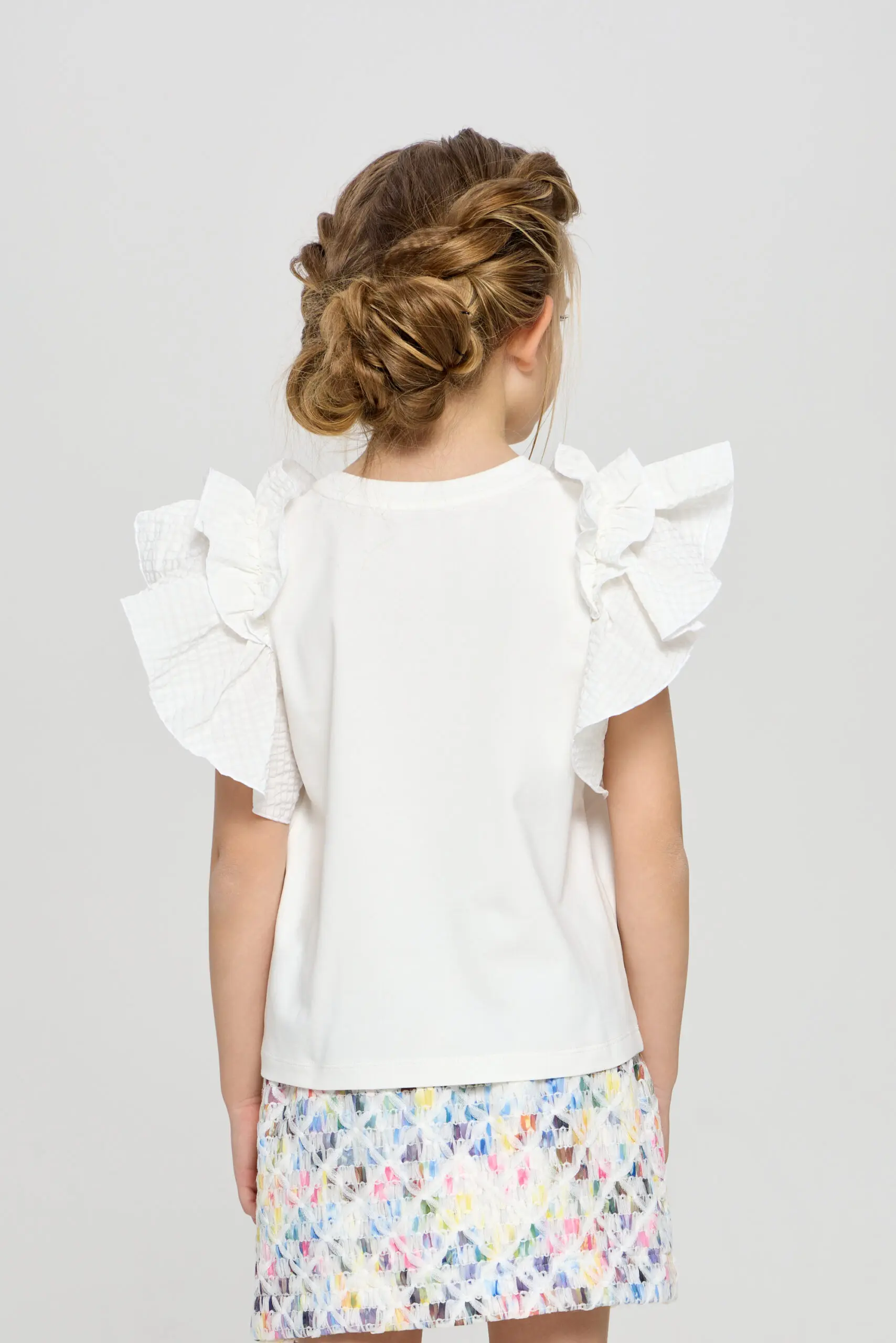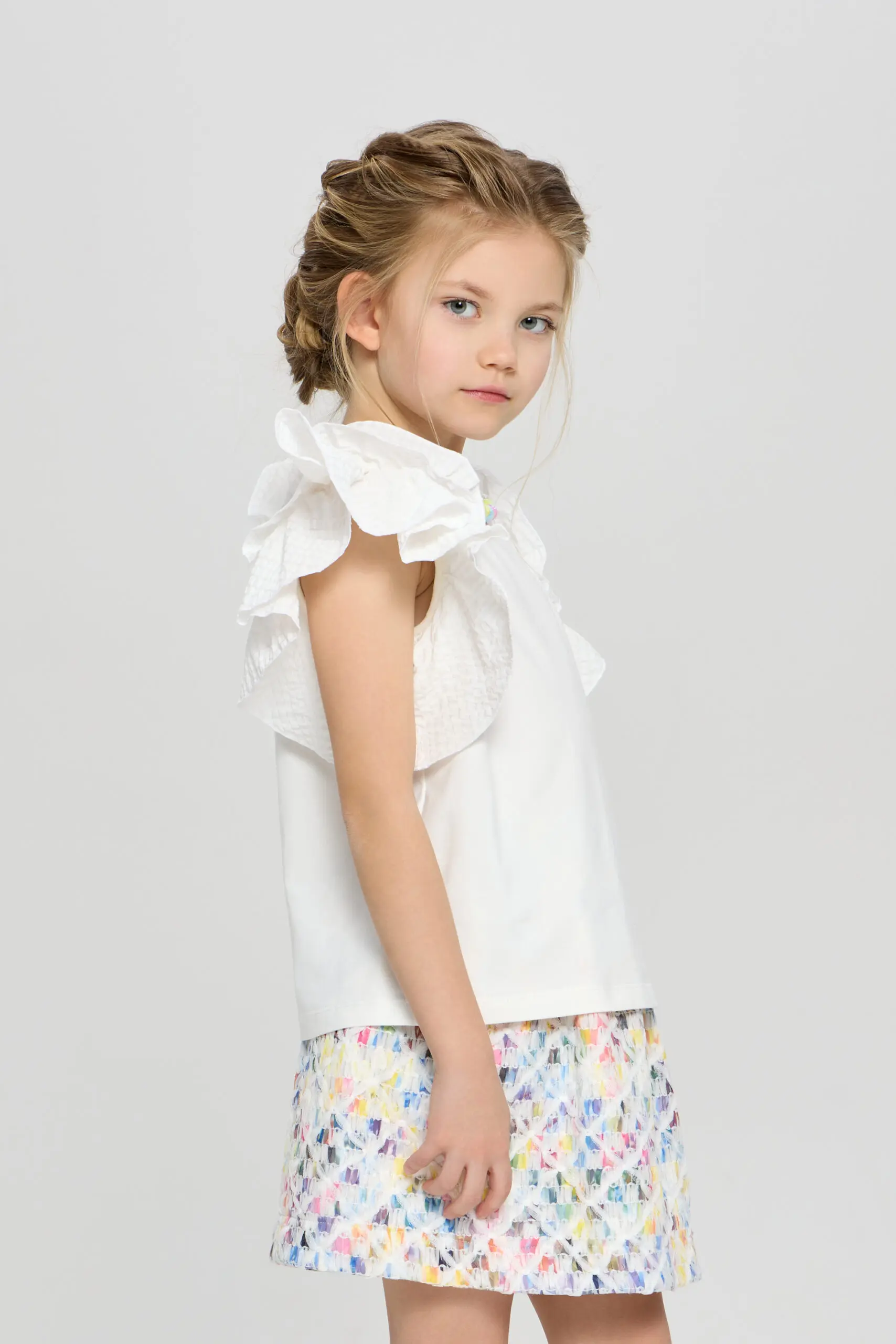 Очаровательный топ для девочки выполнен в белом цвете, что делает его универсальным элементом гардероба. Пышные рукава-воланы придают модели игривый и романтичный вид, идеально подходящий для маленьких ... модниц. Топ украшен декоративными бусами, которые добавляют яркий акцент и делают изделие уникальным. Изготовлена модель из мягкого и дышащего материала на основе натурального хлопка, что говорит о ее высоких гигиенических свойствах.