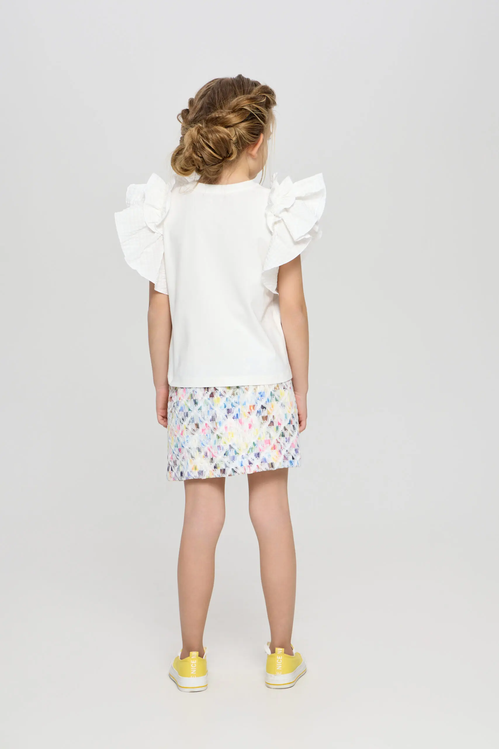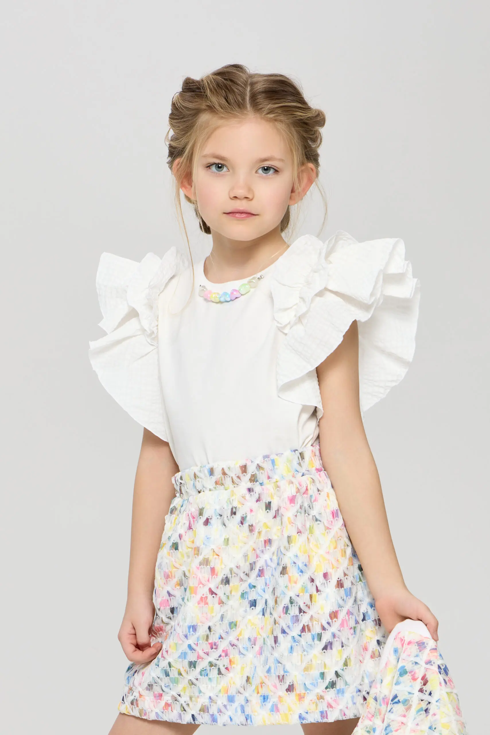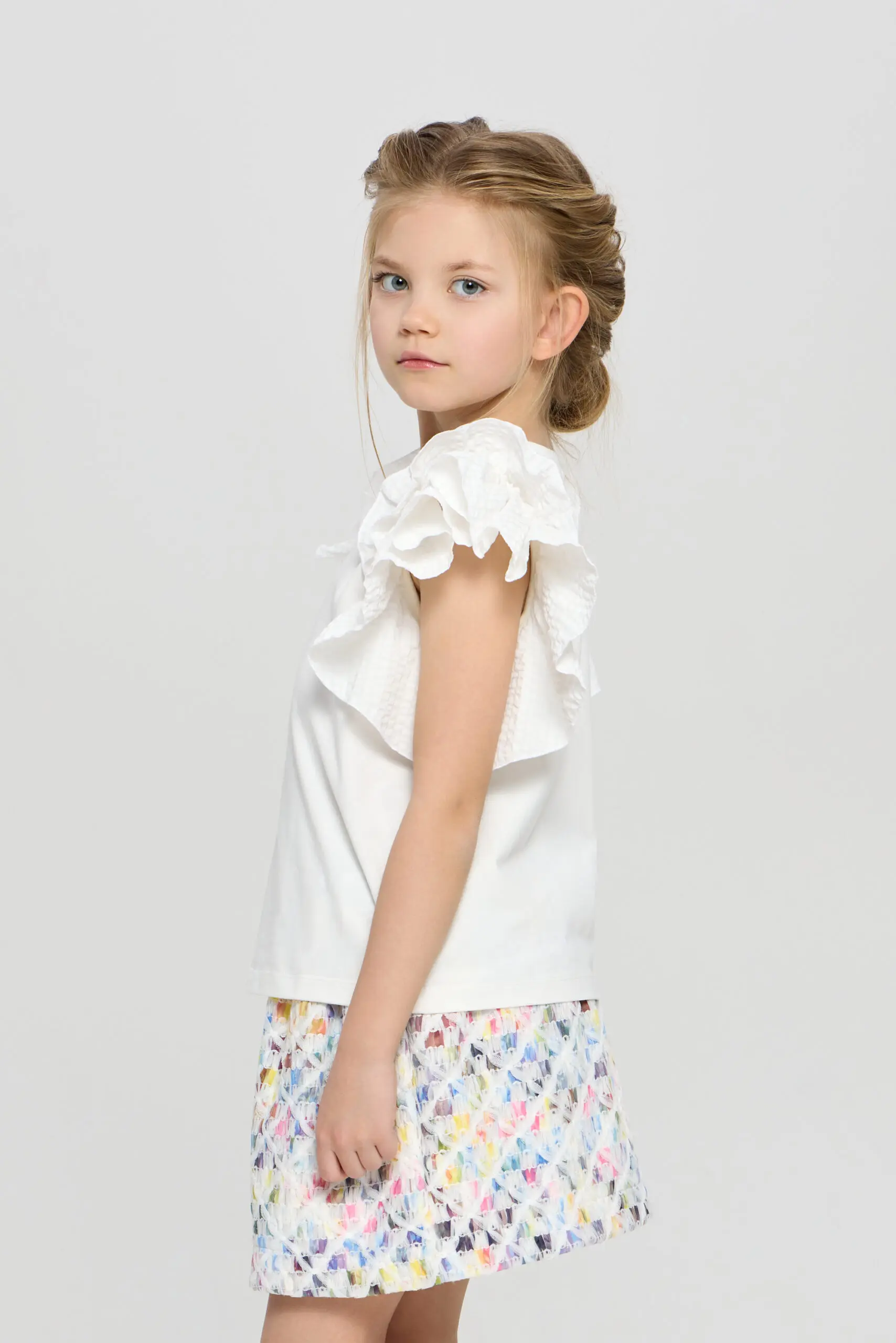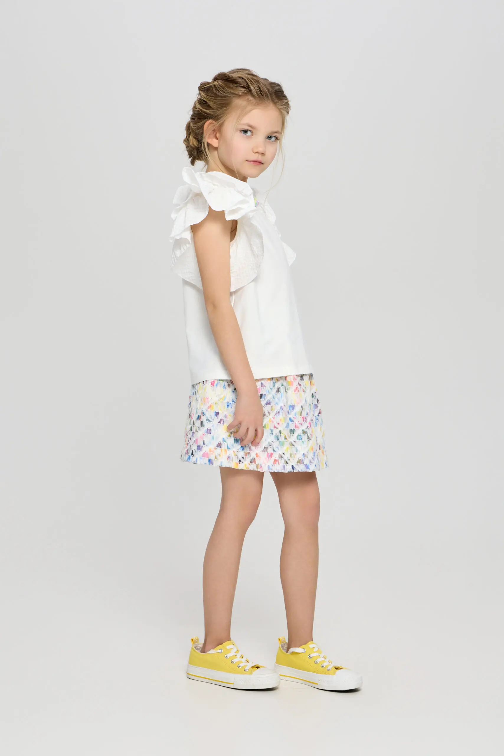 Очаровательный топ для девочки выполнен в белом цвете, что делает его универсальным элементом гардероба. Пышные рукава-воланы придают модели игривый и романтичный вид, идеально подходящий для маленьких ... модниц. Топ украшен декоративными бусами, которые добавляют яркий акцент и делают изделие уникальным. Изготовлена модель из мягкого и дышащего материала на основе натурального хлопка, что говорит о ее высоких гигиенических свойствах.