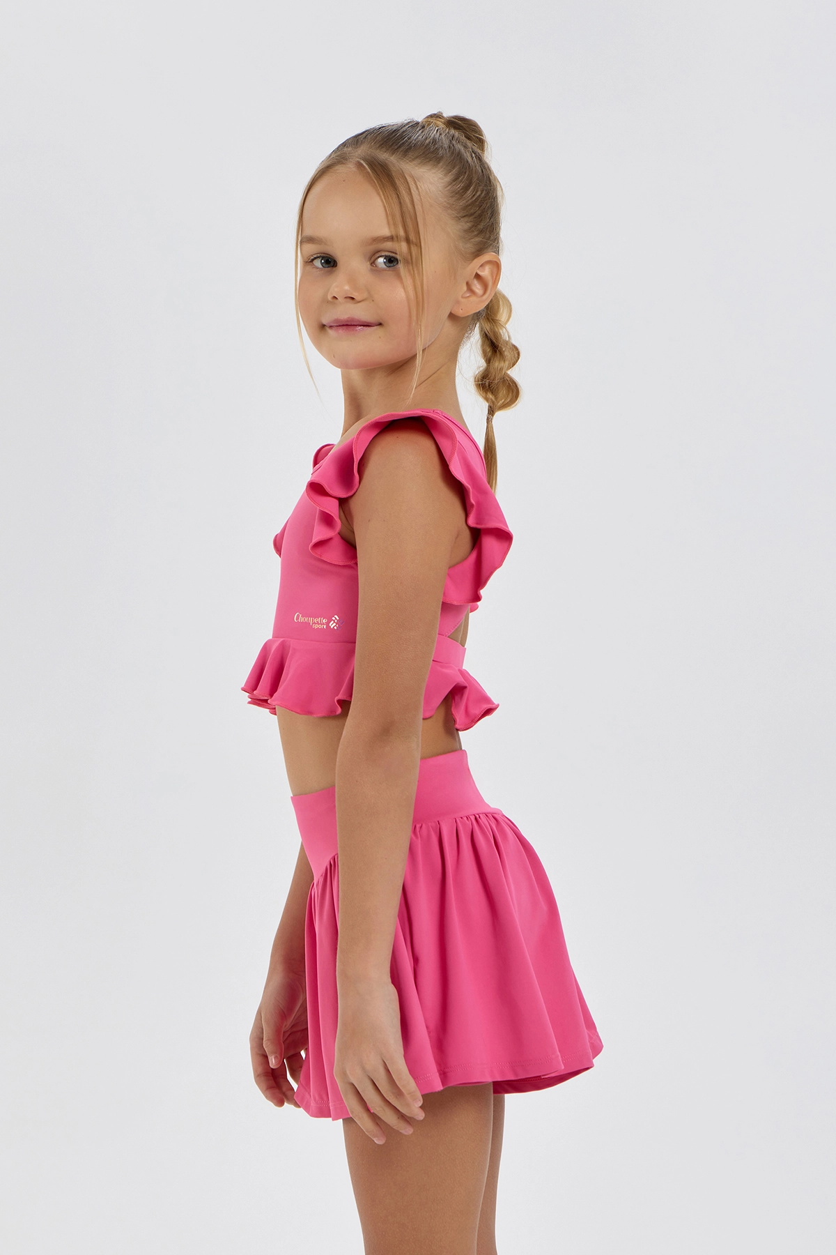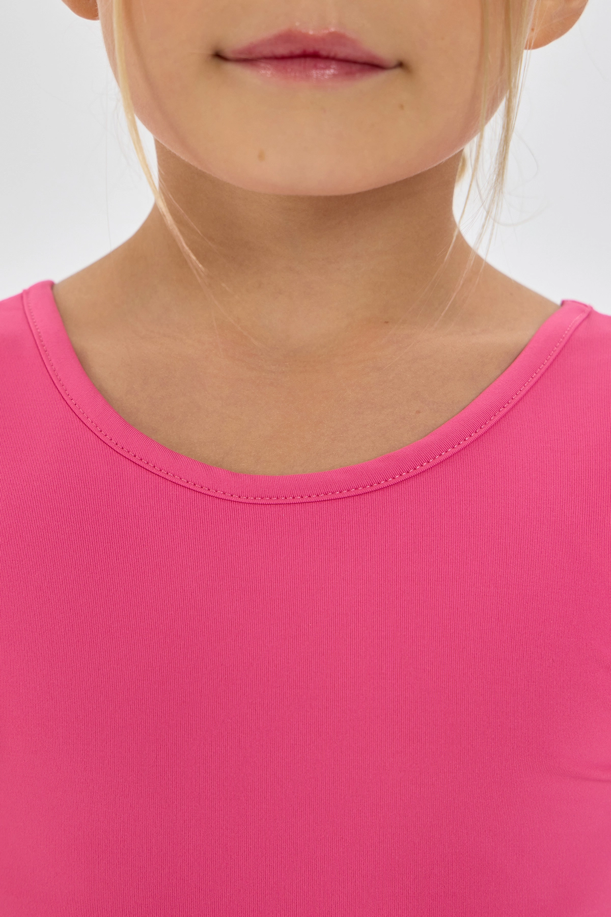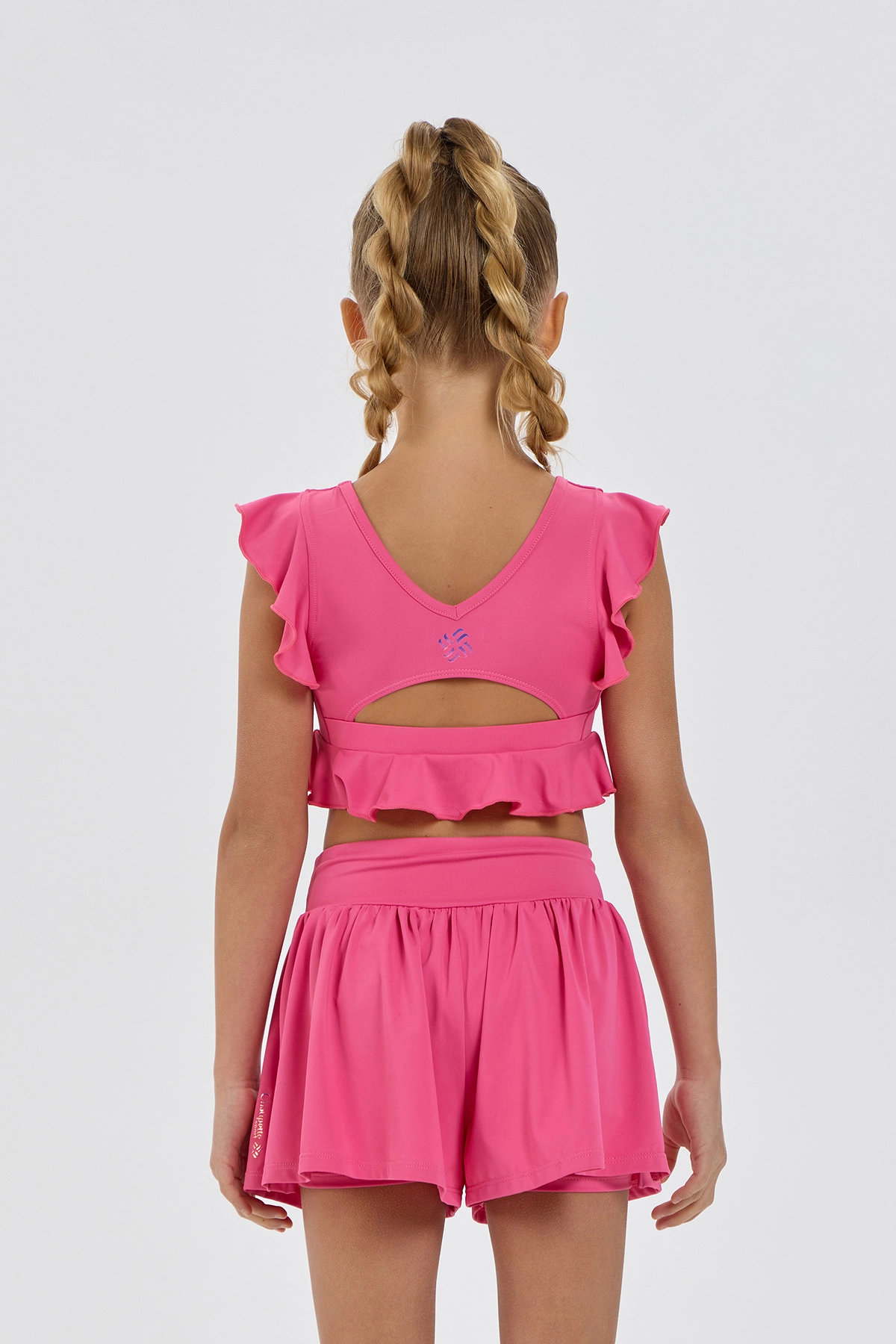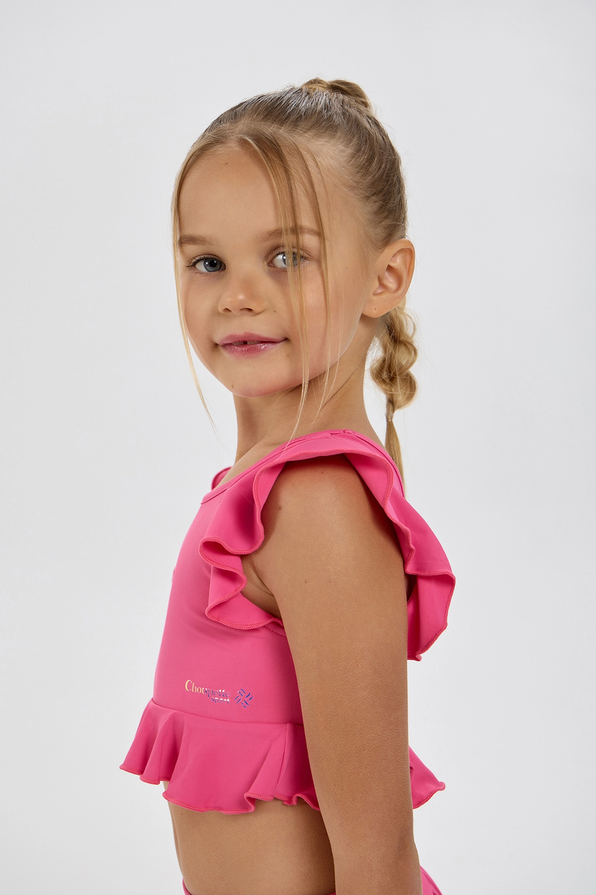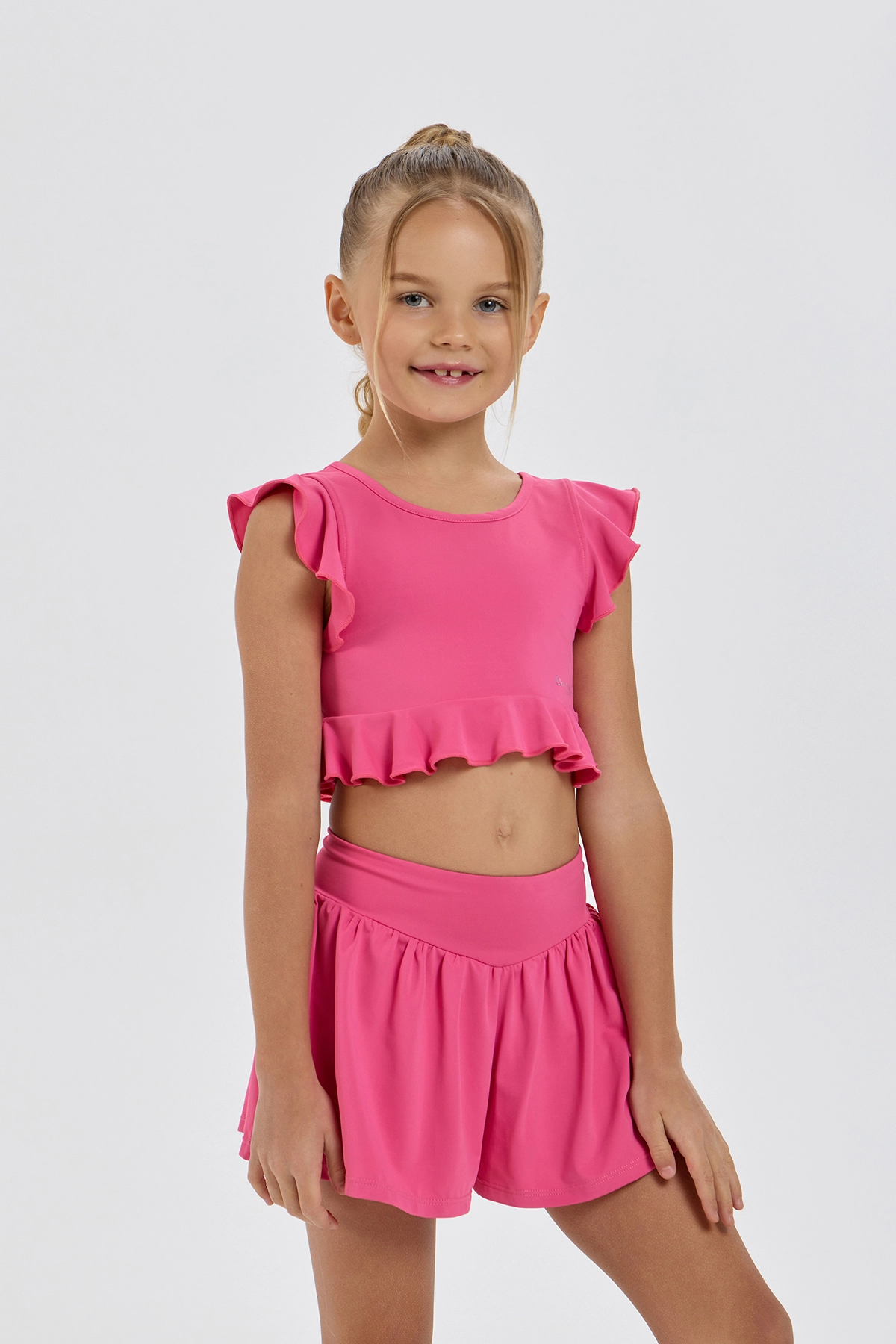 Яркий спортивный топ для девочек отлично подходит для занятий гимнастикой, танцами, фитнесом и студийных тренировок, а также для прогулок и активного отдыха. Модель укороченного кроя имеет ... прилегающий силуэт. Топ украшен аккуратными рукавами-крылышками и декоративной оборкой по нижнему краю. Модель выполнена из современного эластичного материала с применением технологии влагоотведения. Топ легко комбинируется с шортами, легинсами, со спортивной обувью и аксессуарами, создавая стильные и современные спортивные образы.