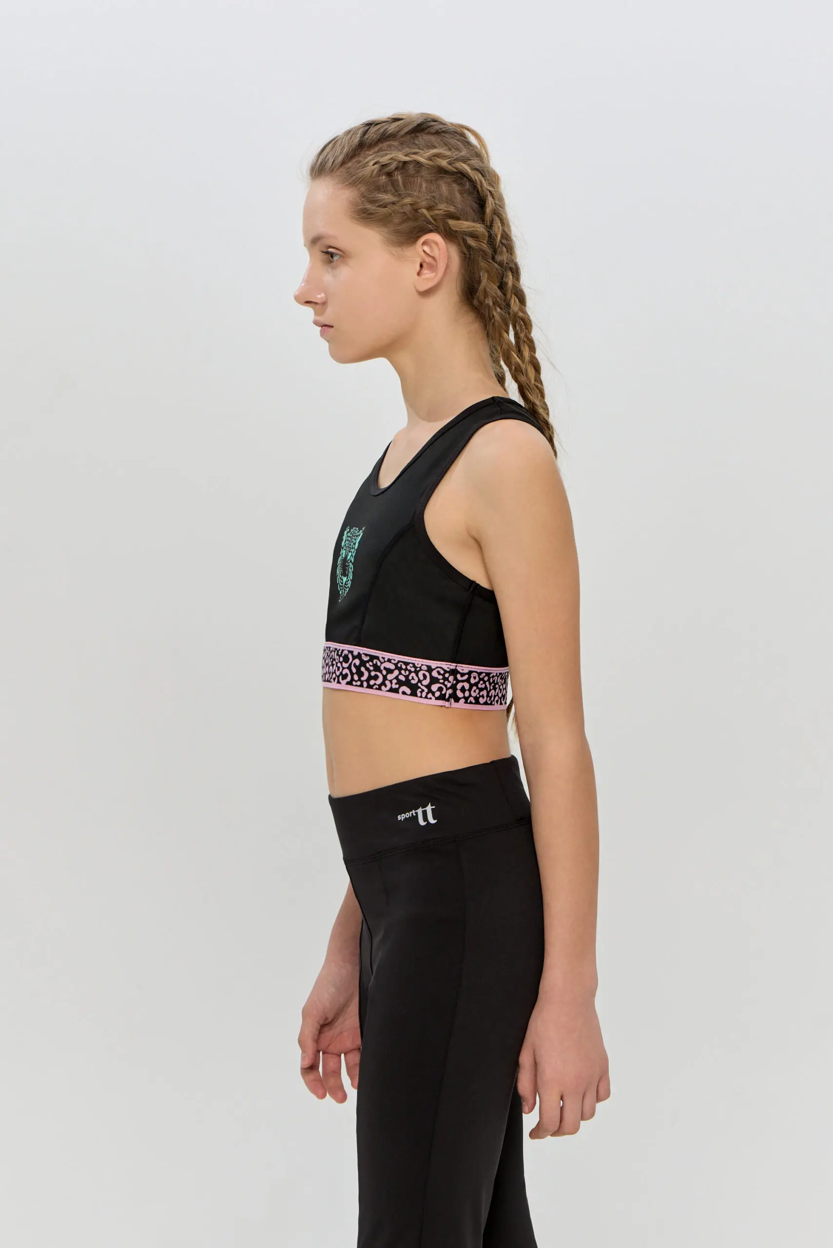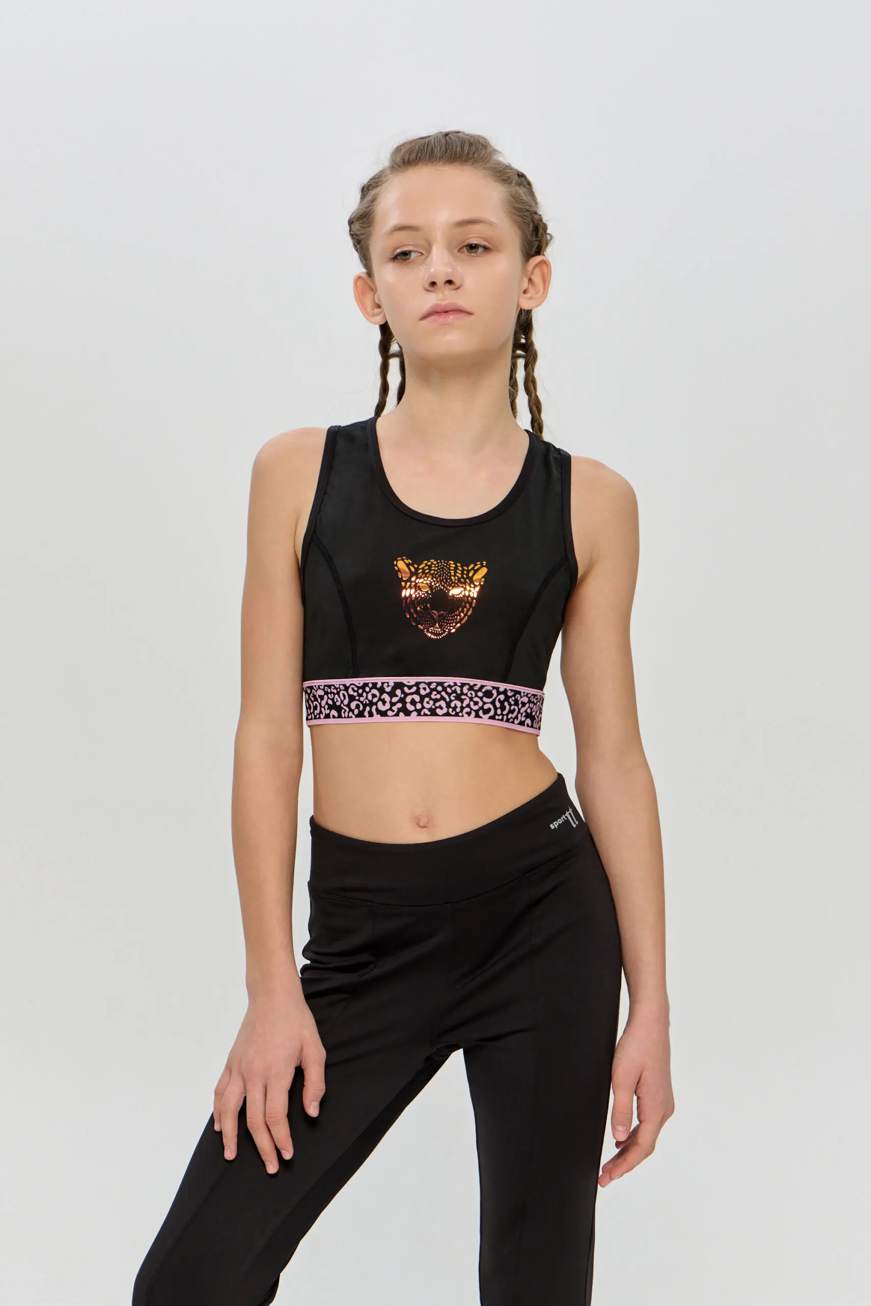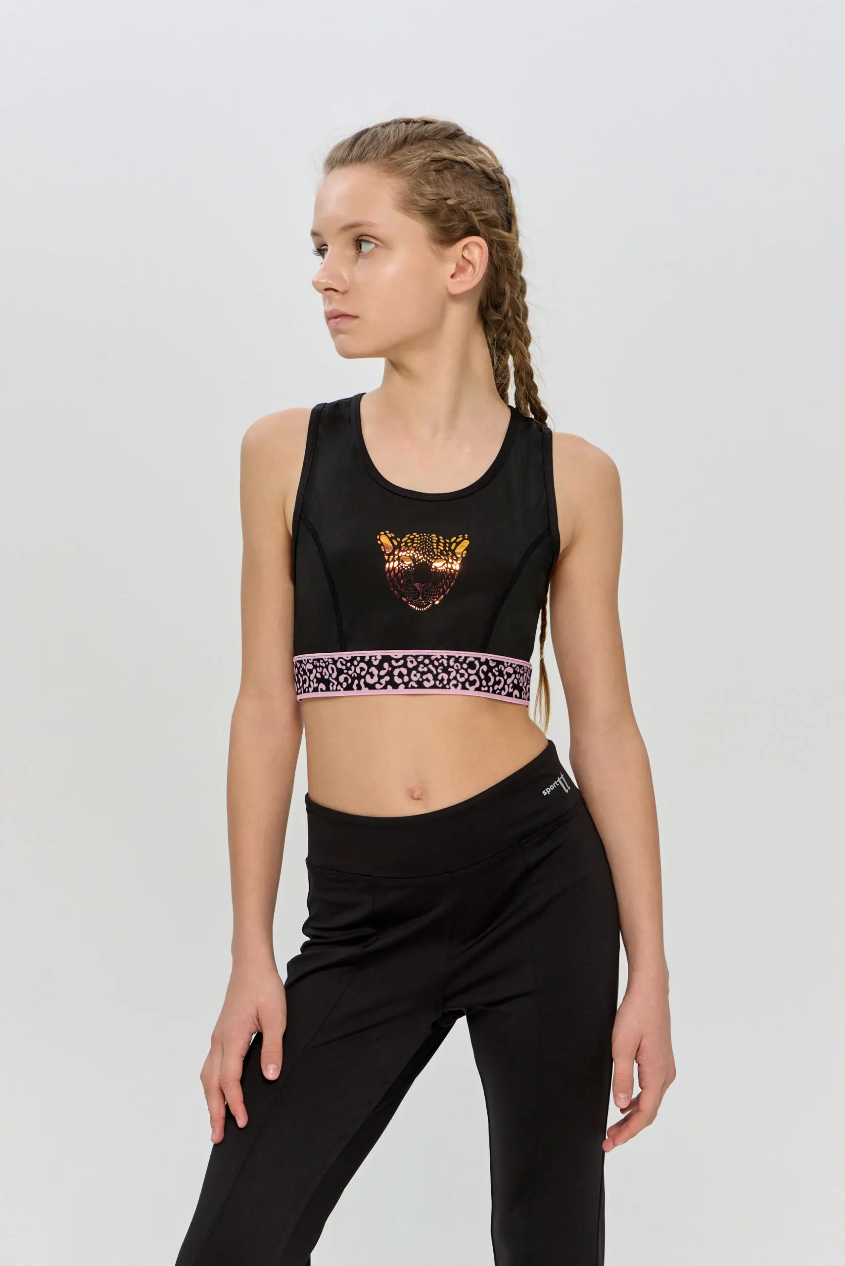 Прекрасное дополнение гардероба юной спортсменки − укороченный топ для девочки с трендовым анималистичным принтом сочетает в себе качество и удобство. Стильная модель из бифлекса отличается высоким ... качеством изготовления, эластичная ткань хорошо тянется, обеспечивая ребенку комфорт во время тренировок. Инновационная ткань с технологией CH Dry, отводящей влагу, неприхотлива в уходе.