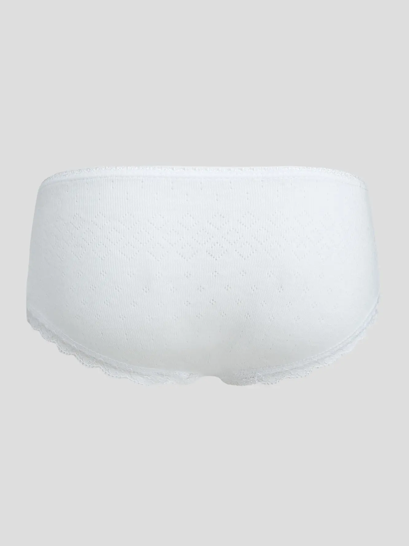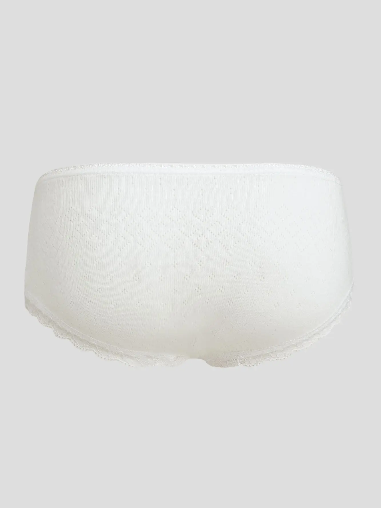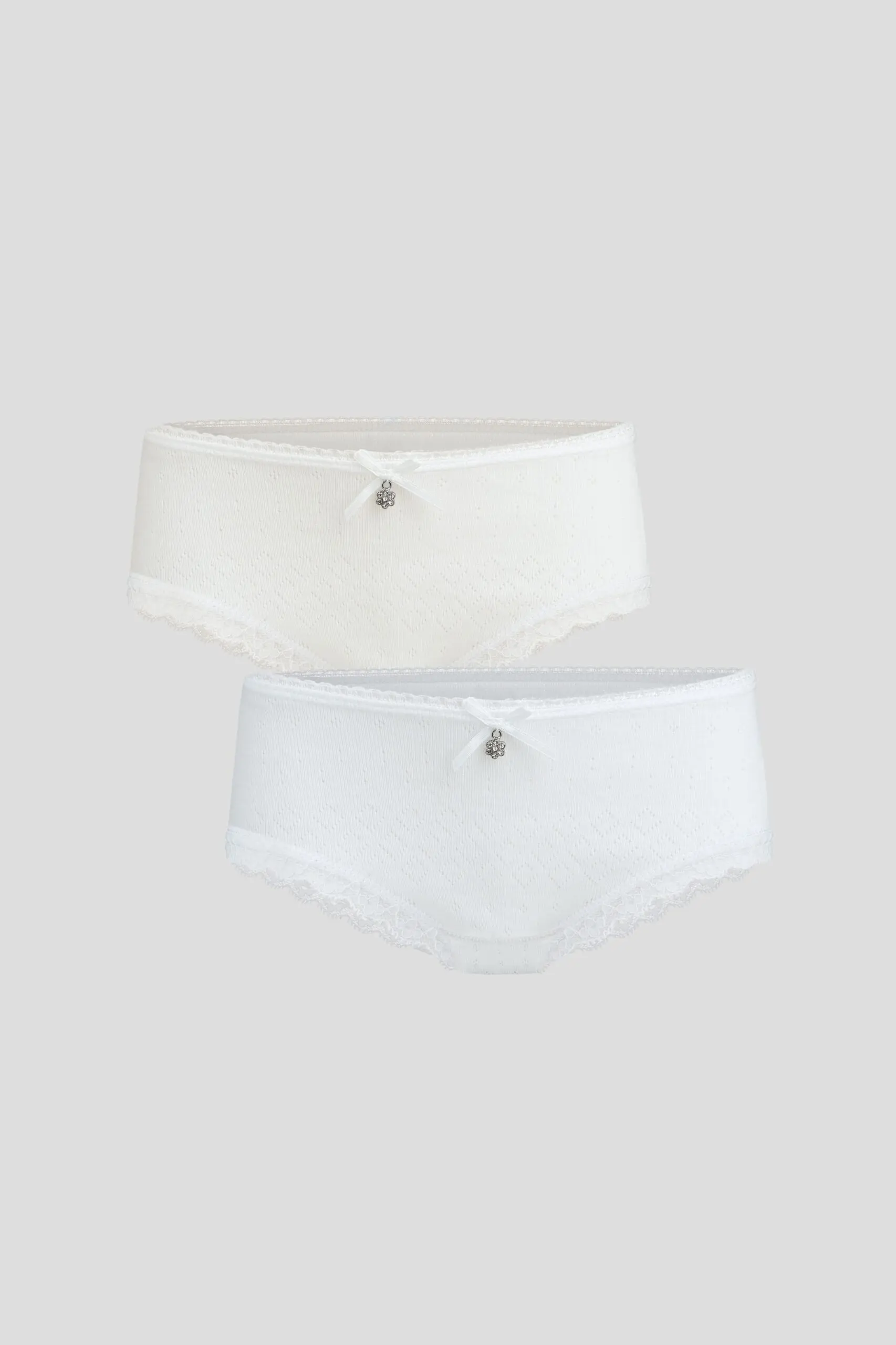 Комплект ажурных трусиков для девочки комфортной посадки с широким бочком, оригинальной отделкой кружевом и бантиком. В комплекте предлагаются модели двух цветов: а) экрю, б) белый.